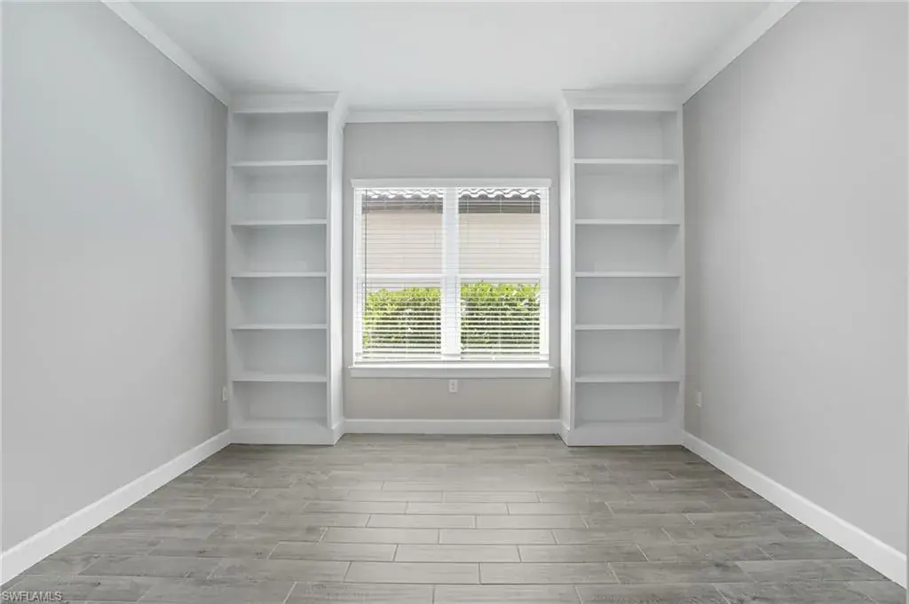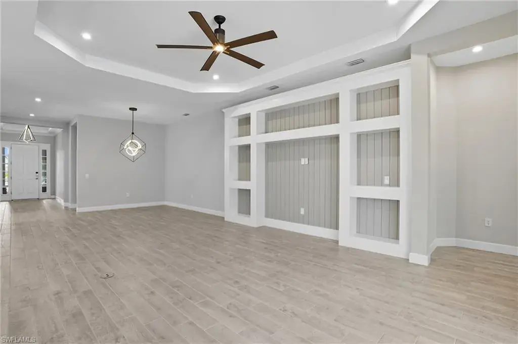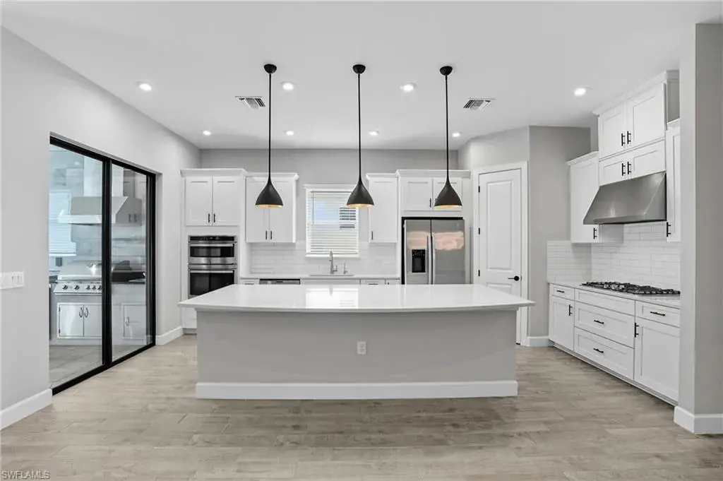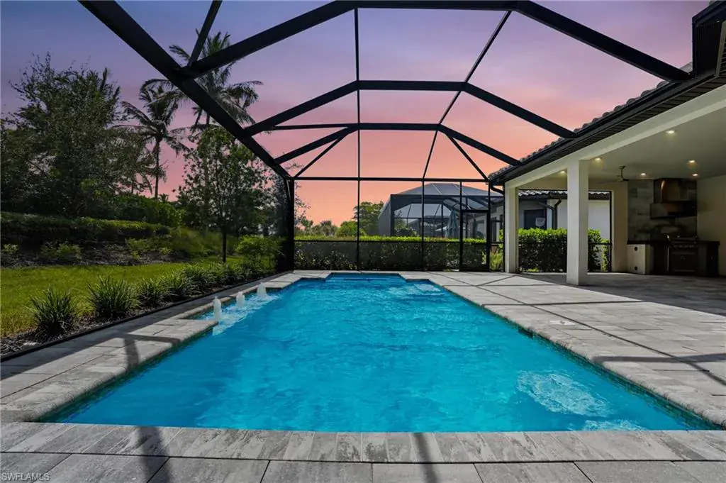 Built in 2022, this barely lived-in, 3+den/3 bath Lazio floorplan home blends thoughtful upgrades with timeless style. Nestled on a private cul-de-sac with sought-after southeastern exposure, the property is designed for both relaxed living and elegant entertaining. Inside you’ll find custom light fixtures and fans throughout, beautiful porcelain tile in the main areas, complemented by custom millwork in every room of the house including crown molding, custom shelving and closet systems in all bedrooms, custom built-ins in the den & family room, tray ceilings and 8ft interior doors throughout the home. The chef’s kitchen is as functional as it is beautiful, featuring quartz countertops, custom plumbing fixtures, upgraded GE appliances with gas cooktop, 42” upper cabinets, reverse osmosis system and a walk-in pantry with custom shelving. The primary suite is designed for relaxation with large custom closets, dual vanities, and a spa-inspired bath boasting dual shower heads and a frameless glass shower. Even the expansive laundry room is elevated with custom cabinetry, a sink and tiled walls, while the extended lanai offers a retreat of its own with a picture-framed screen, pool & spa with upgraded tile, lights and bubblers and a full outdoor kitchen—complete with sink, beverage cooler, integrated built-in grill with hooded vent, and granite countertops. Additional features include upgraded 10 ft. ceilings, generator hook-up, bay windows in guest and primary suites, a tankless water heater, a two and a half car garage (room for the golf cart!) with epoxy floors, and new landscaping on a 150 foot deep lot —— deeper than the new construction offerings in the community. Every detail of this home was carefully chosen to enhance style, comfort, and convenience. Esplanade by the Islands is fast becoming the pinnacle of resort-style living in Naples, with its full amenity campus including resort pool, full service spa, fitness center, Toasted Cafe & Bahama Bar, Pickleball, Tennis & Bocce courts, Nature Trails and so much more. Conveniently located near downtown Naples and Marco Island, don’t miss your chance to make this home as well as this lifestyle yours!