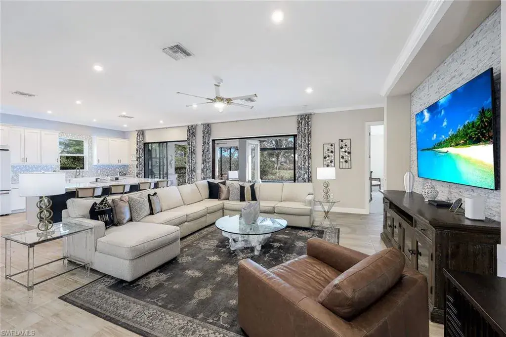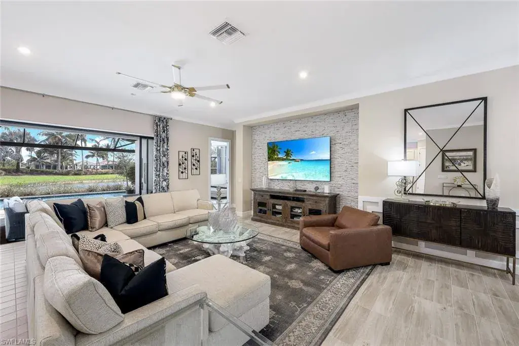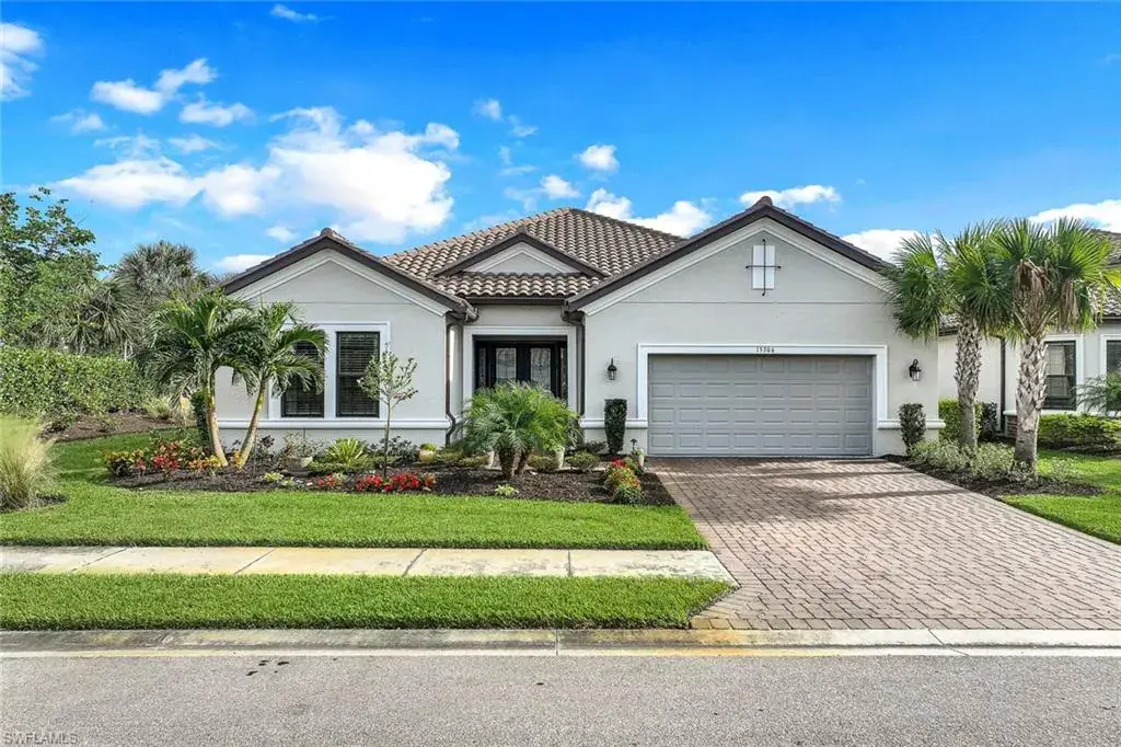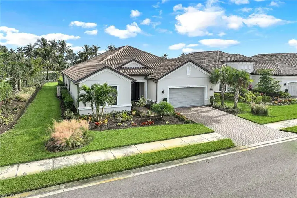 Experience the height of luxury in this custom-designed, 4-bedroom + den, 3-bath residence in Esplanade by the Islands. Perfectly positioned on a coveted corner lot this fabulous home features a lakeview with no homes across the lake offering a rare and appealing sense of privacy and unobstructed views. Crafted with an eye for elegance, this Pallazio model home blends sophisticated design elements with exceptional functionality. The interior welcomes you with high ceilings, crown molding, designer wallpaper, and custom wood trim, all illuminated by exquisite Kichler lighting and framed with custom draperies. A dedicated home office with custom-built cabinetry provides an inspiring space for productivity. The gourmet kitchen is a chef’s dream, featuring a double oven with griddle, natural gas, and warm under-cabinet lighting. A custom pantry ensures ample storage for all culinary needs, making this kitchen as functional as it is beautiful. Retreat to the luxurious primary suite, a true sanctuary with custom built-in closets designed for seamless organization. The spacious, spa-like primary bath invites relaxation with premium fixtures, elegant finishes, and a tranquil ambiance that brings everyday luxury to your routine. Step outdoors to the expansive lanai, perfectly oriented to the east to capture peaceful lake views with each sunrise. This inviting space boasts a full outdoor kitchen, a heated custom pool, and spa, creating an ideal setting for both morning coffee and evening gatherings under the stars. Living in Esplanade by the Islands means enjoying a resort-style lifestyle, complete with a full-service spa, a sparkling resort pool, on-site dining, and an array of recreational amenities. This is a rare opportunity to own a residence where every detail has been crafted for an elevated living experience in one of Naples’ most desirable communities. Located in a No Flood zone, LOMC available, prewired for Vitex alarm system, Epoxy garage floor.