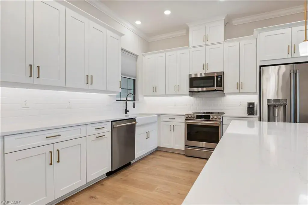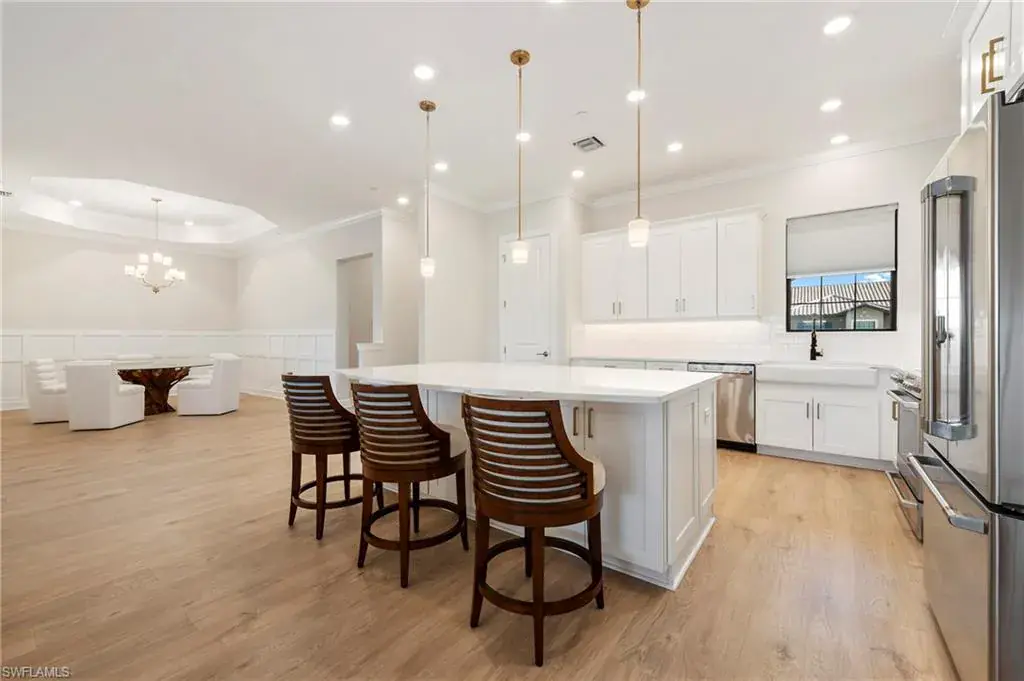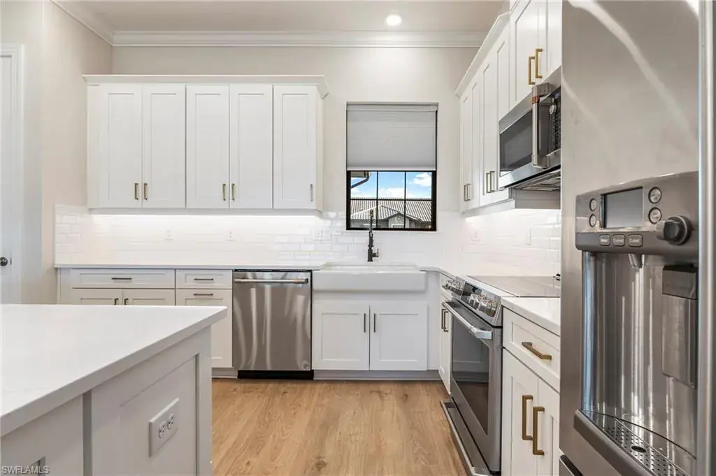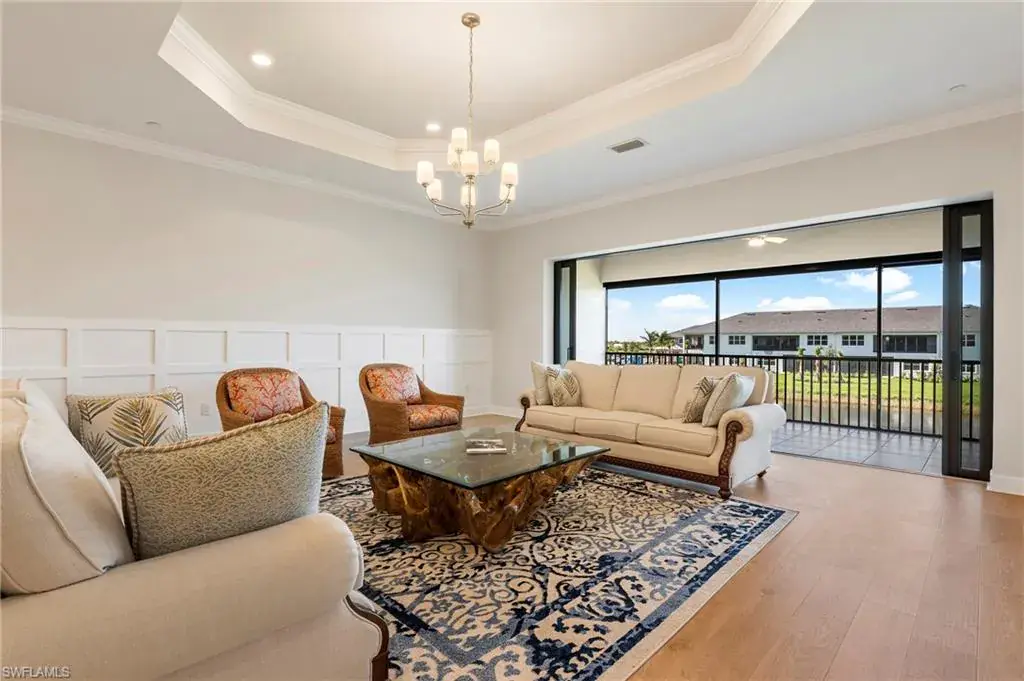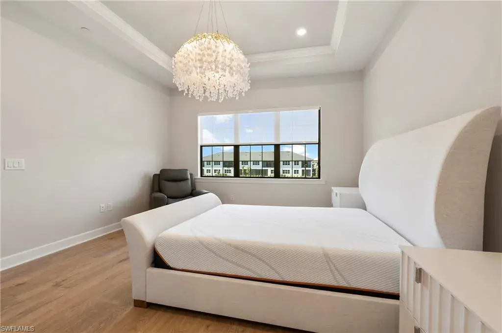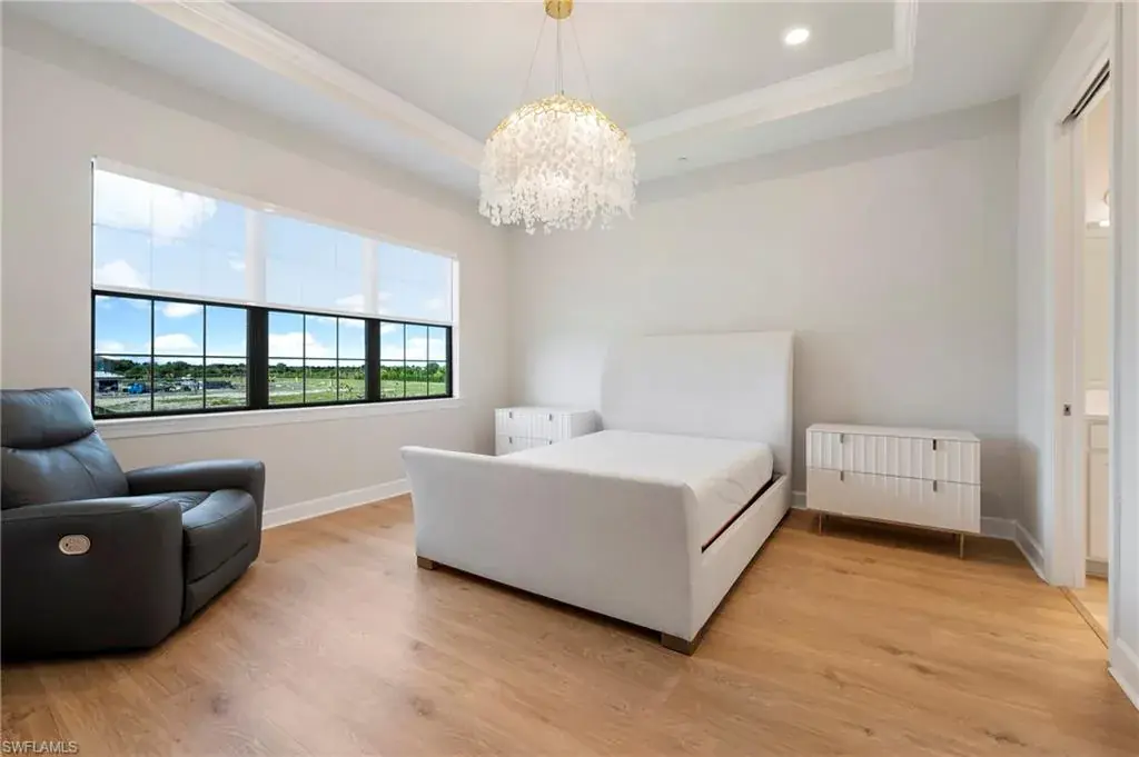 Welcome to luxury living at Esplanade by the Islands in beautiful Naples, Florida. This stunning, second-floor Bellissimo floorplan coach home offers 2,343 sq. ft. of refined living space, 600+ sqft of outdoor private lanai space, featuring 3 spacious bedrooms, 3 bathrooms, and a sun-drenched lanai with a wide, serene water view—better than what’s currently available brand-new. Sale includes custom high-end chandeliers and Tommy Bahama brand furnishings. This home is heavily upgraded, with over $100,000 in premium finishes, including upgraded flooring, custom cabinetry, custom woodwork and high-end Café appliances. The open-concept design creates a natural flow from the expansive great room to the gourmet kitchen, which is beautifully appointed with quartz countertops, stainless steel appliances, a beverage fridge, and modern designer touches. The luxurious owner’s suite is a private retreat featuring a dual sink vanity, large walk-in shower, water closet, and spacious walk-in closet. Two additional bedrooms and bathrooms are thoughtfully placed for privacy, along with a well-equipped laundry room. Additional highlights include hurricane impact-resistant windows, a 1-car attached garage, and the peace of mind that comes with brand-new construction. Located just off US-41, Esplanade by the Islands offers the best of resort-style living just minutes from Marco Island, Gulf beaches, and vibrant downtown Naples. As a resident, you’ll enjoy access to a wide range of world-class amenities, including the Bahama Bar & Grille, Wellness Center & Day Spa (offering hair, nails, facials, and massage), multiple resort-style pools and hot tubs, a state-of-the-art Fitness Center, Tennis and Pickleball courts, dog park, and scenic walking trails. Future plans include a dedicated Culinary Arts Center, enhancing the community’s focus on food, wine, and social experiences. Lifestyle programming includes wine tastings, spa and wellness events, live concerts, and curated excursions, all designed to enrich your daily living. With very low HOA fees that cover landscaping, irrigation, pest control, water, and full access to the incredible amenities, this home offers both luxury and value. A brand-new Publix supermarket is conveniently located next door, making everyday errands effortless. Don’t miss this exceptional opportunity to own a fully upgraded, move-in-ready residence in one of Naples’ most sought-after resort communities. Discover the elevated lifestyle that awaits you at Esplanade by the Islands, located in America’s #1 place to live—Naples, Florida.