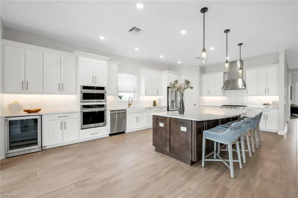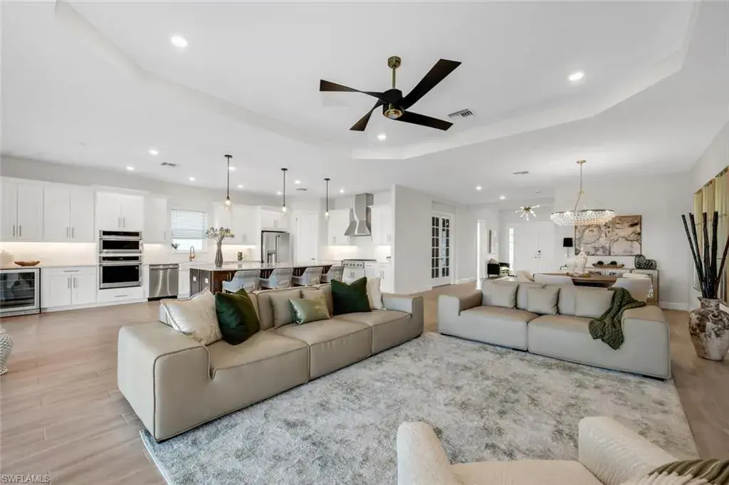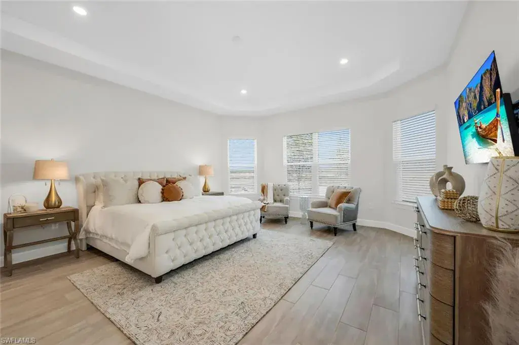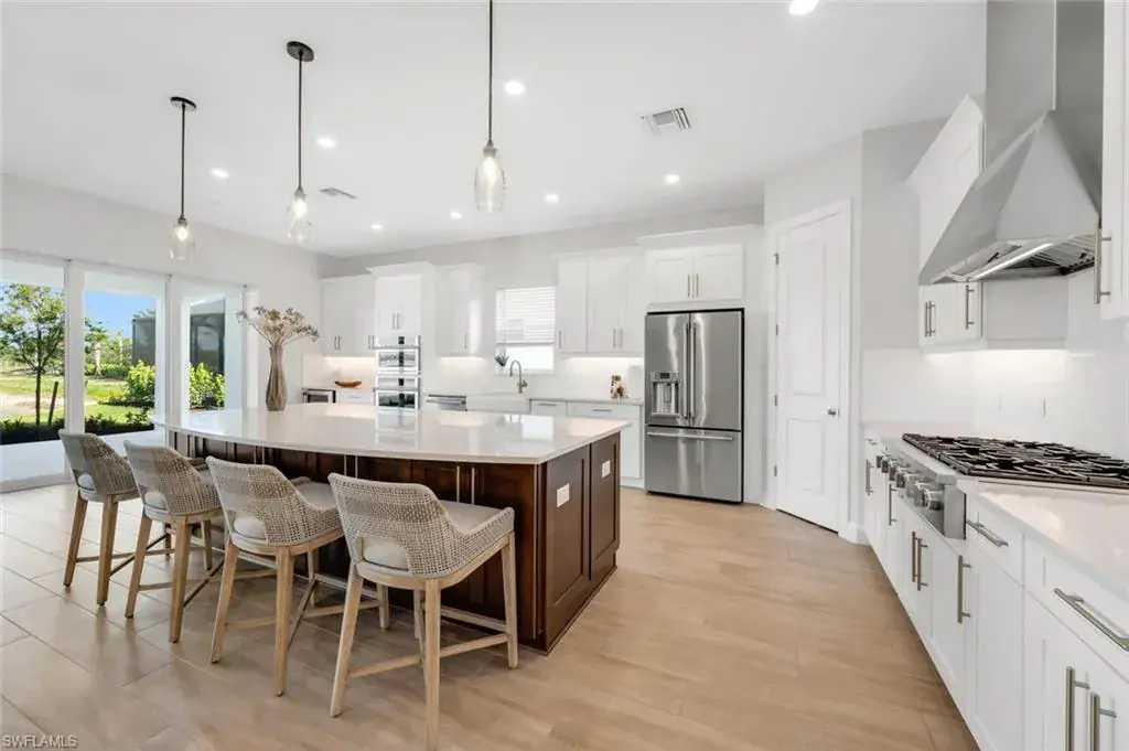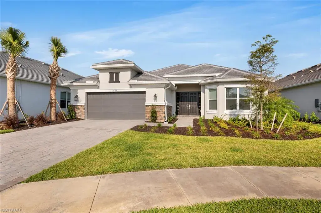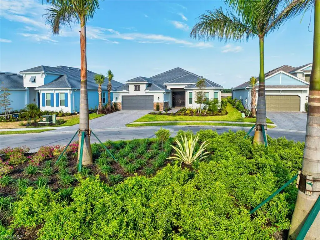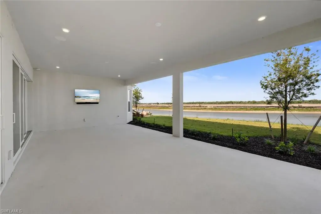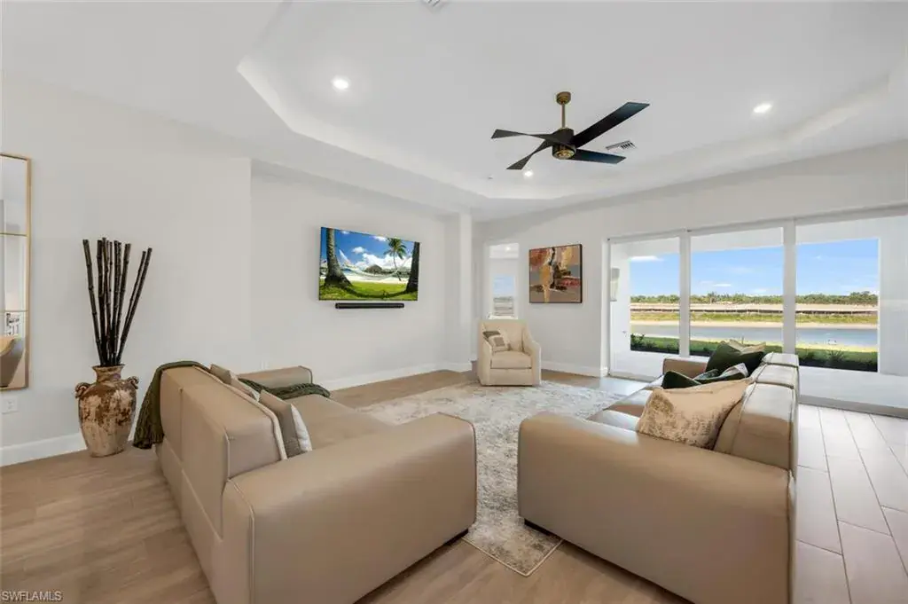 Pallazio Move-in ready and only lived in a few months. Brand new and desirable great room home offers extensive upgrades and luxurious Thoughtfully designed with timeless finishes and many custom upgrades throughout, including a spacious two car garage and beautifully designed. This three-bedroom plus den, three-bath home captures the essence of resort-style living. Enjoy peaceful water views from the expansive panoramic lanai, complete with an Extended Covered Outdoor Living For relaxing and entertaining. Go through double French doors into an elegant foyer with a tray ceiling and designer light fixture, with views out to the lake, and setting the tone for the refined interior. The Beautiful Flooring flows throughout, complemented by recessed lighting, custom ceilings, crown molding, and impact-resistant doors and windows for peace of mind. The open kitchen is a gourmet Kitchen dream, featuring white shaker-style cabinetry with under-cabinet lighting, gold hardware, quartz countertops, a tile backsplash and a large center island. Kitchen Knee wall storage cabinets and bar seating. Premium stainless appliances include a six-burner natural gas cooktop with hood, French door refrigerator/freezer, wall oven, microwave, dishwasher, and a dedicated wine and beverage refrigerator. The adjacent dining area and great room open through pocketing glass sliders to the lanai, enhancing the indoor-outdoor flow. The primary suite offers serene lake views, a tray ceiling, and double-door entry into a luxurious en-suite bath with dual quartz vanities with a makeup counter, full-width mirror, and a walk-in shower with multiple shower heads and frameless glass enclosure. One guest suite features a walk-in closet with built-in shelving and a private bath with quartz vanity and floor-to-ceiling tiled shower. A third bedroom sits beside a full guest bath with quartz vanity and a shower/tub combo, and entire guest wing can be closed off with pocket doors for added privacy. The den, entered through French doors, offers flexible space for a home office or study. The laundry room is stylish and functional, with custom tile flooring, a utility sink, countertop space, overhead cabinetry, and GE washer and dryer.   Esplanade By the Islands features 8 pickle -ball courts, 5 tennis courts, and 4 bocce ball courts.  Hair Salon, Nail Salon, Full-Service Salon. From wine tastings and culinary experiences to concerts, excursions, and a bark park, this is Resort Style Living. Just minutes from Marco Island, downtown Naples.