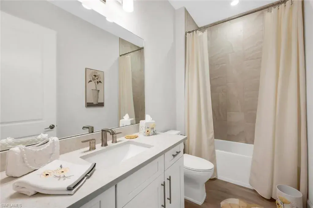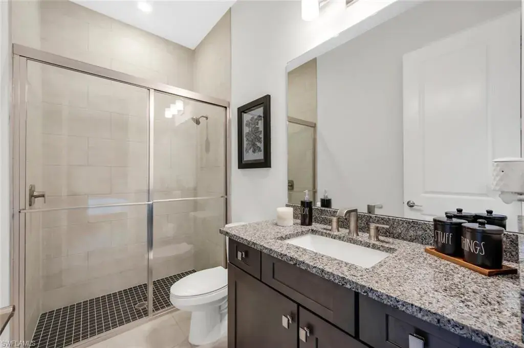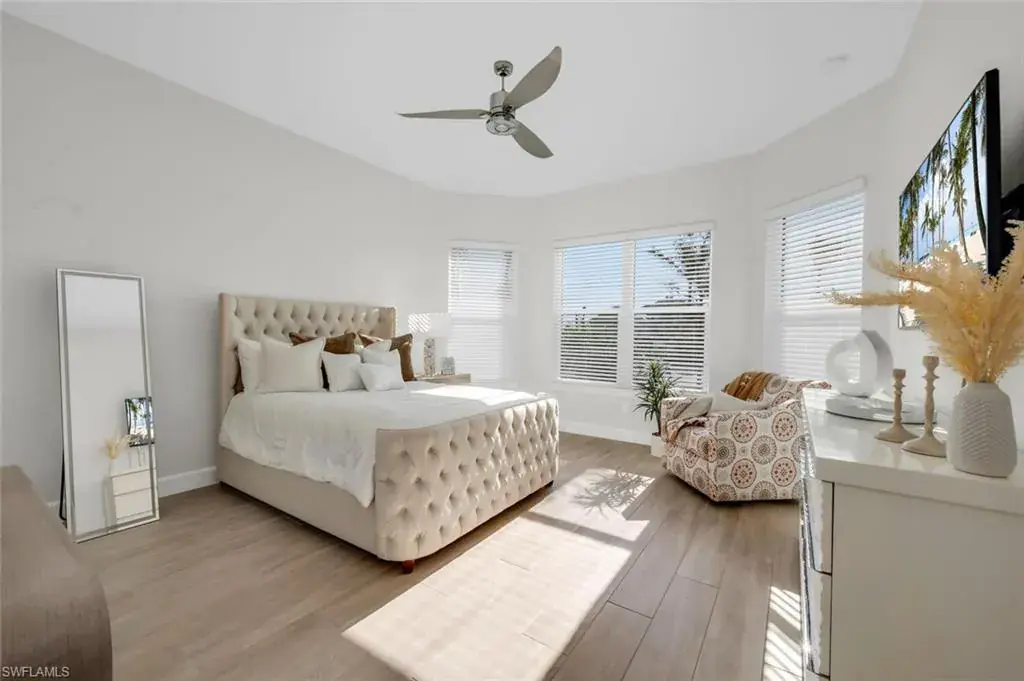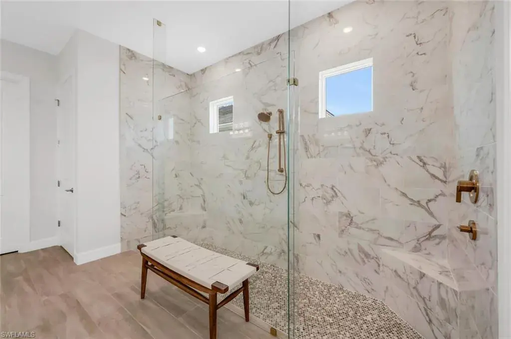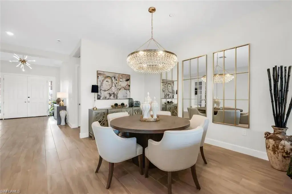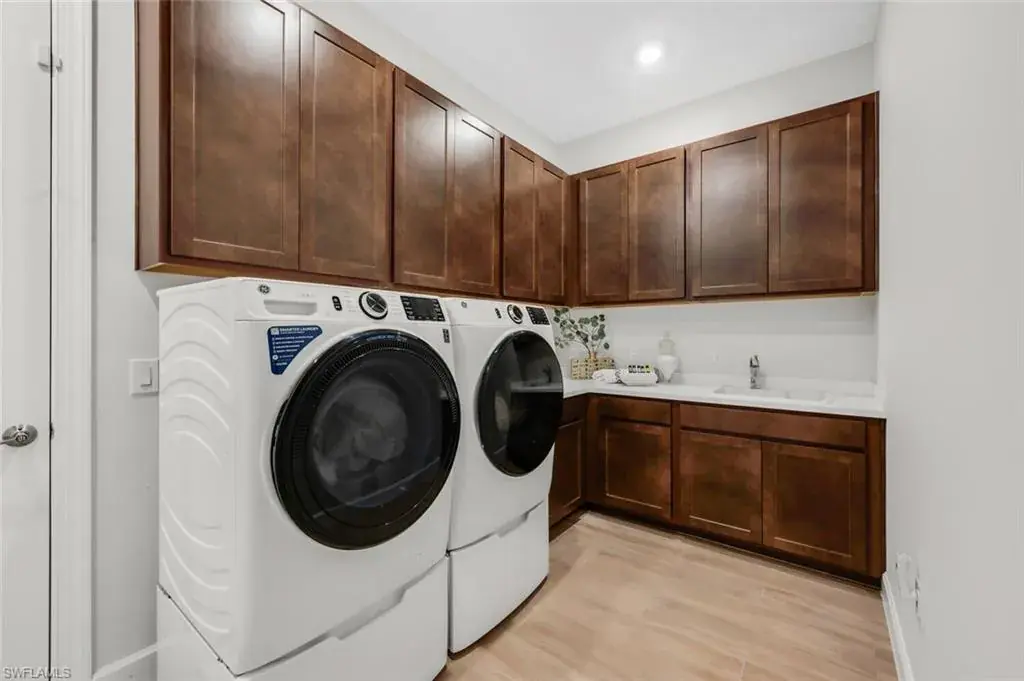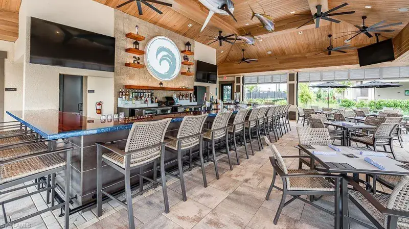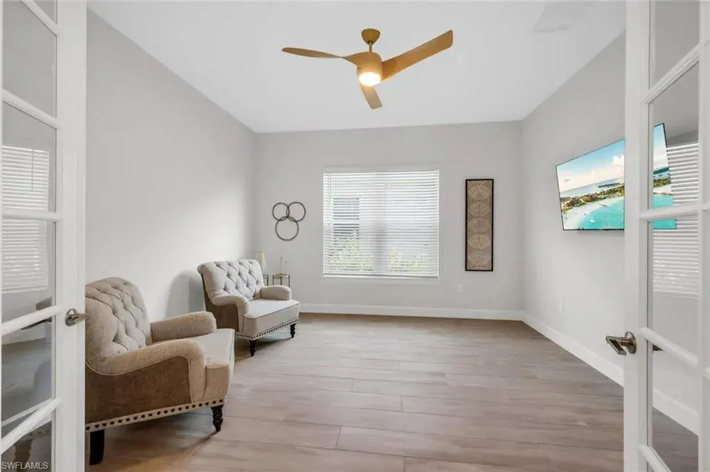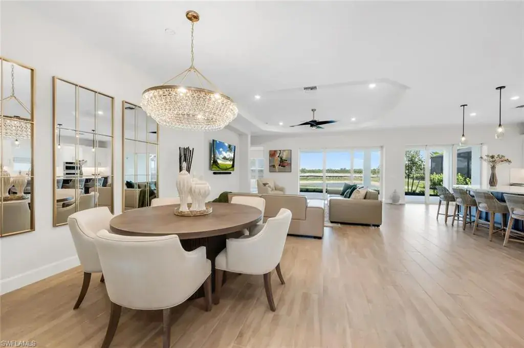 Pallazio Move-in ready and only lived in a few months. Brand new and desirable great room home offers extensive upgrades and luxurious Thoughtfully designed with timeless finishes and many custom upgrades throughout, including a spacious two car garage and beautifully designed. This three-bedroom plus den, three-bath home captures the essence of resort-style living. Enjoy peaceful water views from the expansive panoramic lanai, complete with an Extended Covered Outdoor Living For relaxing and entertaining. Go through double French doors into an elegant foyer with a tray ceiling and designer light fixture, with views out to the lake, and setting the tone for the refined interior. The Beautiful Flooring flows throughout, complemented by recessed lighting, custom ceilings, crown molding, and impact-resistant doors and windows for peace of mind. The open kitchen is a gourmet Kitchen dream, featuring white shaker-style cabinetry with under-cabinet lighting, gold hardware, quartz countertops, a tile backsplash and a large center island. Kitchen Knee wall storage cabinets and bar seating. Premium stainless appliances include a six-burner natural gas cooktop with hood, French door refrigerator/freezer, wall oven, microwave, dishwasher, and a dedicated wine and beverage refrigerator. The adjacent dining area and great room open through pocketing glass sliders to the lanai, enhancing the indoor-outdoor flow. The primary suite offers serene lake views, a tray ceiling, and double-door entry into a luxurious en-suite bath with dual quartz vanities with a makeup counter, full-width mirror, and a walk-in shower with multiple shower heads and frameless glass enclosure. One guest suite features a walk-in closet with built-in shelving and a private bath with quartz vanity and floor-to-ceiling tiled shower. A third bedroom sits beside a full guest bath with quartz vanity and a shower/tub combo, and entire guest wing can be closed off with pocket doors for added privacy. The den, entered through French doors, offers flexible space for a home office or study. The laundry room is stylish and functional, with custom tile flooring, a utility sink, countertop space, overhead cabinetry, and GE washer and dryer.   Esplanade By the Islands features 8 pickle -ball courts, 5 tennis courts, and 4 bocce ball courts.  Hair Salon, Nail Salon, Full-Service Salon. From wine tastings and culinary experiences to concerts, excursions, and a bark park, this is Resort Style Living. Just minutes from Marco Island, downtown Naples.
