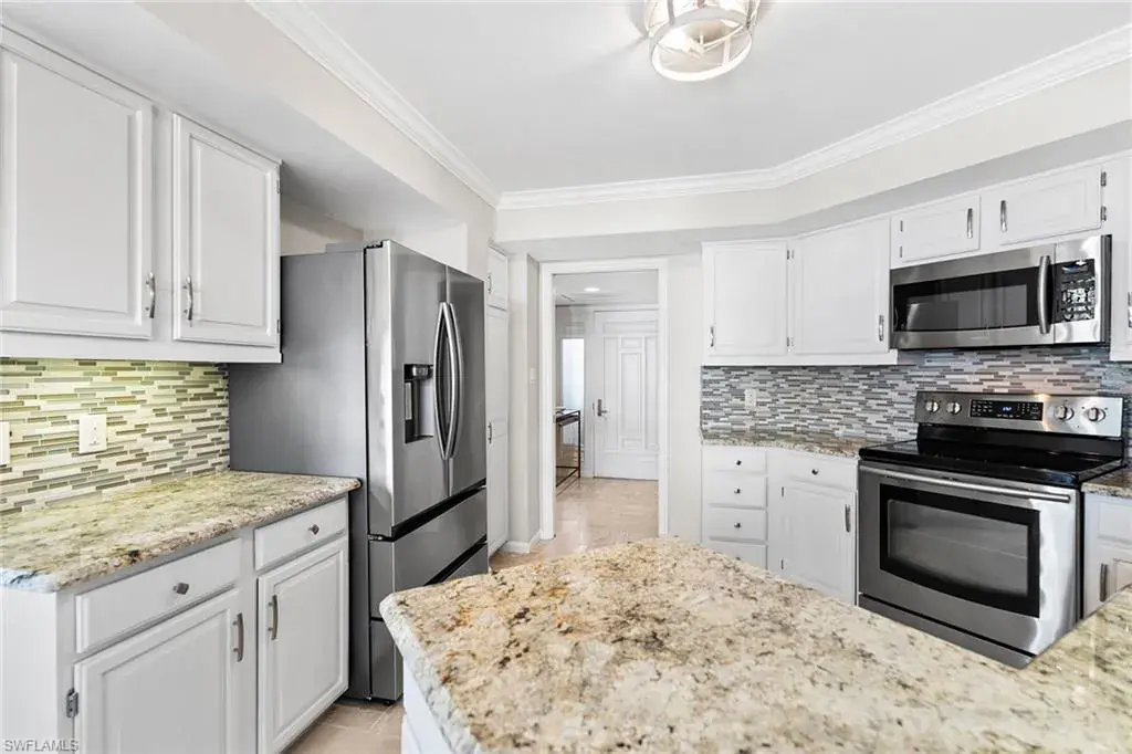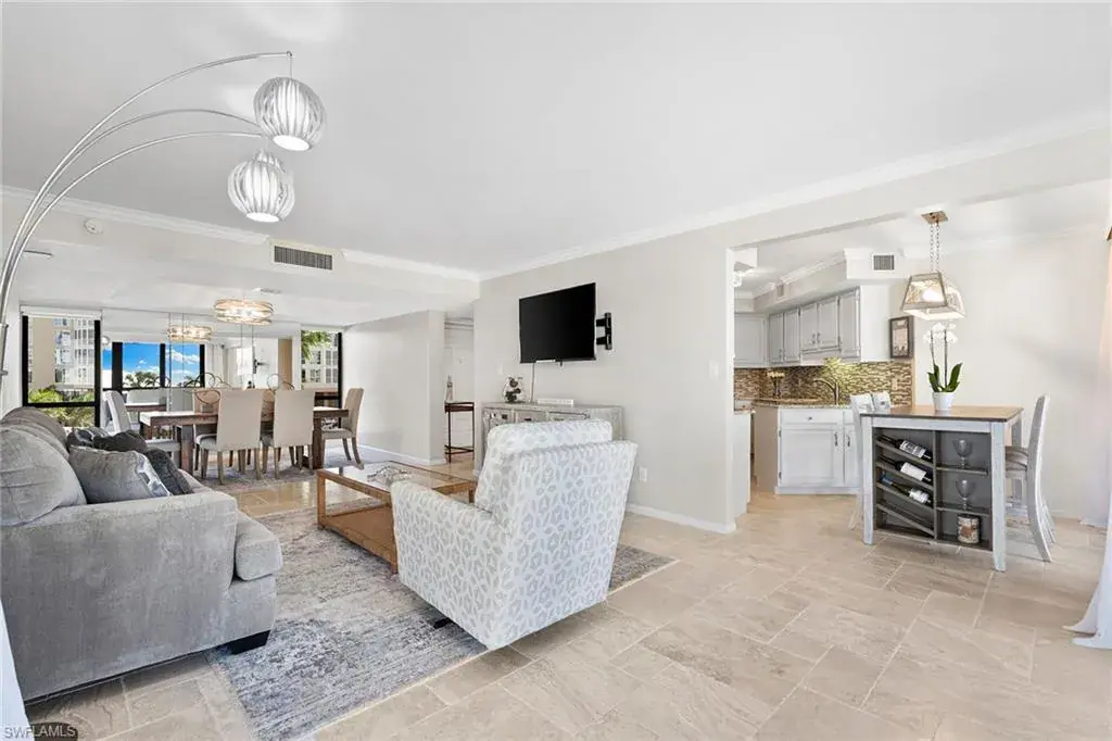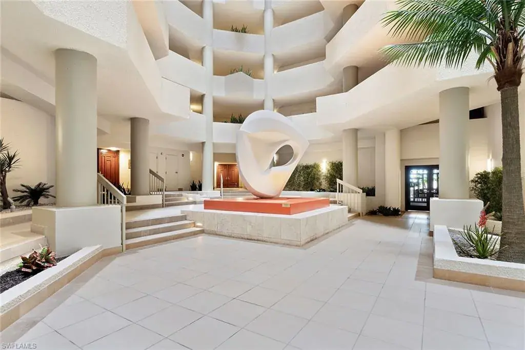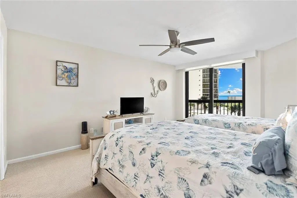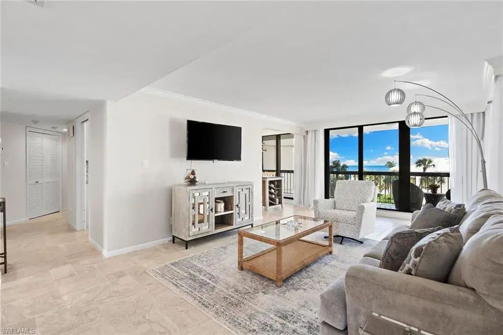Experience refined beachfront living at the Esplanade Club on Park Shore, where timeless elegance meets coastal luxury. This updated two-bedroom, two-bath residence captures serene northwest Gulf views and features travertine flooring, granite countertops, stainless-steel appliances, impact glass and custom Hunter Douglas electric blinds. The open-concept design with split bedrooms offers effortless flow for relaxing or entertaining. Enjoy resort-style amenities including a beachfront pool and spa, outdoor kitchen and fire pit, sundeck, fitness center, steam room and a redesigned social lounge with full kitchen. The rooftop sports deck offers pickleball, tennis, bocce and shuffleboard with panoramic views. Additional conveniences include 24-hour security, on-site management, EV charging, kayak and bike storage and pet-friendly living. Moments from Venetian Village and minutes to downtown Naples, this move-in-ready retreat defines sophisticated Gulf-front living.