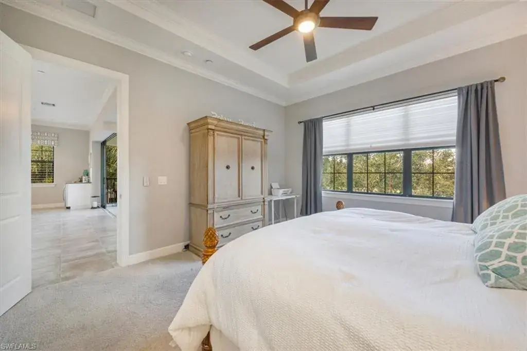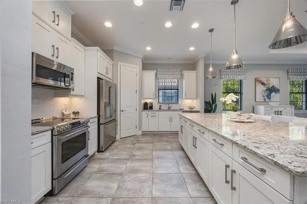 Experience the Romano VII floor plan offering 2,393 square feet of spacious coach home living with FULL GOLF membership in the sought after Esplanade community in North Naples. This end residence overlooks wide golf course views with a peaceful lake and preserve backdrop, creating a truly serene setting. The layout features an open great room with tray ceilings, a cozy fireplace, and large recessed sliders with zero corner that brings in outstanding natural light. A generous gourmet kitchen offers extensive cabinetry, quartz counters, tile backsplash, upgraded stainless steel appliances and a walk-in pantry. A separate den or flex room provides additional space for work or relaxation. The primary suite includes a large walk-in closet, dual vanities and an oversized shower. Two additional bedrooms feature expansive closets and convenient access to adjoining baths, providing comfort and flexibility for a variety of needs. Additional highlights include Hunter Douglas window treatments, a laundry room with cabinets and utility sink, crown molding throughout, and designer ceiling fans. Located in North Naples with easy access to shopping, dining and area beaches. Esplanade offers a vibrant resort lifestyle with golf, tennis, pickleball, dining, pool and clubhouse along with maintenance free living in a gated community.