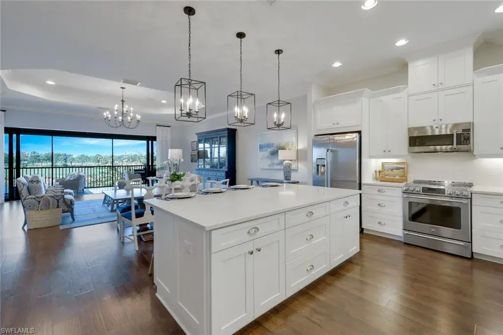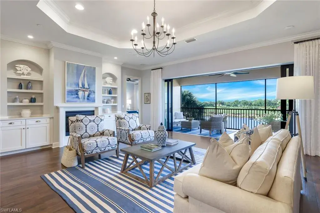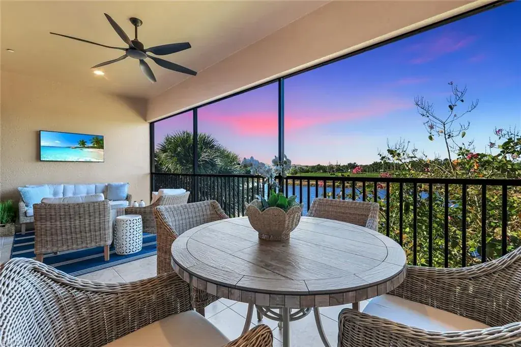 FULL GOLF MEMBERSHIP INCLUDED! Experience the ultimate in golf course living with this FURNISHED “Bellisimo” second-floor coach home, perfectly situated in the end building on a quiet cul-de-sac in Esplanade Golf & Country Club of Naples. Enjoy panoramic views of the lake and 7th green with no rooftops in sight, plus ideal southwest exposure for abundant natural light and vibrant sunsets. The open-concept great room features a 16’ pocketing sliding glass door that flows seamlessly to a 23′ x 10′ tiled and screened lanai—perfect for morning coffee or sunset cocktails with breathtaking views. Professionally designed by Calico and sold fully furnished, this home showcases Ethan Allen and Serena & Lily pieces upholstered in durable Sunbrella fabrics, exuding a relaxed coastal elegance throughout. Recent upgrades include new 2025 lanai screens, a new hot water heater, custom wood ceiling fans in the “den” and primary bedroom. The kitchen is equipped with GE Café appliances, an oversized island, and white cabinetry, complemented by designer window treatments, a motorized Hunter Douglas blind, tile and LPF flooring, and crown molding. Tech-friendly enhancements include Sonos in the living area and a WiFi booster. The garage is finished with epoxy floors and built-in storage. Hurricane impact windows and doors provide peace of mind. Esplanade is a true lifestyle community offering an 18-hole private golf course, resort pool with cabanas and Bahama Bar, tennis, pickleball, bocce, full service spa, fitness center, wine tasting room, restaurant, and more—all included in quarterly dues, which cover golf, water/sewer, building insurance, and maintenance. This is a rare opportunity to own a beautifully designed, impeccably maintained golf-front home in one of Naples’ most desirable communities.