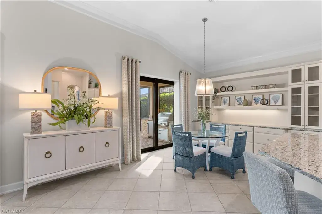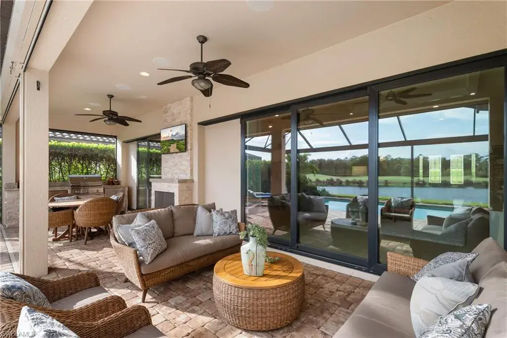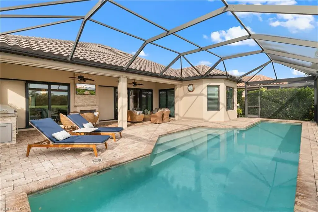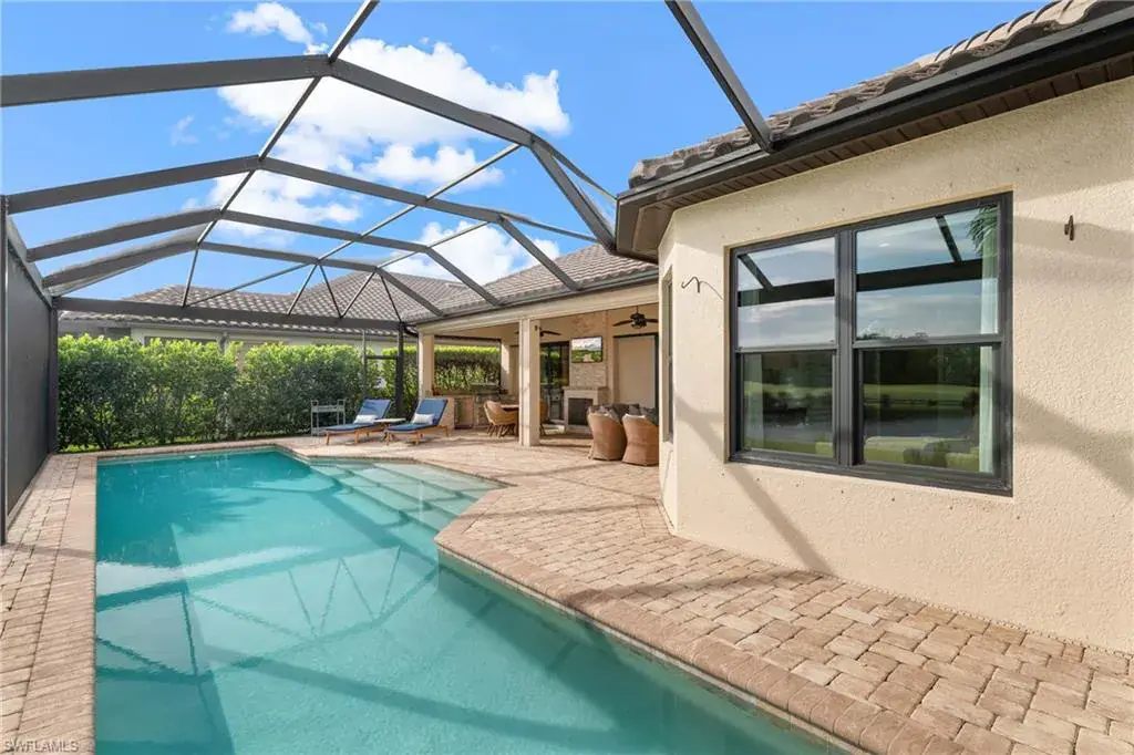 The outdoor living space is nothing short of extraordinary, showcasing an expansive saltwater gas-heated lap pool stretching 42 feet, bathed in sun throughout the day and framed by a beautiful screen enclosure. An outdoor kitchen and fireplace (installed 2 years ago) elevate the setting, ideal for entertaining or simply unwinding in complete luxury. Inside, soaring 12 foot ceilings and 8-foot doors enhance the open design, while two sets of pocket sliding glass doors create a seamless flow between indoor and outdoor living. The chef’s kitchen features an expanded layout with a gas cooktop and high-end finishes that cater to both casual dining and gourmet entertaining.