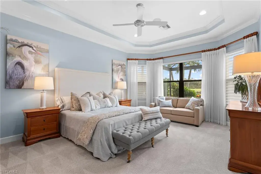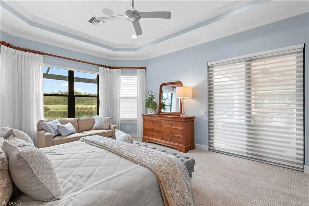 THIS HOME HAS IT ALL! STUNNING VIEWS, FULL GOLF MEMBERSHIP, and being offered FURNISHED! Incredible long lake and golf course views set the stage for this exquisite “Carrera” model home, being offered fully furnished for a seamless move-in experience. Perfectly positioned on a premium lot with unobstructed views of the 9th fairway/green & natural preserve, this residence offers unmatched privacy with no other homes in direct sight—all just a short walk to the golf practice facilities & the community’s vibrant amenity campus. Lovingly maintained by its owners, this 2483 Square Foot home features 3 bedrooms, 2.5 baths, and an extended two-car garage with ample space to accommodate both vehicles and a golf cart. Sophistication meets strength with hurricane-impact windows and doors, complemented by electric hurricane shutters on the lanai for added peace of mind.