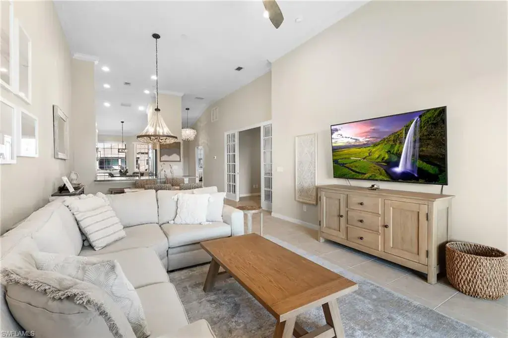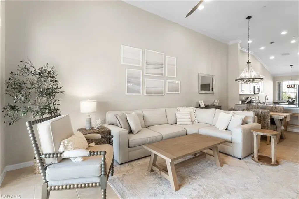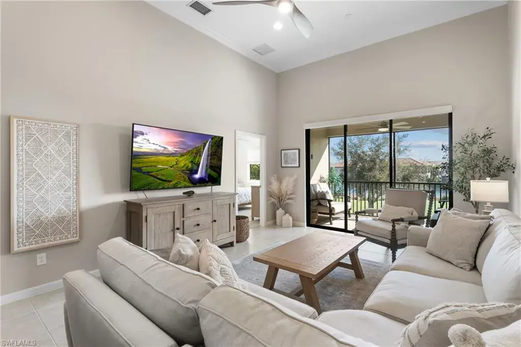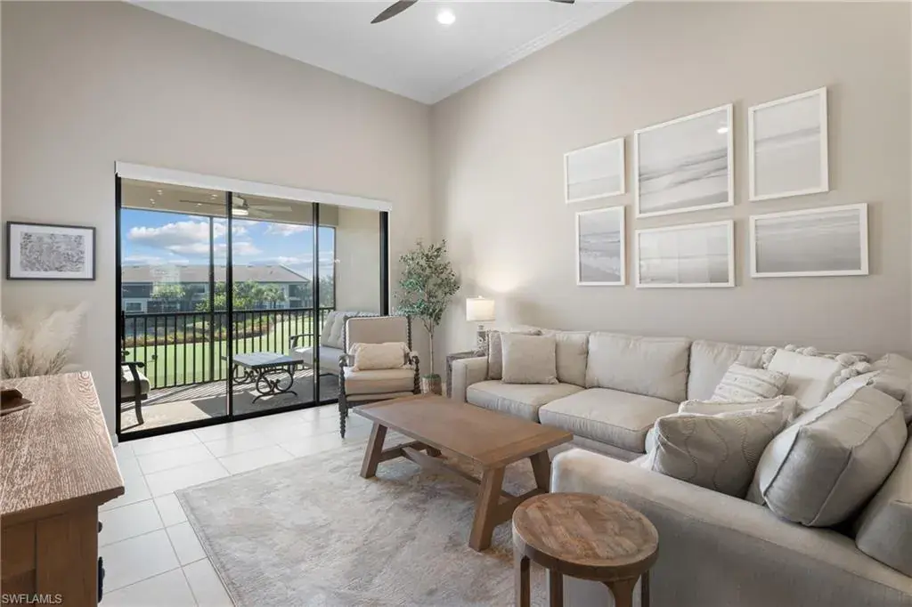 LIVE A VACATION LIFESTYLE IN ESPLANADE! This immaculate and well appointed FURNISHED 2 Bedroom+Den, 2 Bath second floor condo offers an open and airy floorplan with 14′ ceilings and sliding glass doors to the lanai overlooking the golf course and lake. This move-in ready condo has been tastefully furnished and decorated with high end brands and fixtures. A long list of special features include: tile floors throughout with carpeted bedrooms; crown molding throughout the living area/kitchen; custom glass den pocket doors with privacy curtains (for overflow guests as both the sofa and sectional are hide-a-beds); white shaker style kitchen cabinets; GE stainless steel appliances; upgraded chandelier & fans; detached 1 car garage; and more! This property is being offered FULLY FURNISHED & DECORATED. This property comes with a CLUB/SPORTS MEMBERSHIP which offers full access to all of Esplanade G&CC amenities including limited golf opportunities (2 day advanced tee times throughout the year). Esplanade is a true “Lifestyle Community” with something for everyone: resort pool complete with cabanas & poolside “Bahama Bar”; tennis; pickleball; bocce; Koquina Day Spa; fitness center; dog park; 14 miles of trails; 18 hole private golf course; restaurant, bar, wine tasting room, wine lockers, & Starbucks style cafe! Total monthly HOA/Club/Condo dues include water/sewer, building insurance, building maintenance, and access to all of Esplanade’s resort style living amenities! Add this property and Esplanade Golf & Country Club of Naples to your list today!