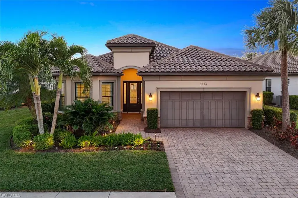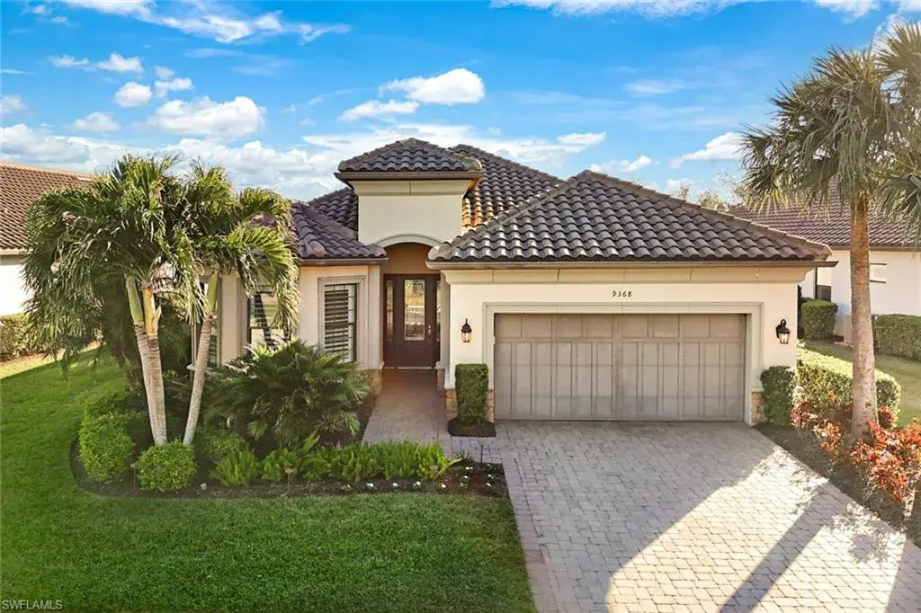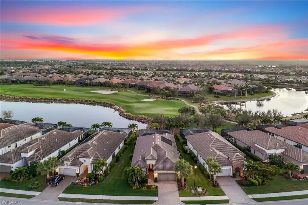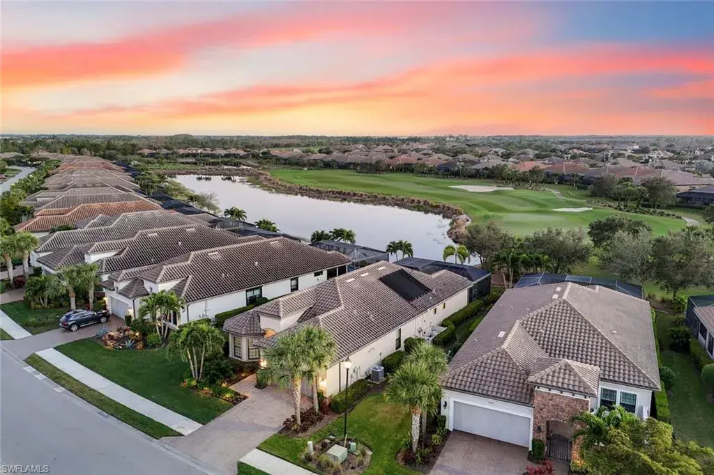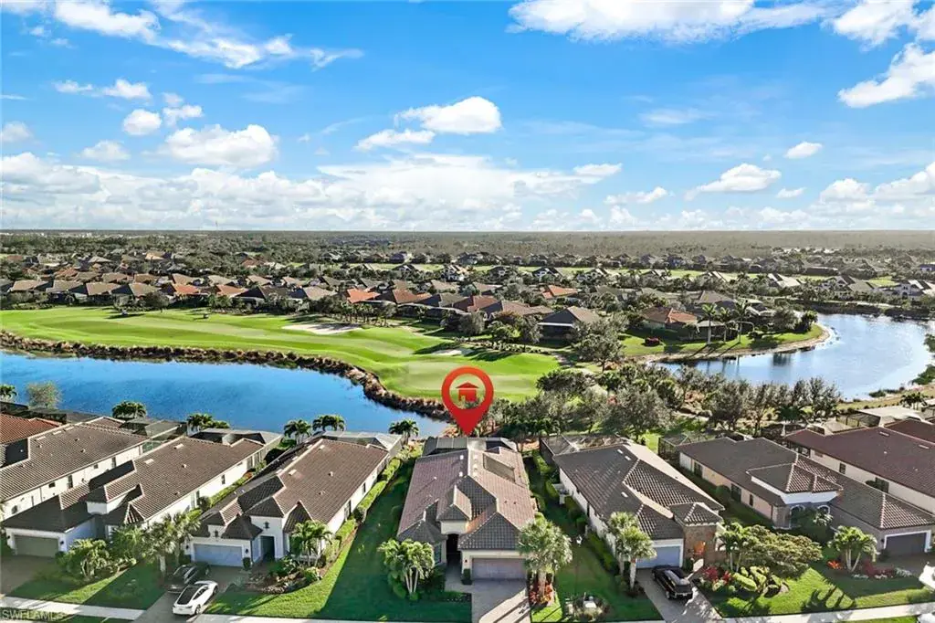 HIGHLY MOTIVATED SELLERS!!! BRING US AN OFFER! Price reduced $200K from original list of $1,695,000. GOLF MEMBERSHIP INCLUDED and fully furnished Lazio model situated on a beautiful home site with sought after Southwestern exposure views overlooking the lake and the 14th fairway. Managed by Troon Prive, the course is kept in impeccable shape including a first class pro shop. Private golf carts are allowed. The home showcases a traditional but decidedly cosmopolitan flair with an open concept living area that transitions seamlessly to a spacious outdoor living and entertaining space. Perfect for alfresco dining with friends or family. With over 2300 sq. ft. of living space it affords 3 bedrooms, 3 baths and a den/flex space with custom built-ins that could be used as an office or bedroom. Perfect for work at home. The home centers around a large extended eat in kitchen and bar area with two sets of sliding glass doors open to the lanai and a beautiful saltwater pool with sun shelf. The views are nothing less than spectacular. Inside a generous owner’s suite with custom closets and bay window speak to a peaceful retreat. Upgrades include bay windows in guest suite, custom closets, wine and beverage cooler, trey ceiling, crown molding, plantation shutters, Storm Smart electric hurricane screens, impact resistant windows, solar panels, gas pool heater, designer lighting in kitchen. Esplanade offers an 18-hole private course, a 15,000 sq. ft. clubhouse with two restaurants, bar, Starbucks like cafe, spa, hair salon and fitness center. The resort style pool sports a zero entry, lap lanes, cabanas and a poolside bar. Tennis, Pickleball, Bocce, and a dog park complete the picture of one of Naples most sought after communities.