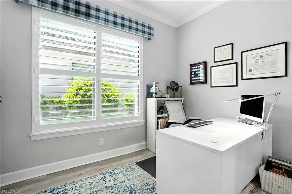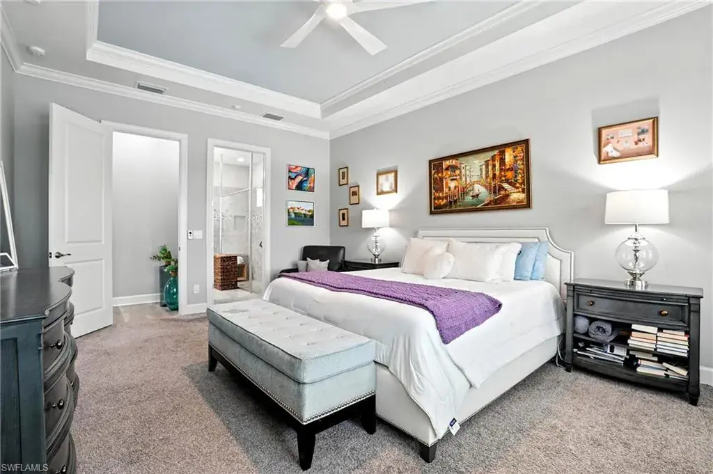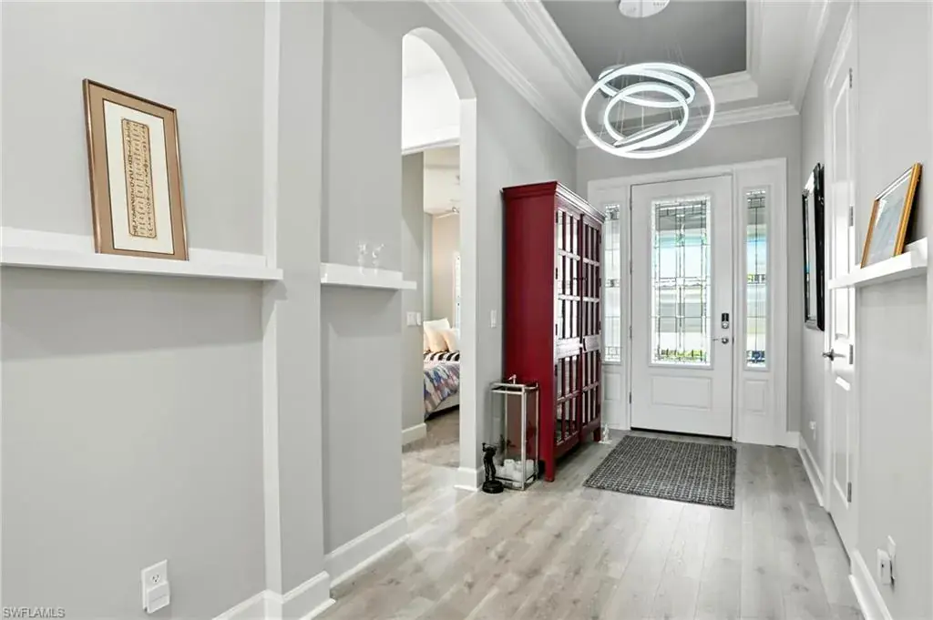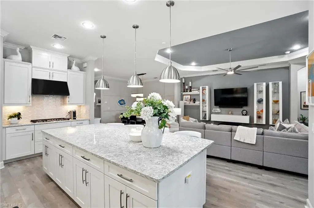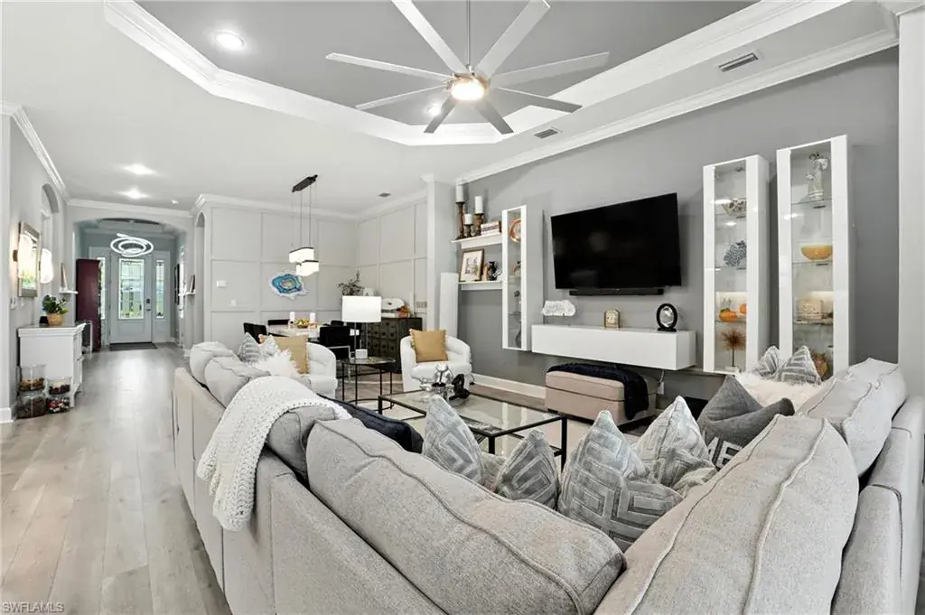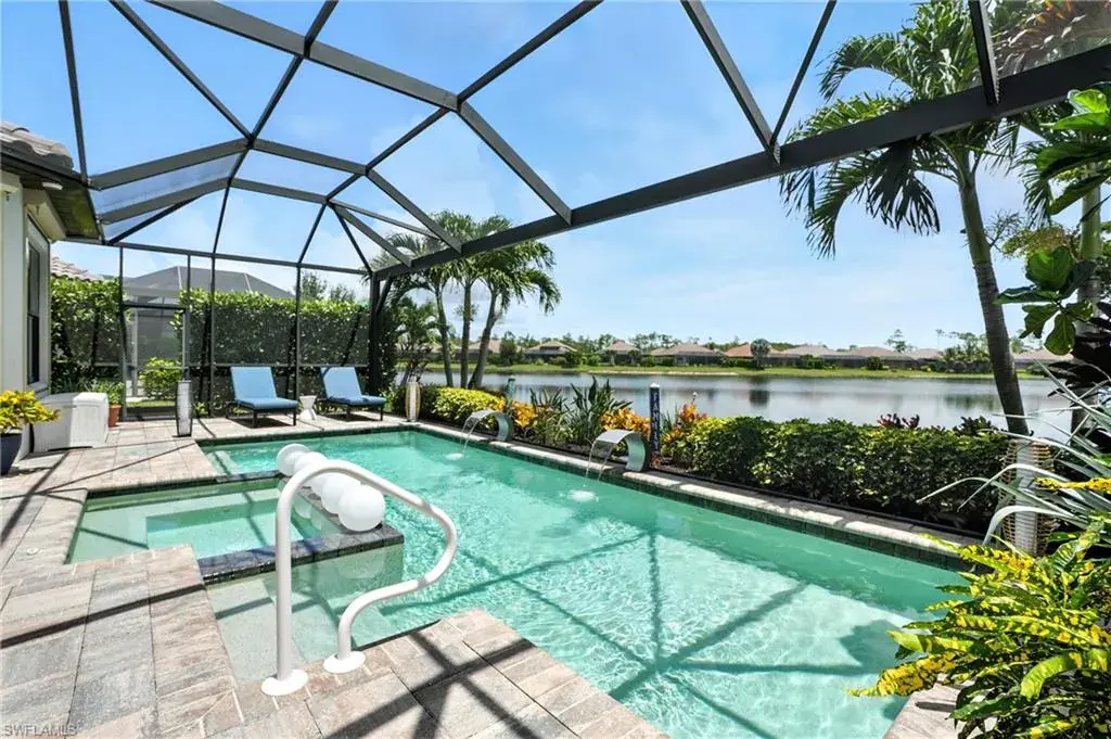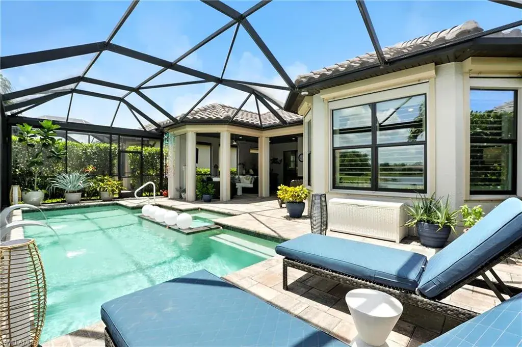 Welcome to the pinnacle of resort-style living at 9401 Terresina Dr, nestled within the prestigious Esplanade Golf and Country Club. This exquisite “Lazio” floor plan residence offers 3 bedrooms plus a versatile den, 3 full bathrooms, and a spacious 2-car epoxied floored garage, complete with an exclusive GOLF MEMBERSHIP INCLUDED. Designed for effortless elegance, the bright, open-concept layout flows seamlessly, blending sophistication with unparalleled comfort. Highlights include LVT flooring, impact glass, hurricane shutters, Storm Smart screens, a tankless water heater, custom crown molding, woodwork on ceiling outside front door, modern light fixtures, whole home generator, home freshly painted last year, plantation shutters, and tray ceilings. The gourmet kitchen boasts a natural gas stove, stainless steel appliances, a sparkling Quartz island, and ample white cabinetry. The master suite offers dual sinks, a large walk-in shower, and a custom walk-in closet. Embrace outdoor living on the oversized screened lanai with a heated gas salt water pool and spa remotely controlled with autofill, custom wood work on ceiling, outdoor summer kitchen, and a covered sitting area with a gas fireplace, all overlooking serene lake views. Located in one of Esplanade’s most sought-after enclaves, this home harmonizes luxury, functionality, and natural beauty. Enjoy an amenity-rich lifestyle, including: state of the art clubhouse, 18- hole golf course, resort pool, cabanas, culinary center, Bahama Bar, pickle ball, Càfe, walking trails, 6 tennis courts, dog park, fitness center & more! Experience the essence of modern luxury, schedule your private tour today to explore this masterpiece and embrace the unmatched lifestyle of Esplanade Golf and Country Club. Your oasis awaits!