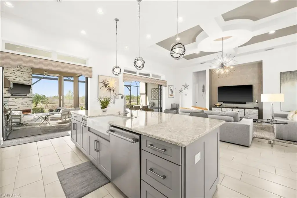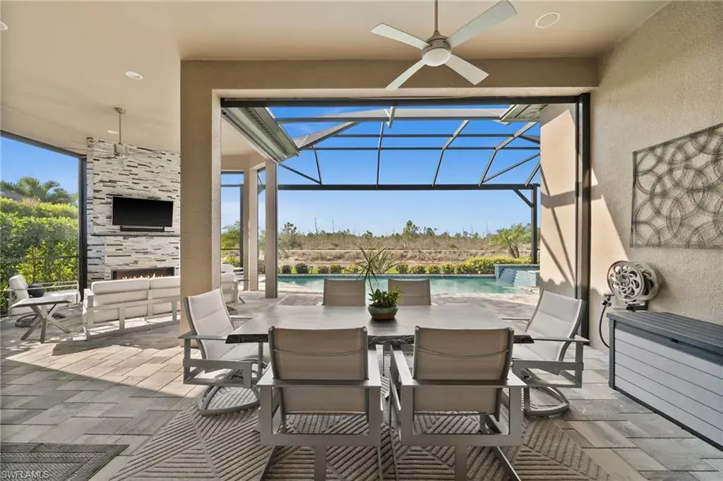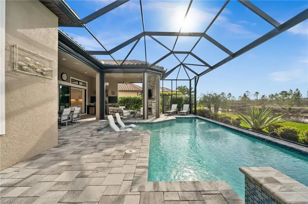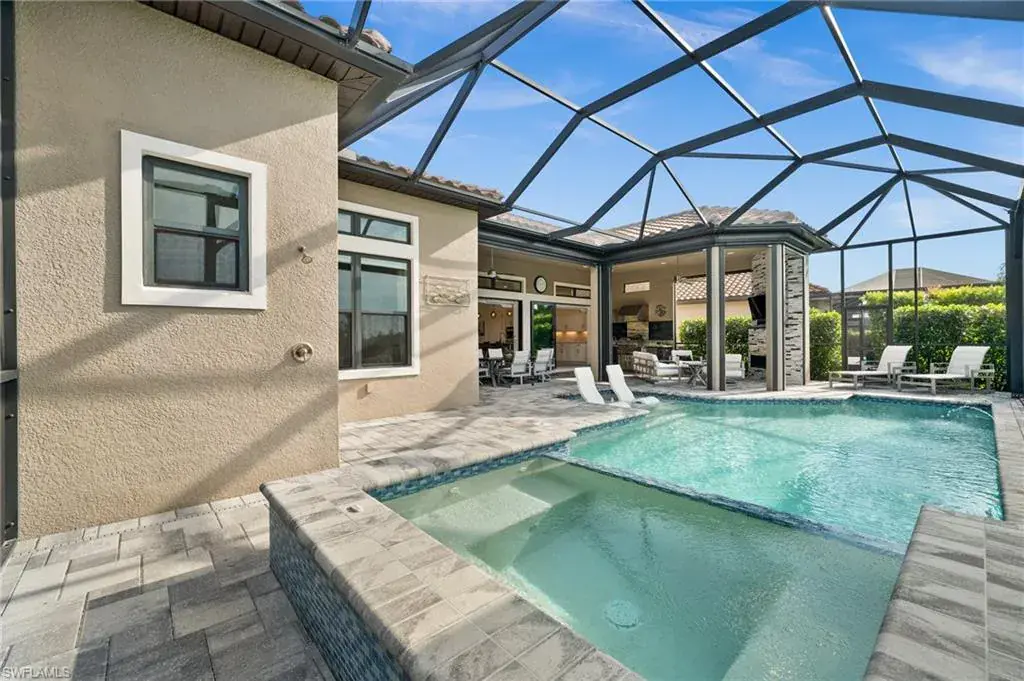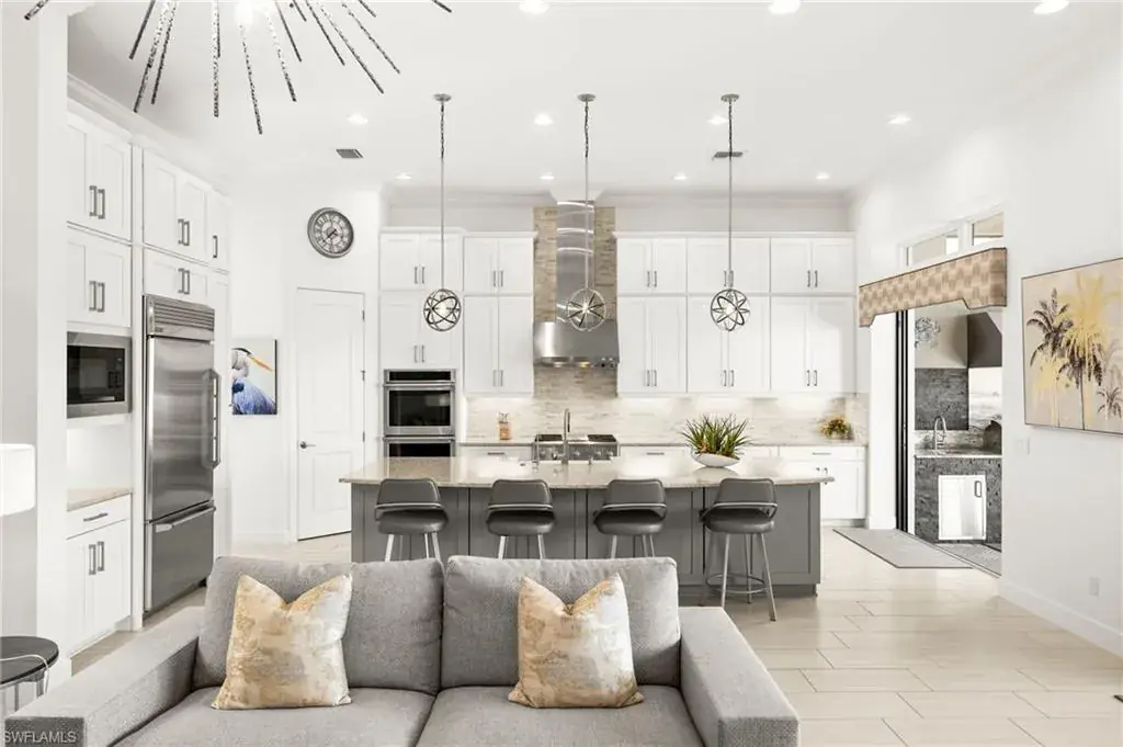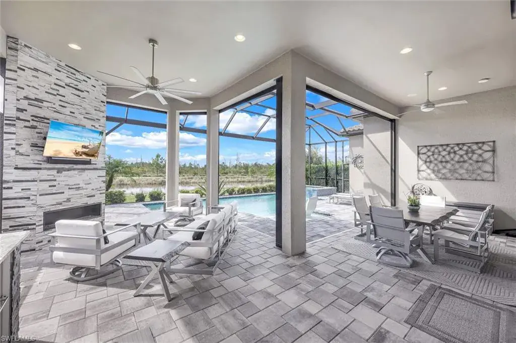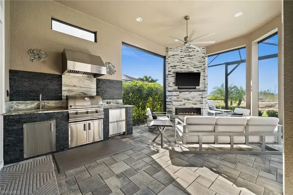 This home INCLUDES GOLF membership at Esplanade Golf & Country Club, with no waitlist or high initiation fees. Everything in this 2020-built “Francesco” is premium. All fine furnishings, art, rugs, lamps, and more are included with this home. One of the most luxuriously appointed homes in Esplanade Golf & Country Club. STRUCTURAL UPGRADES: Pocketing sliding doors (both sets), pool bath, outdoor shower, fireplace (refaced with marble in 2023), extended outdoor covered living area, 3rd stall garage, A/C in garage, hurricane impact windows & doors, electric roll-down screens on lanai + roll down screens over front entryway, all interior doors are solid core, Crystalline glass front doors, outdoor kitchen equipped with grill, sink, refrigerated drawers, & externally vented hood. Pool includes fountains, spa, and sunshelf w/ ledge loungers. SYSTEM UPGRADES: Whole house generator, water softener, upgraded thermostat, security system, doorbell camera, Sonos Surround Sound indoors & outdoors, TV in every room + outdoor living area. EXTRAS: Closets (bedrooms, broom, linen & pantry) are beautifully designed for storage & organization, owner’s bath has a cabinet tower & bank of drawers in lieu of a tub. The air-conditioned garage is equipped with ample storage for tools, luggage, holiday decor, and more. KITCHEN UPGRADES: Monogram appliances, which include a double oven, a gas cooktop, a built-in refrigerator, a third row of cabinetry + exterior under-island cabinetry added, reverse osmosis, a beverage center with upgraded cabinetry & lighting, sink, and beverage refrigerator. Additional landscaping & potted plants are watered w/ dedicated, timed irrigation to ensure they’re always thriving. Professionally designed lighting, sleek motorized Hunter-Douglas Silhouettes, custom drapery & valances, custom paint on walls & coffered ceilings, and premium wallpaper. Esplanade offers an active lifestyle with dining options, golf, a racquet sports program (including pickleball), premier sports facilities, a full salon and spa, and a vibrant social calendar. This home is the perfect fit for those who appreciate quality, details, and convenience. This turnkey home is priced to include high-end furnishings, elegant rugs, wall art, kitchenwares, lux bedding, linens, and more.  For the benefit of the buyer, a Personal Property Sales Contract will be used for the furnishings, art, rugs, lamps, decor, housewares, etc.
