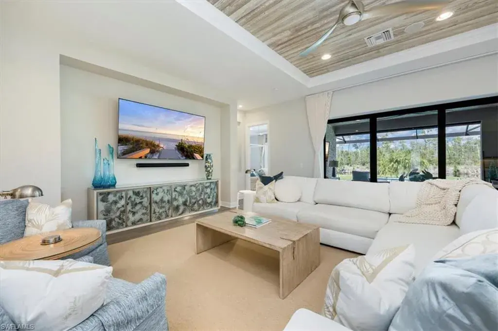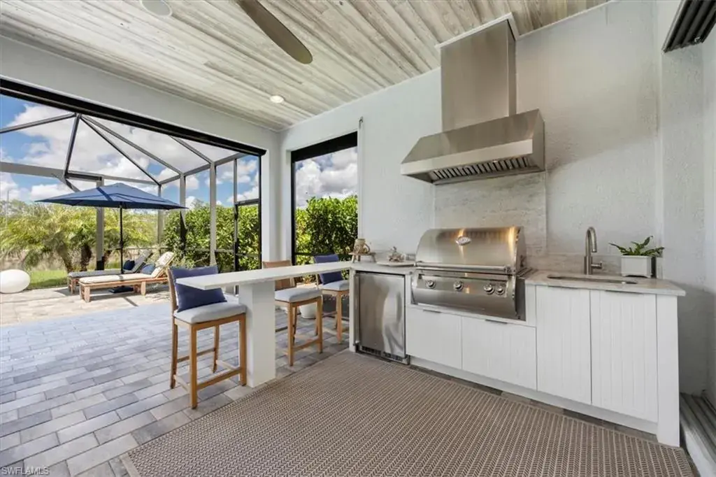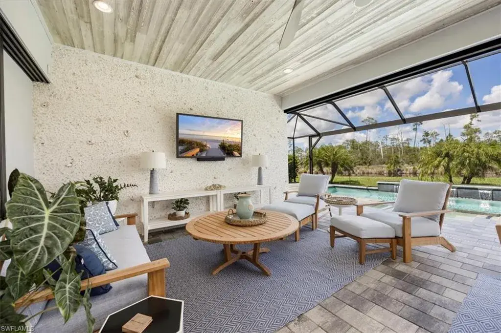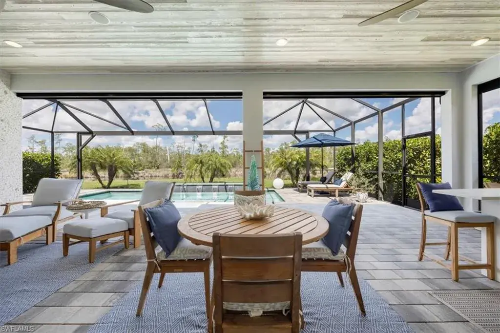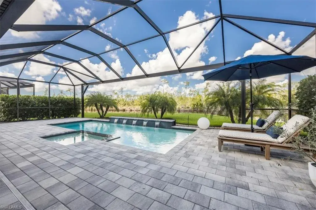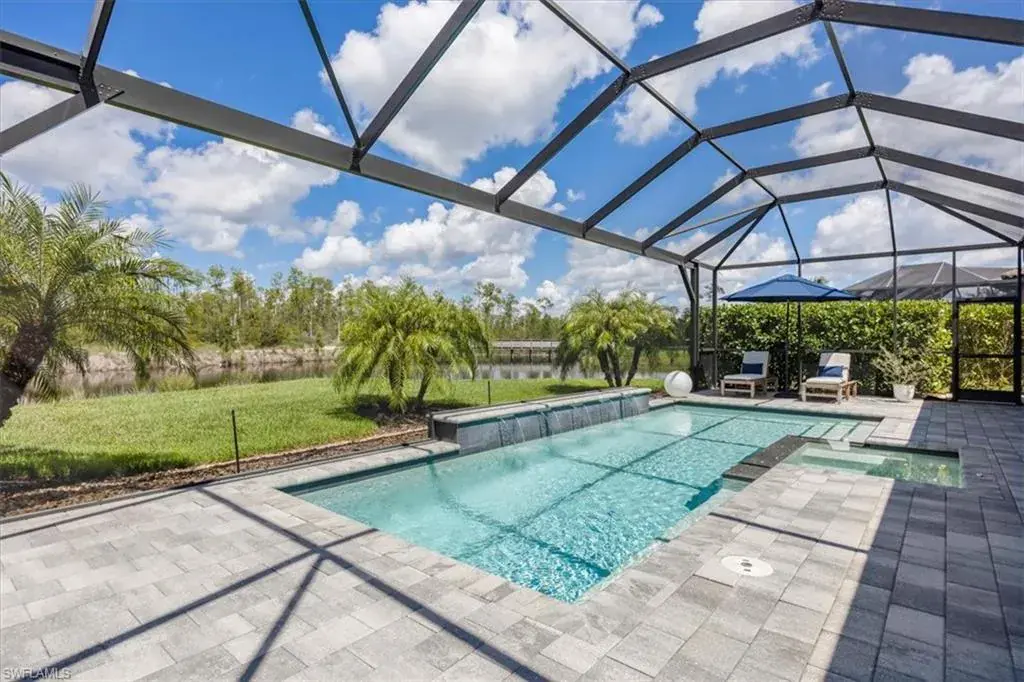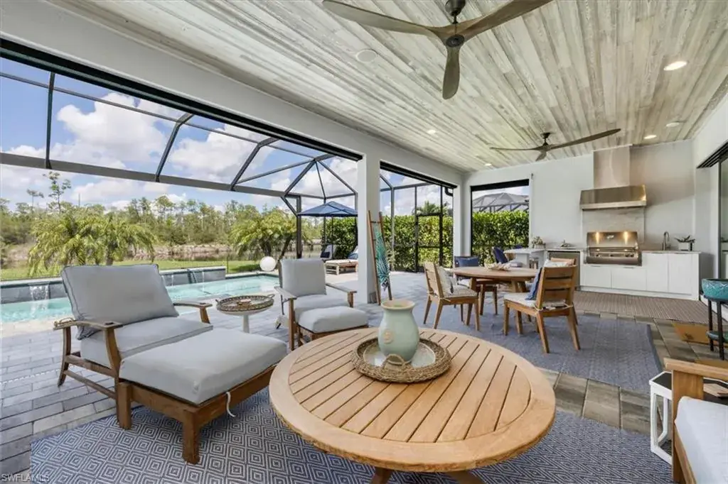This stunning Pallazzio floor plan offers over 3,000 square feet of elegant living space, complete with three bedrooms, a den, and three full baths. Designed for both comfort and sophistication, the home includes an immediate full golf membership, making it an ideal choice for those seeking a vibrant lifestyle with world-class amenities at their fingertips. Thoughtful upgrades are found throughout the residence, starting with hurricane-rated windows, sliders, and doors, a new hurricane impact front door with matching side panels, and Storm Smart motorized shutters for peace of mind. A whole-house gas generator, tankless hot water heater, and a full water filtration and reverse osmosis system ensure modern convenience and efficiency. Inside, 10-foot ceilings, 8-foot doors, and Synergy cypress wood accents in the entryway, lanai, foyer, great room, primary suite, powder room, and laundry add warmth and architectural character. The extended gourmet kitchen is a true centerpiece, featuring GE Monogram appliances, a natural gas cooktop with wall oven, wine and beverage coolers, glass display cabinetry, and under-cabinet lighting. A SONOS sound system with in-ceiling speakers, custom designer lighting, and professionally designed draperies and blinds elevate the home’s interior design. The spacious primary suite offers a walk-in closet with custom shelving, a luxurious bath with double sinks, makeup area, and a frameless glass shower, while guest suites feature their own stylishly appointed bathrooms. Step outside to a private retreat on the oversized lanai, enhanced by a feature shell wall, bar seating, and a fully equipped outdoor kitchen. The gas-heated saltwater pool and spa with waterfall features are surrounded by picture window screens, mature native landscaping, and front and rear landscape lighting, creating a serene backdrop of preserve views and glowing sunsets. Additional highlights include an extended two-car garage with epoxy flooring, built-in storage, insulation, air conditioning, and a refrigerator, as well as ceiling fans in every bedroom, the den, great room, and lanai. High-end furniture is negotiable, allowing for a seamless move-in experience. Every detail of this property has been carefully curated for luxury, comfort, and peace of mind—ideal for both entertaining and quiet enjoyment.