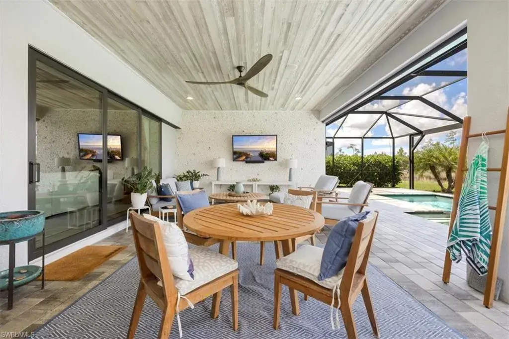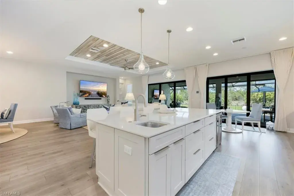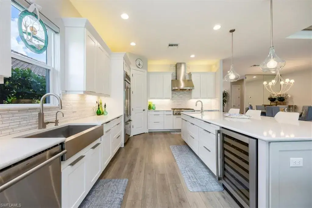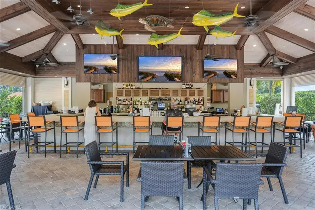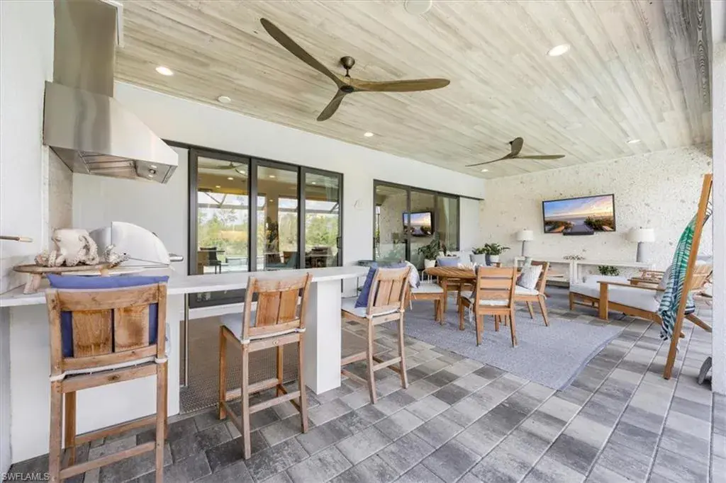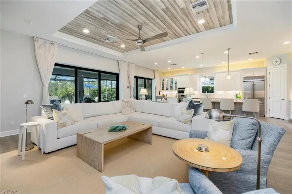 This stunning Pallazzio floor plan offers over 3,000 square feet of elegant living space, complete with three bedrooms, a den, and three full baths. Designed for both comfort and sophistication, the home includes an immediate full golf membership, making it an ideal choice for those seeking a vibrant lifestyle with world-class amenities at their fingertips. Thoughtful upgrades are found throughout the residence, starting with hurricane-rated windows, sliders, and doors, a new hurricane impact front door with matching side panels, and Storm Smart motorized shutters for peace of mind. A whole-house gas generator, tankless hot water heater, and a full water filtration and reverse osmosis system ensure modern convenience and efficiency. Inside, 10-foot ceilings, 8-foot doors, and Synergy cypress wood accents in the entryway, lanai, foyer, great room, primary suite, powder room, and laundry add warmth and architectural character. The extended gourmet kitchen is a true centerpiece, featuring GE Monogram appliances, a natural gas cooktop with wall oven, wine and beverage coolers, glass display cabinetry, and under-cabinet lighting. A SONOS sound system with in-ceiling speakers, custom designer lighting, and professionally designed draperies and blinds elevate the home’s interior design. The spacious primary suite offers a walk-in closet with custom shelving, a luxurious bath with double sinks, makeup area, and a frameless glass shower, while guest suites feature their own stylishly appointed bathrooms. Step outside to a private retreat on the oversized lanai, enhanced by a feature shell wall, bar seating, and a fully equipped outdoor kitchen. The gas-heated saltwater pool and spa with waterfall features are surrounded by picture window screens, mature native landscaping, and front and rear landscape lighting, creating a serene backdrop of preserve views and glowing sunsets. Additional highlights include an extended two-car garage with epoxy flooring, built-in storage, insulation, air conditioning, and a refrigerator, as well as ceiling fans in every bedroom, the den, great room, and lanai. High-end furniture is negotiable, allowing for a seamless move-in experience. Every detail of this property has been carefully curated for luxury, comfort, and peace of mind—ideal for both entertaining and quiet enjoyment.