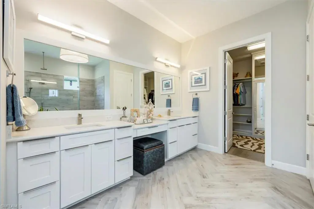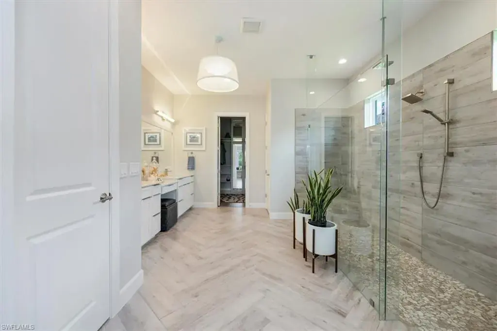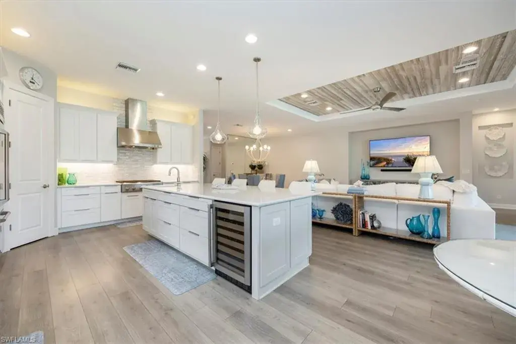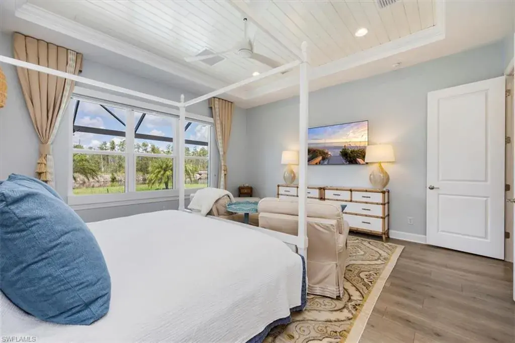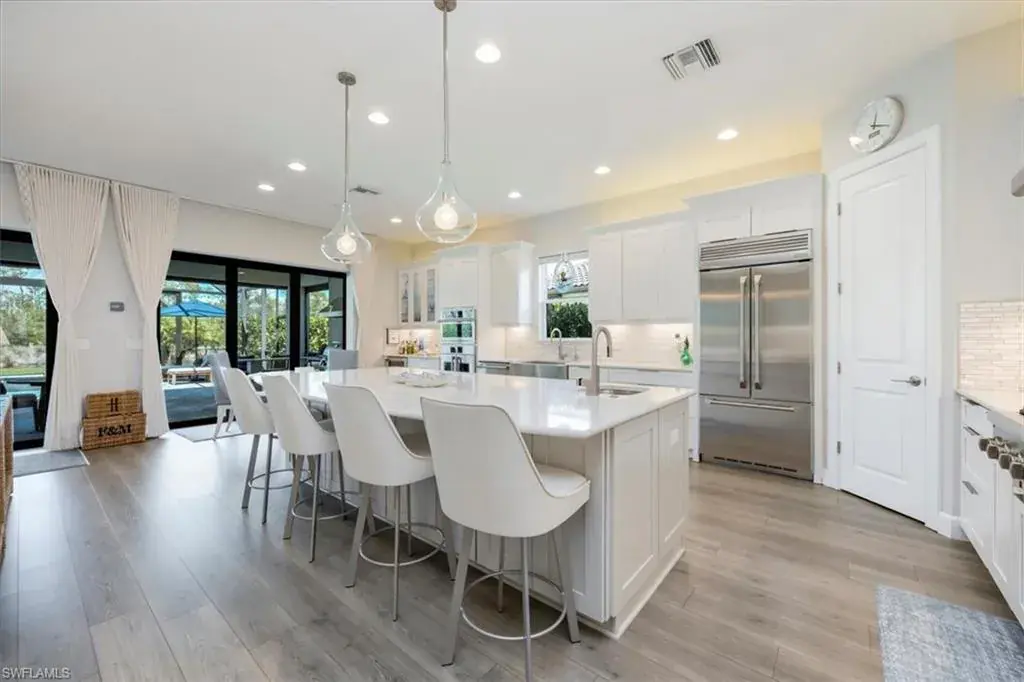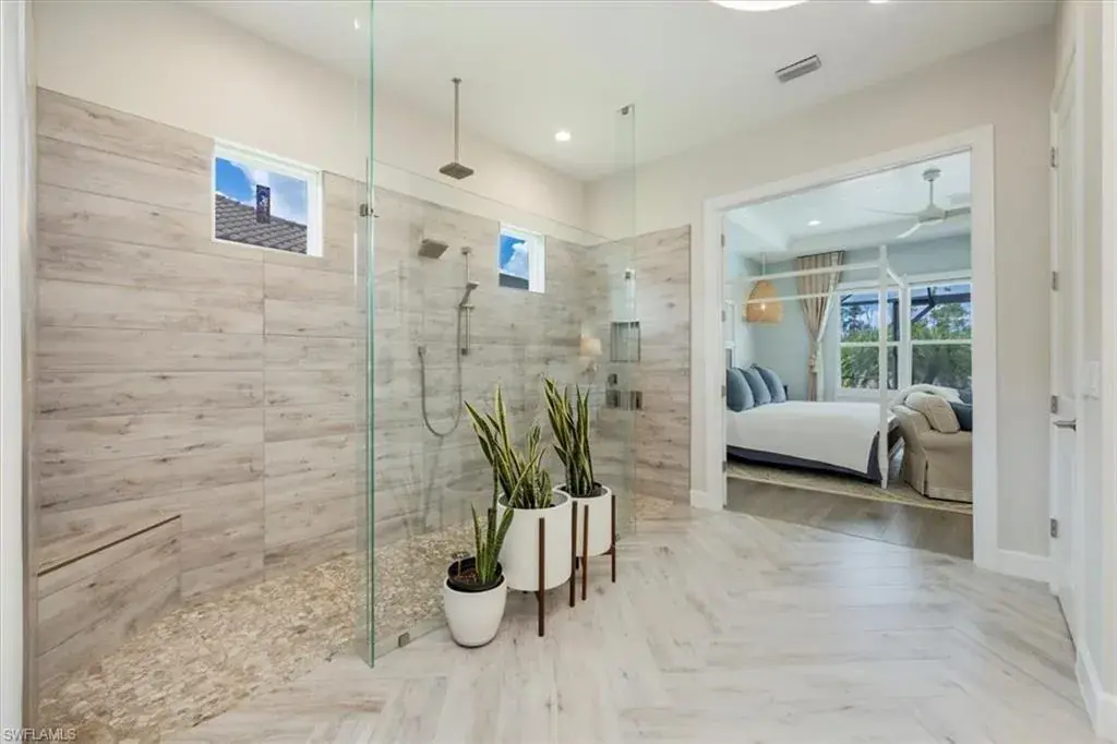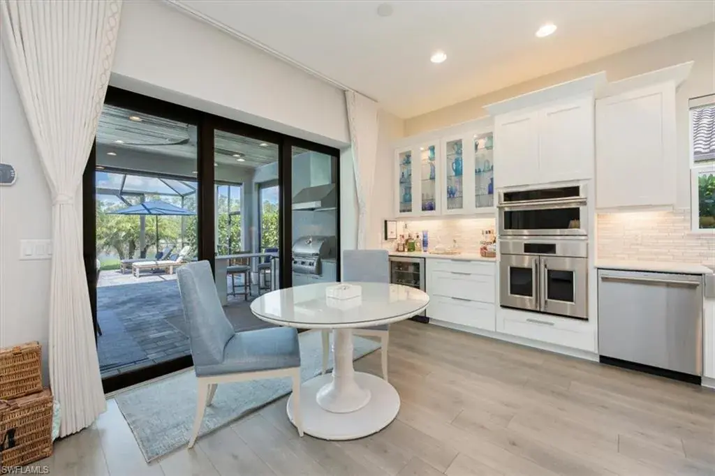 This stunning Pallazzio floor plan offers over 3,000 square feet of elegant living space, complete with three bedrooms, a den, and three full baths. Designed for both comfort and sophistication, the home includes an immediate full golf membership, making it an ideal choice for those seeking a vibrant lifestyle with world-class amenities at their fingertips. Thoughtful upgrades are found throughout the residence, starting with hurricane-rated windows, sliders, and doors, a new hurricane impact front door with matching side panels, and Storm Smart motorized shutters for peace of mind. A whole-house gas generator, tankless hot water heater, and a full water filtration and reverse osmosis system ensure modern convenience and efficiency. Inside, 10-foot ceilings, 8-foot doors, and Synergy cypress wood accents in the entryway, lanai, foyer, great room, primary suite, powder room, and laundry add warmth and architectural character. The extended gourmet kitchen is a true centerpiece, featuring GE Monogram appliances, a natural gas cooktop with wall oven, wine and beverage coolers, glass display cabinetry, and under-cabinet lighting. A SONOS sound system with in-ceiling speakers, custom designer lighting, and professionally designed draperies and blinds elevate the home’s interior design. The spacious primary suite offers a walk-in closet with custom shelving, a luxurious bath with double sinks, makeup area, and a frameless glass shower, while guest suites feature their own stylishly appointed bathrooms. Step outside to a private retreat on the oversized lanai, enhanced by a feature shell wall, bar seating, and a fully equipped outdoor kitchen. The gas-heated saltwater pool and spa with waterfall features are surrounded by picture window screens, mature native landscaping, and front and rear landscape lighting, creating a serene backdrop of preserve views and glowing sunsets. Additional highlights include an extended two-car garage with epoxy flooring, built-in storage, insulation, air conditioning, and a refrigerator, as well as ceiling fans in every bedroom, the den, great room, and lanai. High-end furniture is negotiable, allowing for a seamless move-in experience. Every detail of this property has been carefully curated for luxury, comfort, and peace of mind—ideal for both entertaining and quiet enjoyment.