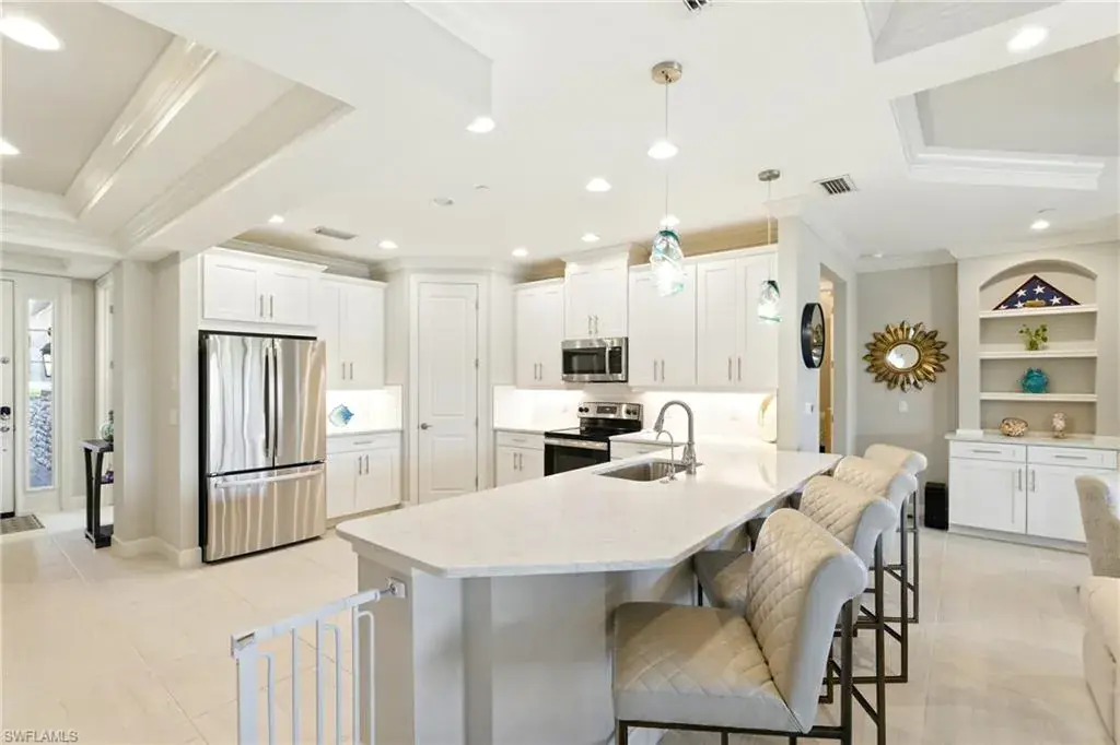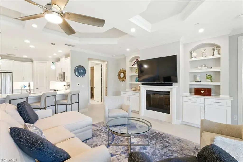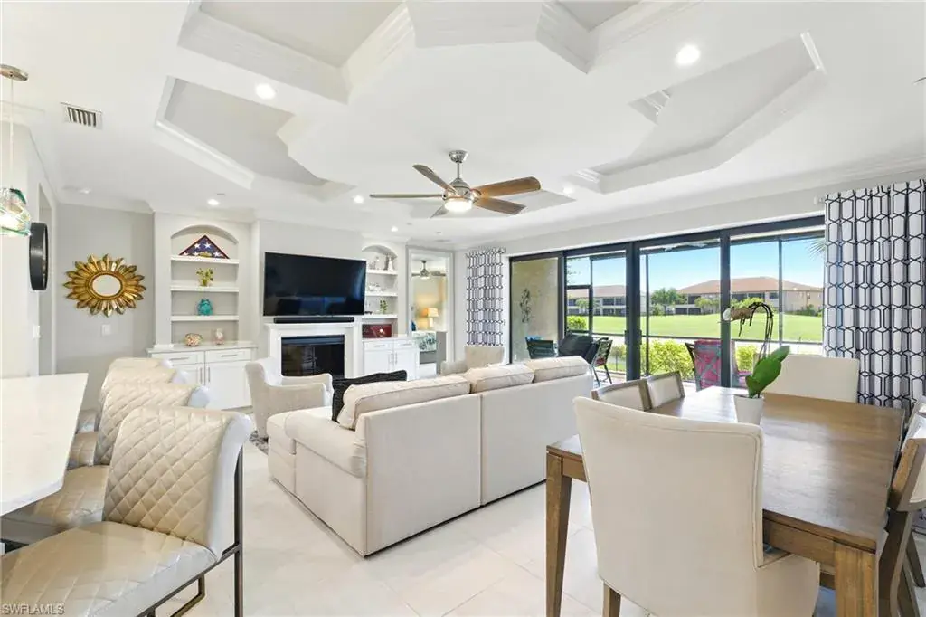 Take in stunning western views of the 15th green from the spacious screened lanai, complete with roll-down sunshades for added comfort. Inside, the home features elegant crown molding, 24-inch tile flooring, a cozy fireplace, high-impact windows and doors, tray ceilings, and upgraded glass shower doors in the guest bath. The kitchen is a true highlight with quartz countertops, upgraded white cabinetry, stylish hanging lights over the island, a sleek one-piece sink, and a generous pantry for extra storage.