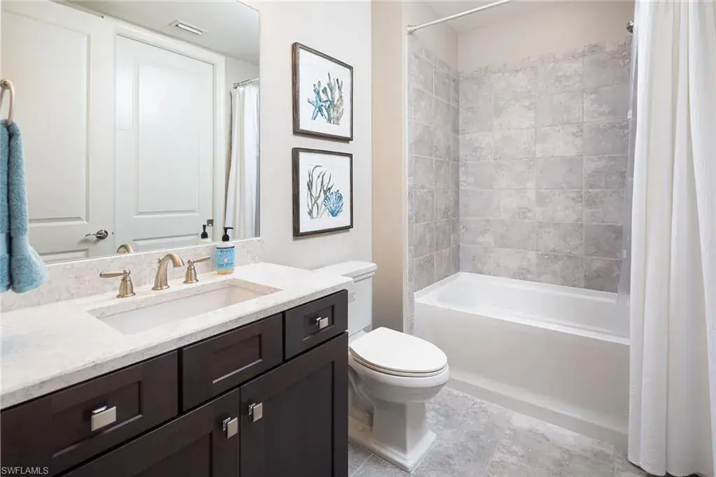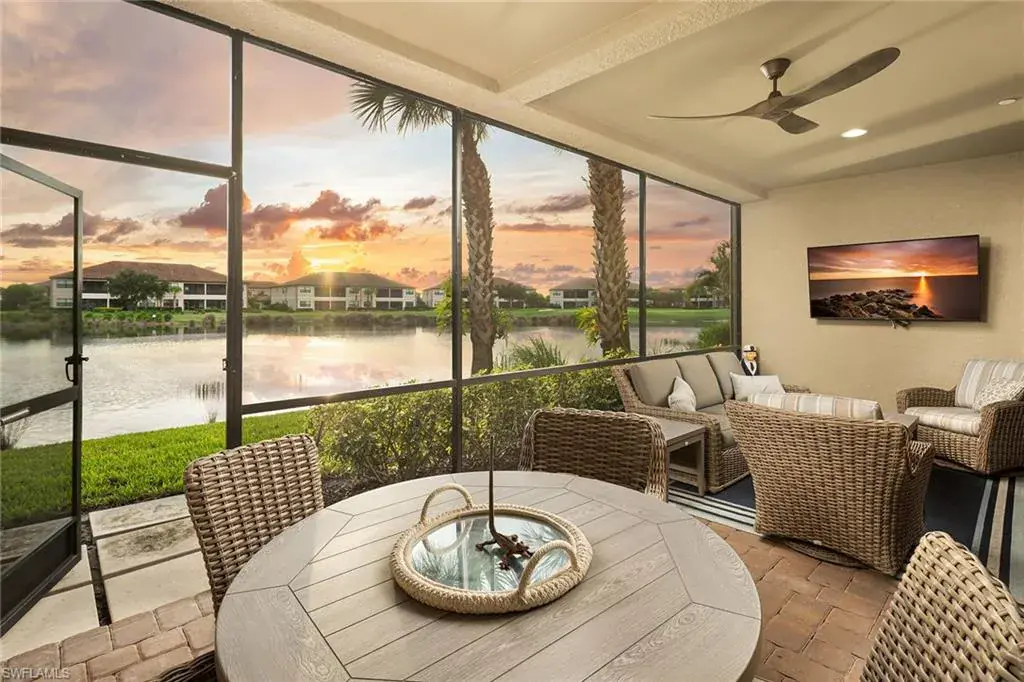 Sophisticated finishes with a fabulous sunset lakefront backdrop describe this move-in-ready residence with IMMEDIATE FULL GOLF MEMBERSHIP. This lightly used, pristine Esplanade beauty offers sleek plank flooring in great room and kitchen, luxury carpets in bedrooms, and loads of upgrades throughout and feels like new construction. The timeless, open white kitchen offers sleek shaker cabinetry, lovely quartz counters, GE stainless appliance package including hardly used slide-in range, stylish quartz backsplash, large pantry and breakfast bar. The great room is welcoming and well done with its coffered ceilings, extra lighting, built-ins and fireplace. The fabulous sunset views over the lake from the large lanai complete the package. Esplanade offers a fabulous lifestyle, complete with championship golf course, playful and lively pool area with cabana bar, spa services, fabulous gym, active tennis and pickleball, bocce and superb walking spaces. The location is also terrific with around the corner access to fantastic shopping and dining at Founder’s Square, while offering a quiet ambiance with no road noise.