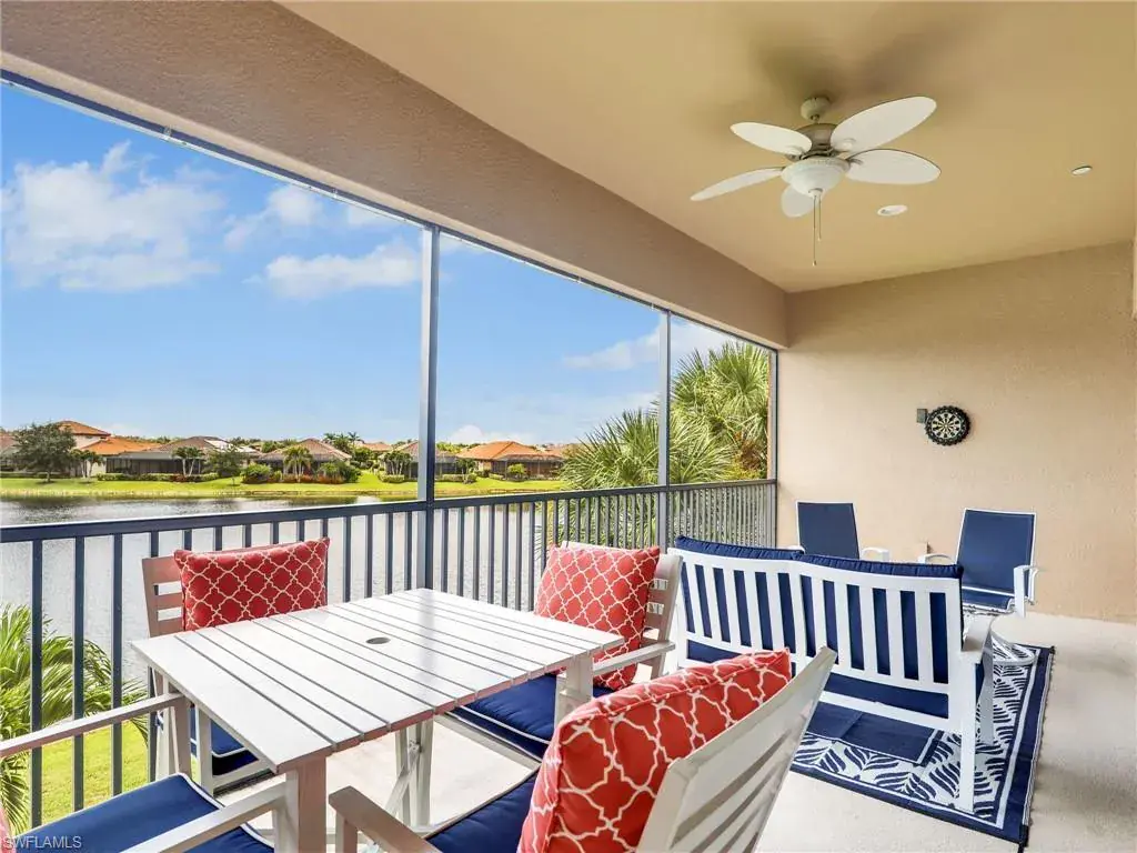 Enjoy the outdoors from a generous screened-in lanai overlooking a peaceful lake, offering the perfect setting for morning coffee, evening cocktails, or simply relaxing with a view.
