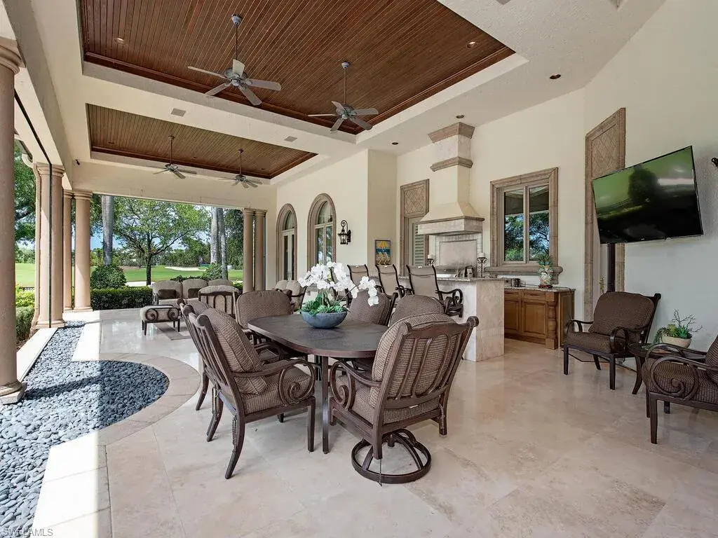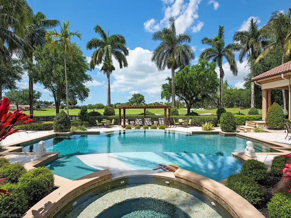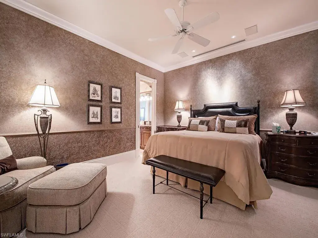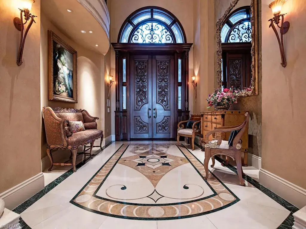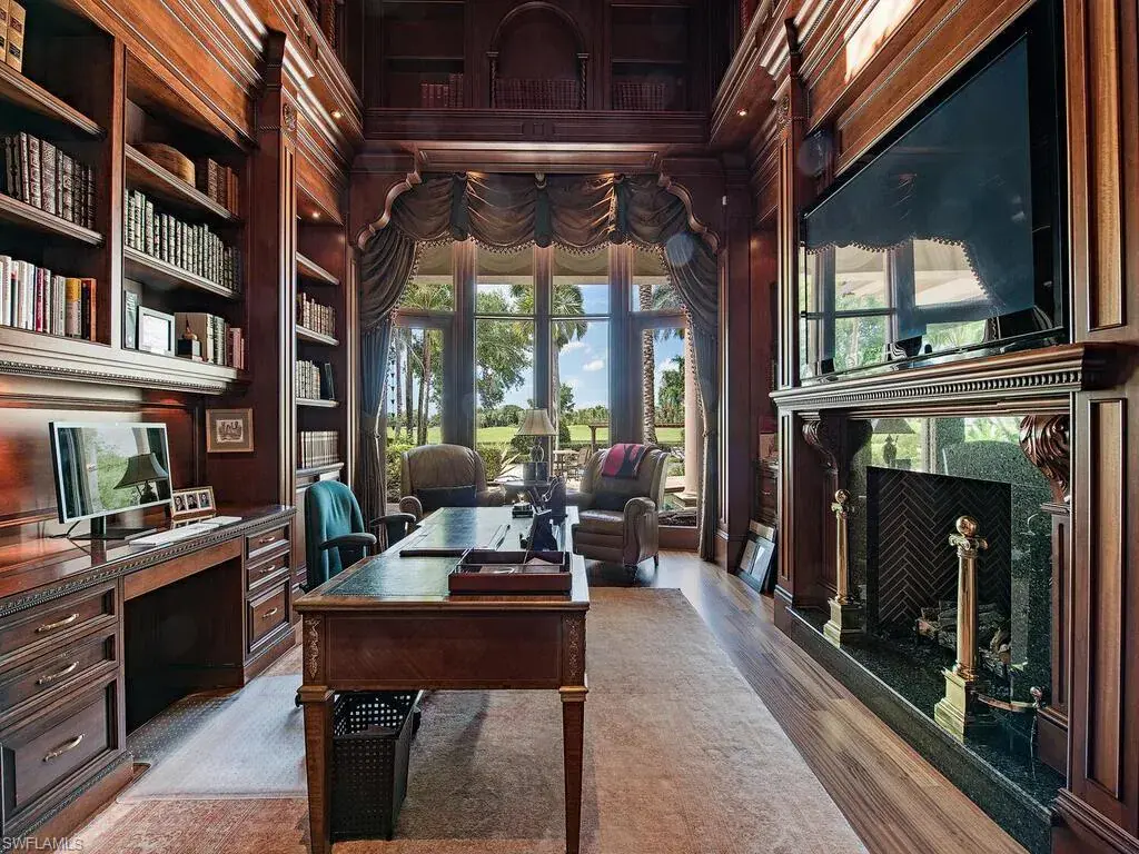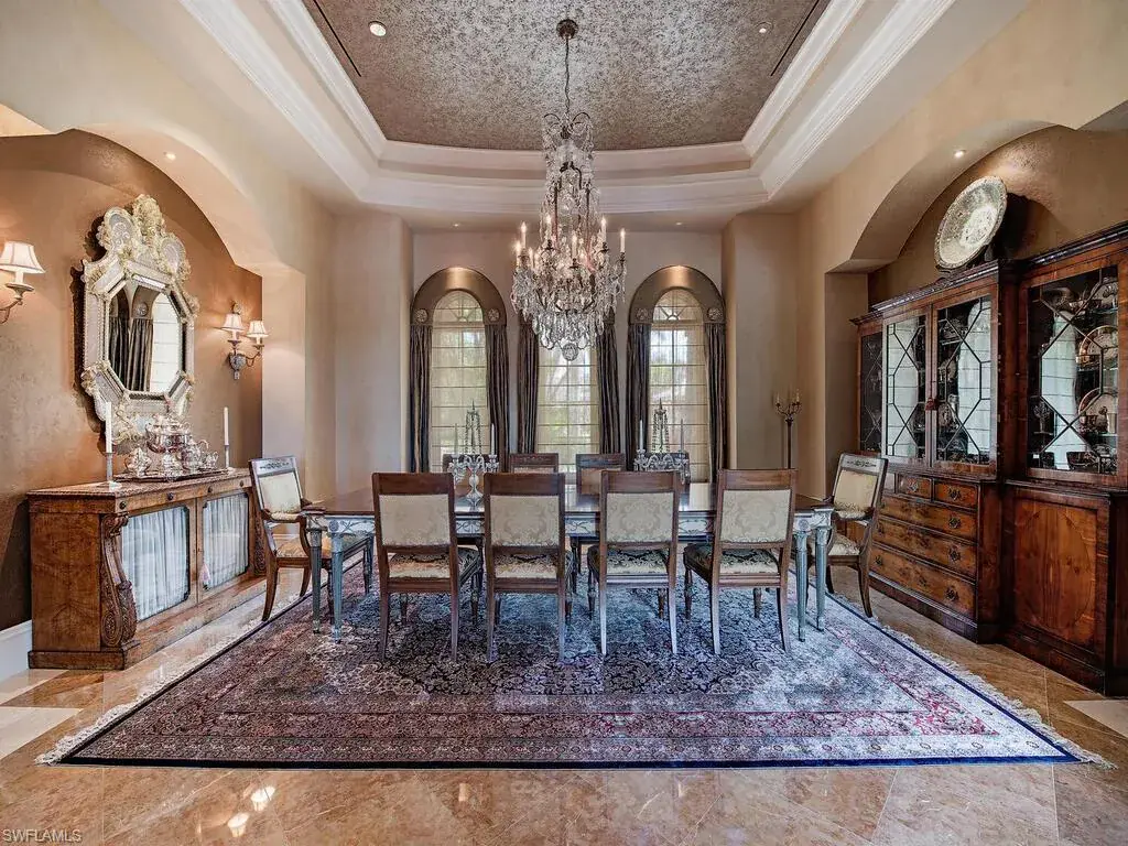 The Estates at Bay Colony, a community definable by no other statement than “Naples’ most luxurious estate homes,” now offers a residence so special that by comparison on any level, there is no equal. Secluded on a double lakefront estate site, this palatial estate incorporates only the finest materials and artisanship across the 15,247 sq. ft. of living area and exudes a rich European aesthetic. The residence is distinguished by a total of eight-bedroom suites, His and Her studies, a gourmet kitchen, a handsome hidden pub / billiards room, home theatre, and endless views of the lake and golf course from nearly every room. Ideally located on the ground-level, the master suite is nothing short of lavish with His and Her Dressing rooms, a sprawling bathroom befitting of royalty, as well as an adjacent sitting room that could serve a multitude of functions. Offering an impressive landscape for entertaining and relaxing, the exterior living environs host a sprawling logia with motorized screens, a fully-equipped outdoor kitchen, a magnificent pergola, as well as a 50′ lap pool with water-lounge and spa – all of which is surrounded by Ritz Carlton styled cabanas. Additionally encompassed on site is a two-bedroom guest house complete with a full kitchen and living room, as well as a six-car capacity four-bay garage plus golf cart bay. It is without a doubt that this home exceeds all expectations and is a “must see” for the most discerning prospects.