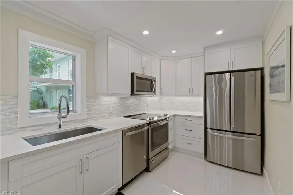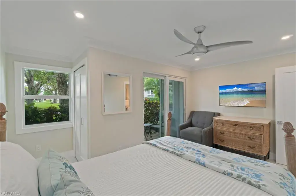 This completely renovated first-floor condo is located Everglades Club at Village Green, a 55+ community just steps to the beach, Naples Pier, and all the dining and shopping of Third Street South and Fifth Avenue. No room was untouched—this home features recessed lighting, new furniture, and a modern coastal design throughout. The open floor plan flows with polished tile, a bright kitchen with a spacious pennisula, and spa-inspired bathrooms with walk-in showers. One bedroom offers private outdoor access, while the other provides an en-suite bathroom with stunning natural light. Additional updates include a 2023 water heater and impact-resistant windows and doors throughout. Enjoy peaceful courtyard and park-like views from your private patio. For added convenience a designated parking spot and bonus storage locker. Village Green residents benefit from a community pool, clubhouse, bocce and shuffleboard courts, library, game room, and workshop—all in the heart of Olde Naples.
