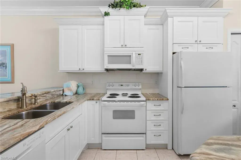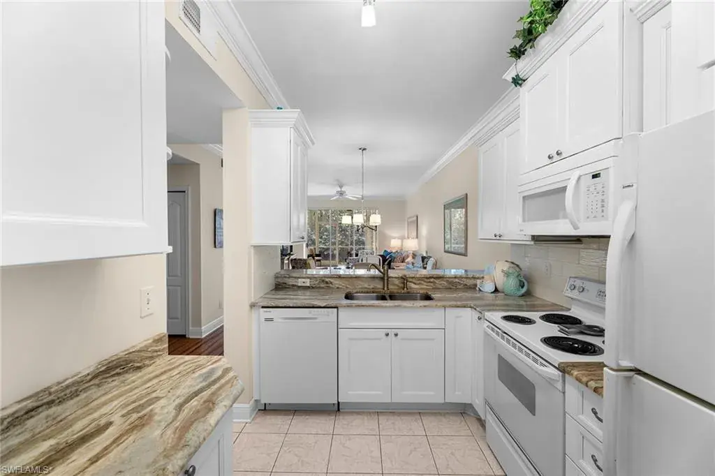 Welcome to Fairways II at Marco Shores! This beautifully updated two-bedroom condominium is turnkey and styled with inviting coastal décor, everything you need is included. The bright white kitchen has been tastefully updated with new countertops and breakfast bar area. The spacious primary bedroom features a walk-in closet and direct access to the screened lanai, where you can relax in the outdoor seating area and enjoy the Florida breeze. This charming condominium also includes a designated covered parking spot for convenience. Residents enjoy access to a community pool, ideal for soaking up the sun. Don’t miss this move-in-ready gem.