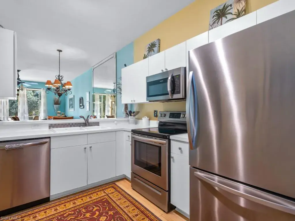 This pet-friendly, fully furnished 2-bedroom, 2-bathroom first-floor unit is located in Fairways II at Marco Shores. Designed for comfort and style, it features 9-foot ceilings and durable bamboo flooring throughout. The bright white kitchen is equipped with newer stainless-steel appliances, while the spacious living and dining areas create an inviting, open-concept layout.