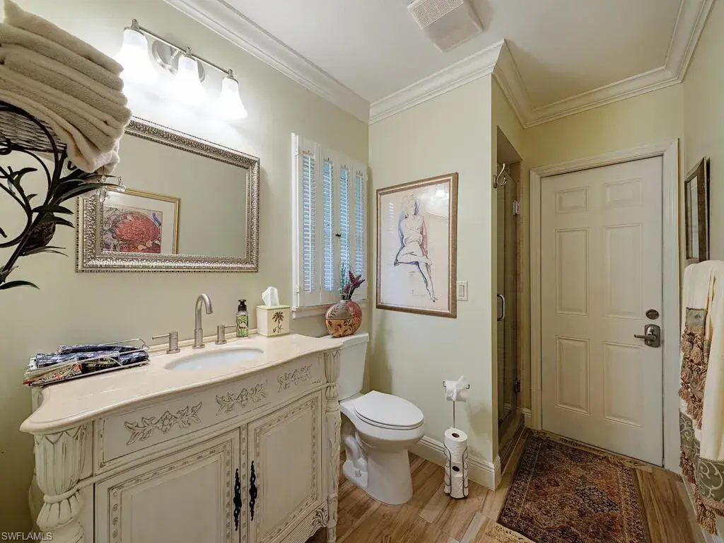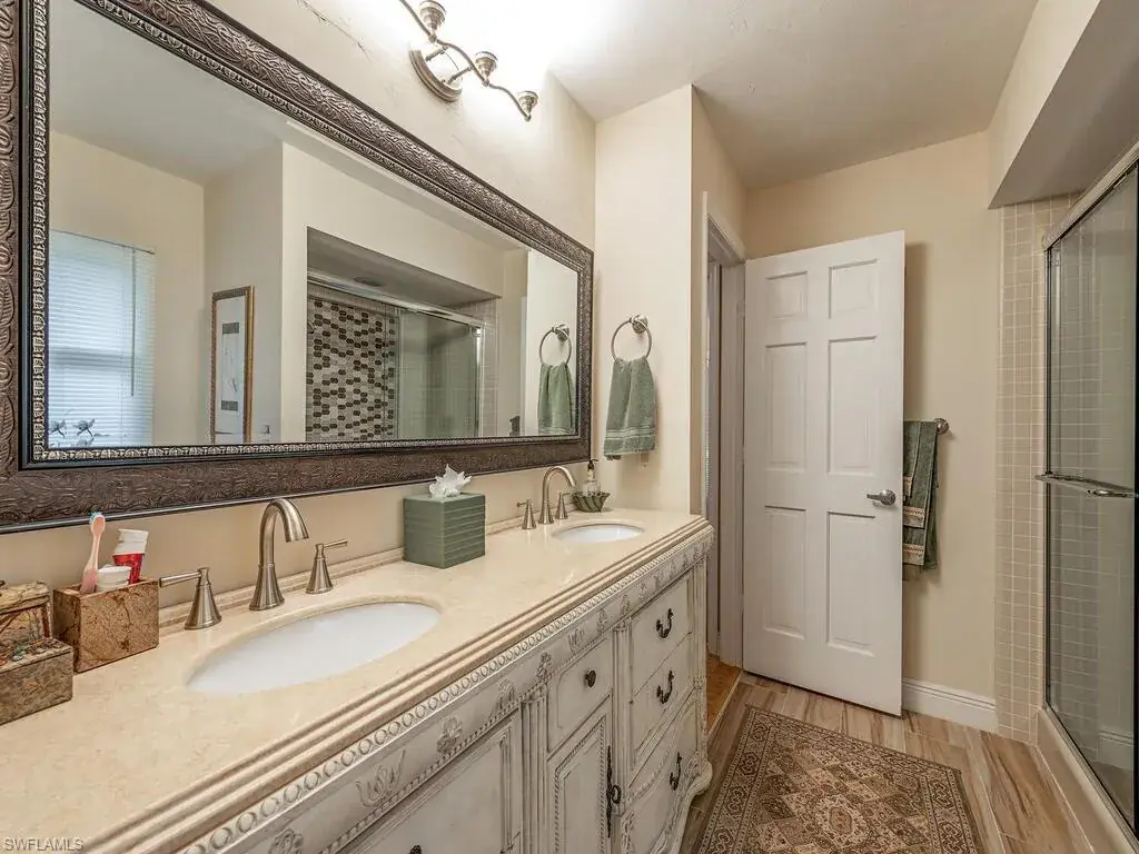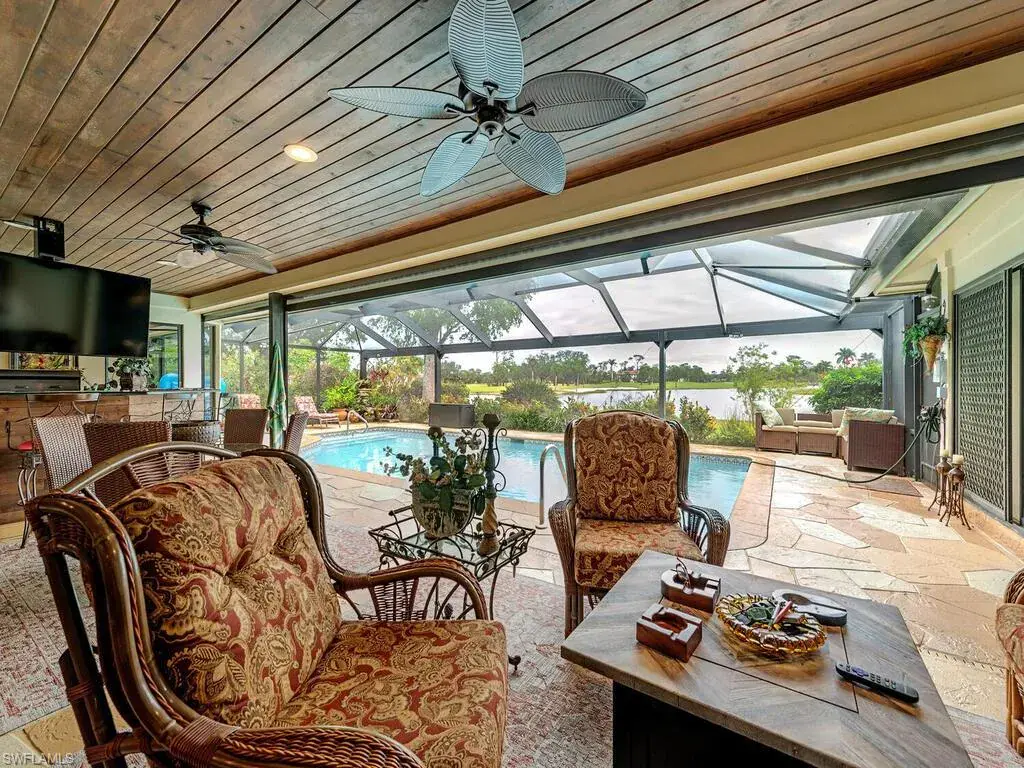 Step outside to the recently resurfaced pool area, adorned with elegant stamped concrete. The lanai includes a built-in summer kitchen and a new cage with large, unobstructed picture windows that frame the breathtaking views of the lake and golf course. The pool area also features see-through hurricane shutters that can be controlled remotely via your smartphone.