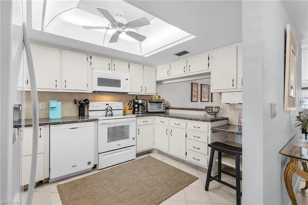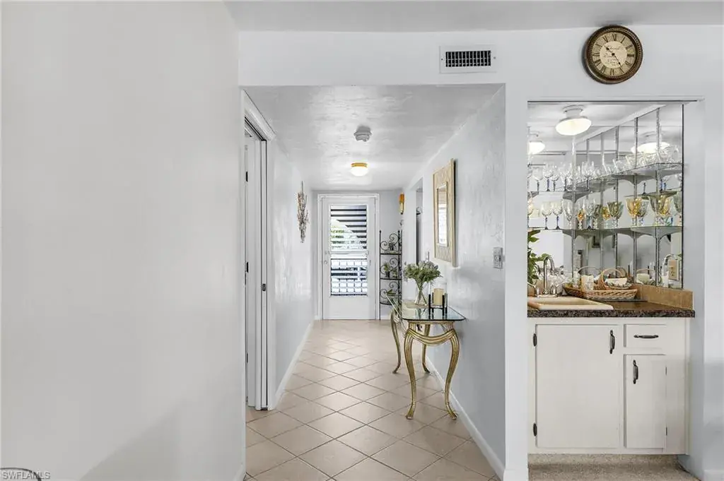 Enjoy peaceful lake views from this beautifully maintained 2-bedroom, 2-bath condo in the sought-after 55+ community of Fountains. This turnkey, move-in ready home offers 1,082 sq. ft. of comfortable living space, a 2018 A/C, mechanical hurricane shutters, and a brand-new washer. Inside, a bright entryway with neutral tile flooring leads into an open-concept living and dining area featuring plush carpeting, a mirrored wet bar, and plenty of natural light. The kitchen offers an abundance of cabinetry, a tasteful tile backsplash and pass-through breakfast bar. A spacious primary bedroom includes a large walk-in closet and an en-suite bath with a walk-in shower. The private, screened balcony overlooking the serene lake is the perfect place to watch morning sunrises with NE rear exposure. Covered parking is included for convenience. Ideally located just steps from Hibiscus Golf Club and close to downtown Naples, Gulf beaches, Fifth Avenue South, Celebration Park, and more. With quick access to US-41 and I-75, this is a perfect opportunity to enjoy the best of 55+ living in Southwest Florida.