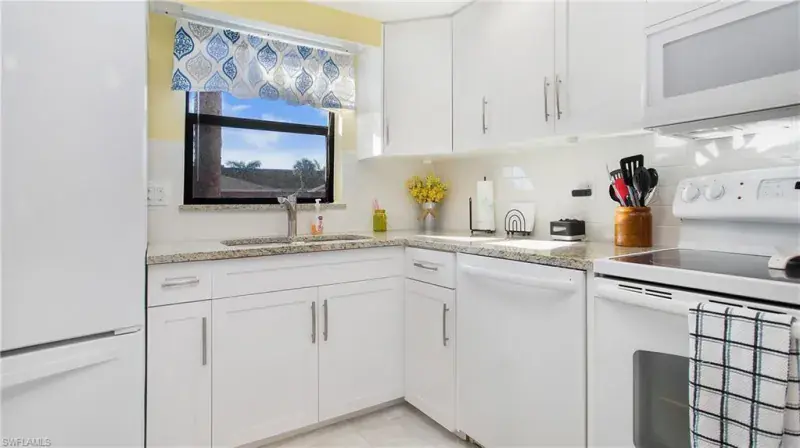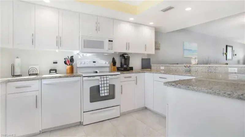 This condo features a split-bedroom floor plan, providing privacy and a functional layout that’s perfect for hosting guests. The remodeled kitchen is a showstopper, designed for open-concept living with white shaker cabinets, gleaming granite countertops, a convenient snack bar, and a spacious pantry. Whether you’re preparing a meal or entertaining friends, this space is as practical as it is beautiful.
