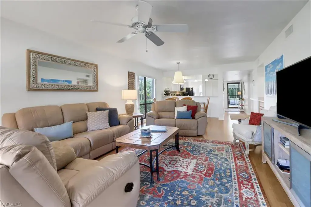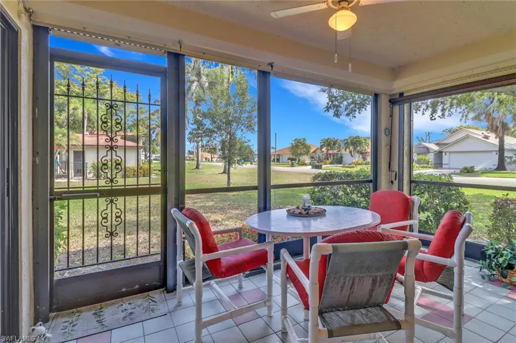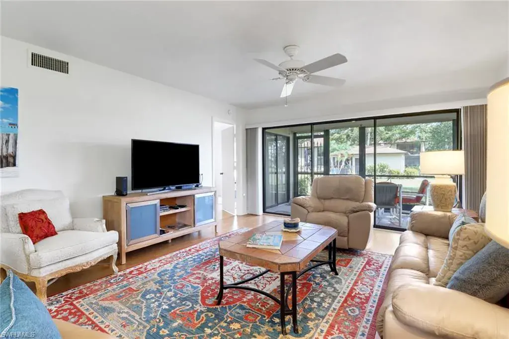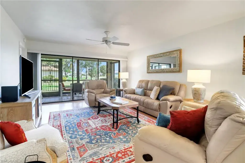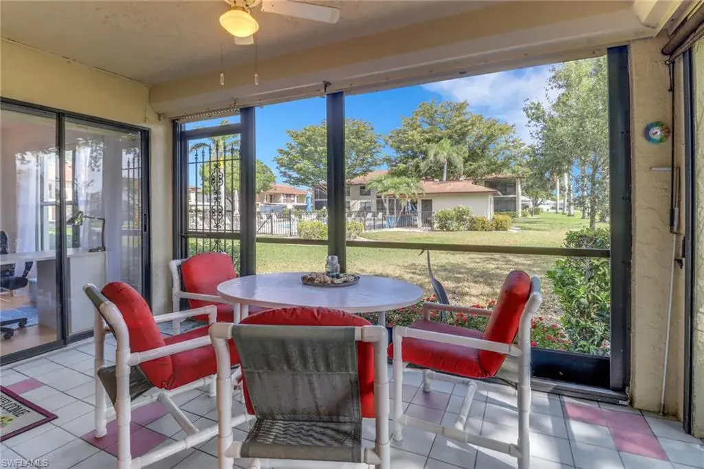 This desirable first floor condo is an END-UNIT located at the edge of the development. The lanai overlooks the beautifully landscaped area near the pool and the nearby quiet residential area. One of two sparkling pools on the property is less than 100 feet from the lanai!! The front patio faces a wooded area, providing a peaceful setting to enjoy your morning coffee or evening refreshments. Extra windows on this end-unit provide more light flowing throughout the condo and lanai. Offered as a turnkey property, it includes all essentials for a comfortable start in your new home. As you enter the condo, you are greeted by the patio with a spacious seating area. In the kitchen, you will find a sizable pantry and laundry closet. Of special note is the brand-new oven installed in April 2025. Off the kitchen is a large flex space, which is perfect for a breakfast nook, den or home office. The living and dining area offer an open concept giving you options for furniture placement. The spacious owner’s suite features direct lanai access and picturesque views of the pool and landscaped area. The en-suite bathroom is equipped with a step-in shower, dual sinks, and a large walk-in closet. Fountains V, set in a serene neighborhood, offers well-maintained grounds, two community pools, and a variety of social activities, all with reasonable association fees that cover cable and water. It is conveniently located, just a block from the Hibiscus Golf Course, less than a mile from US 41 and the Shoppes at Hammock Cove, and under five miles from downtown Naples, renowned for its pristine beaches, gourmet dining, and sophisticated shopping.