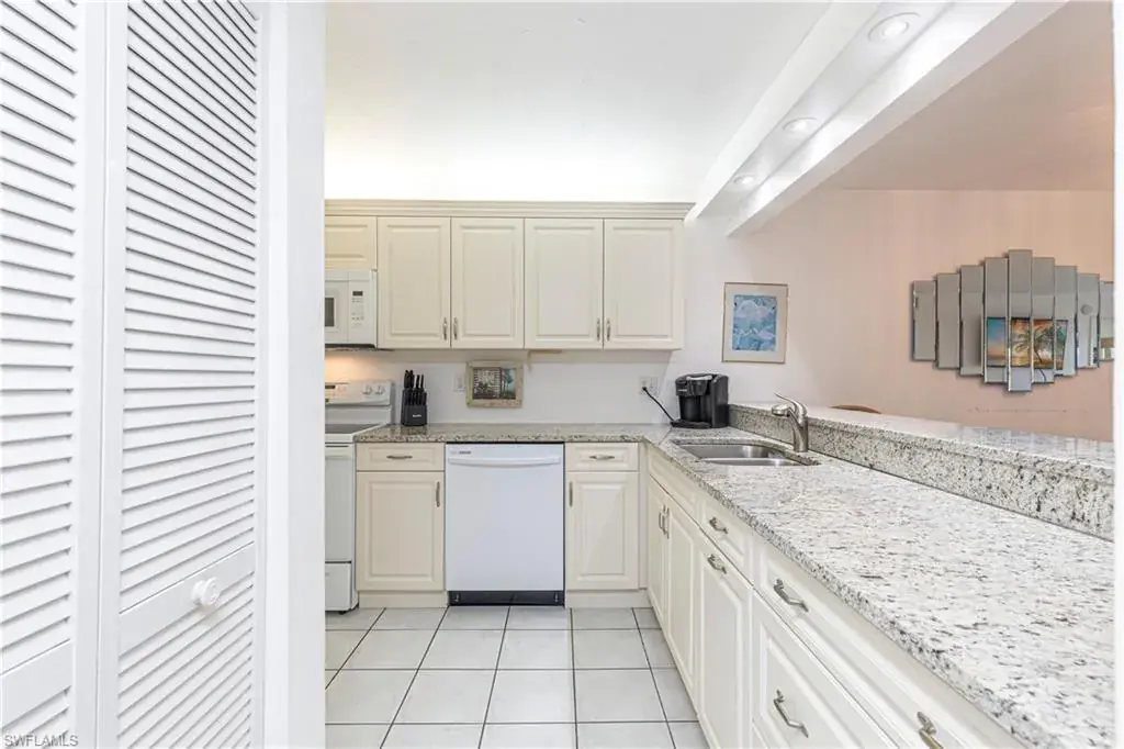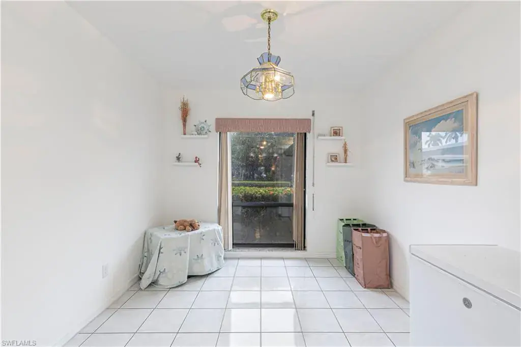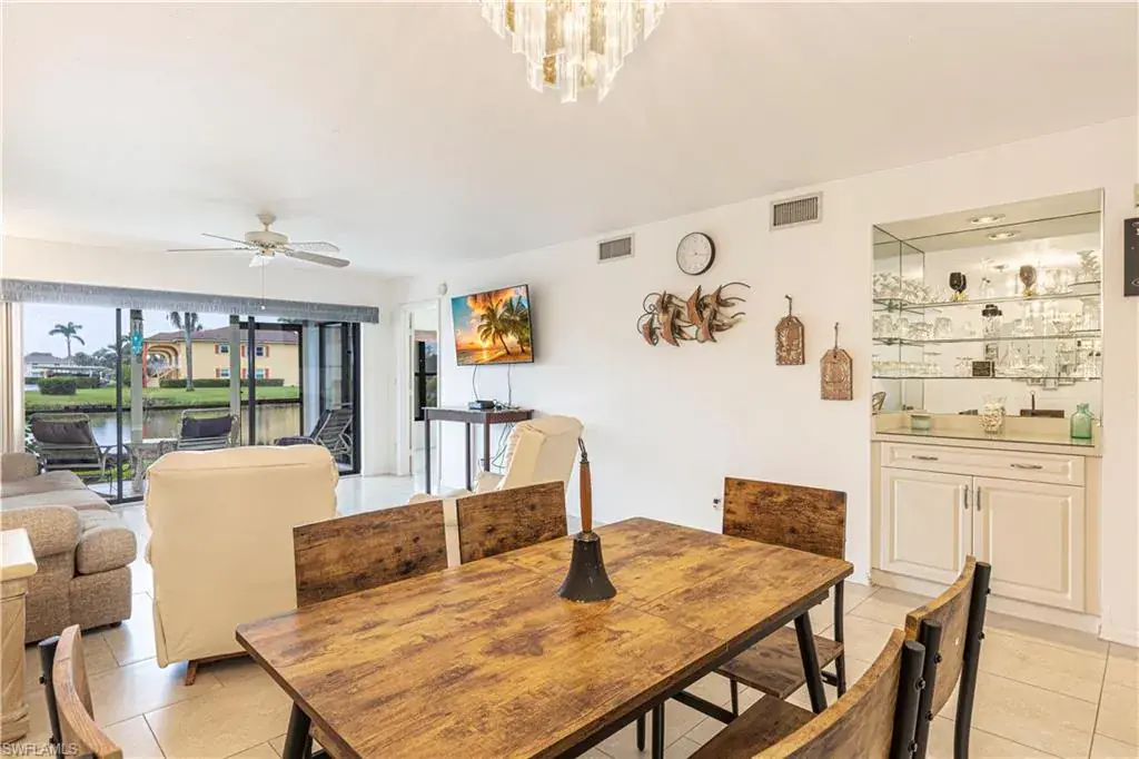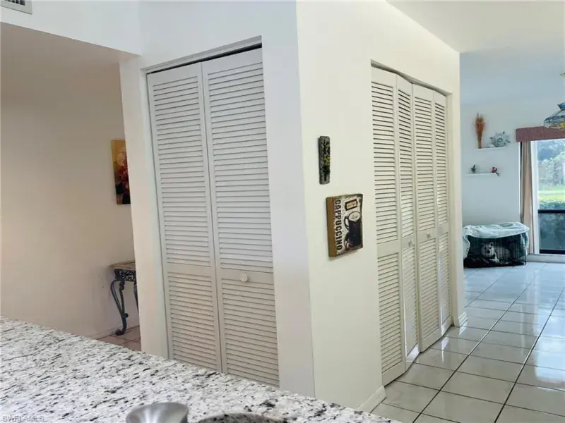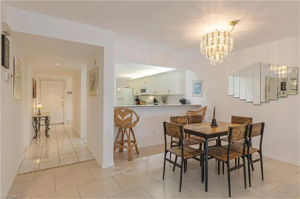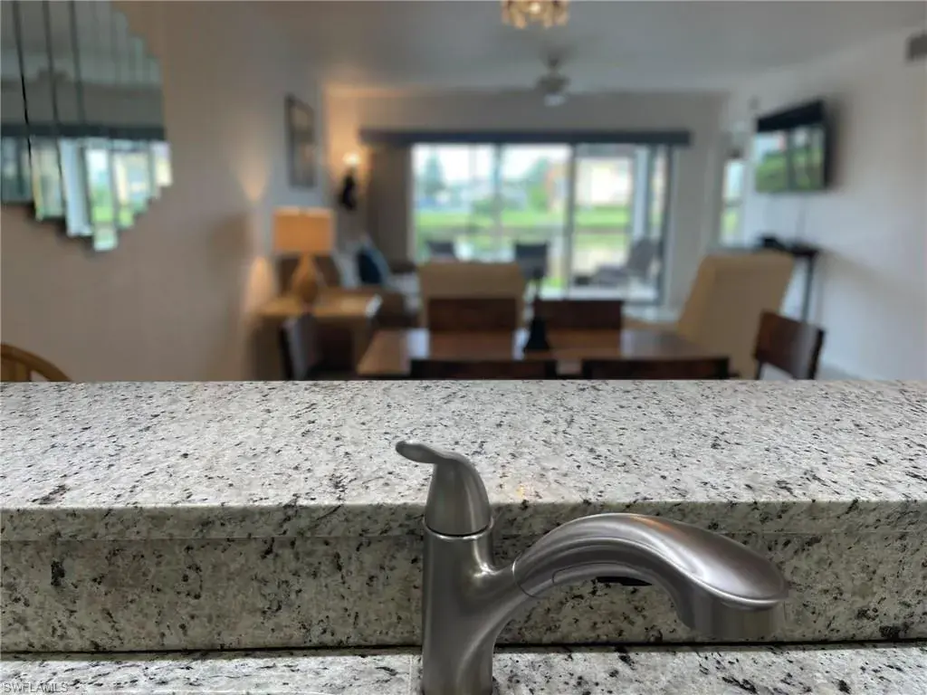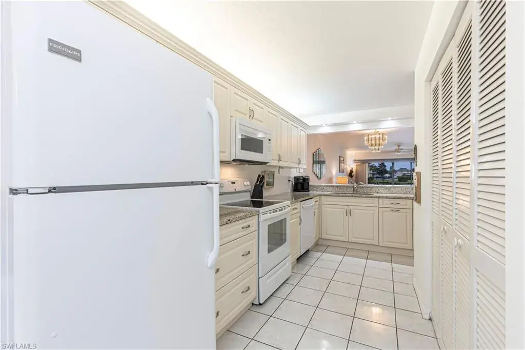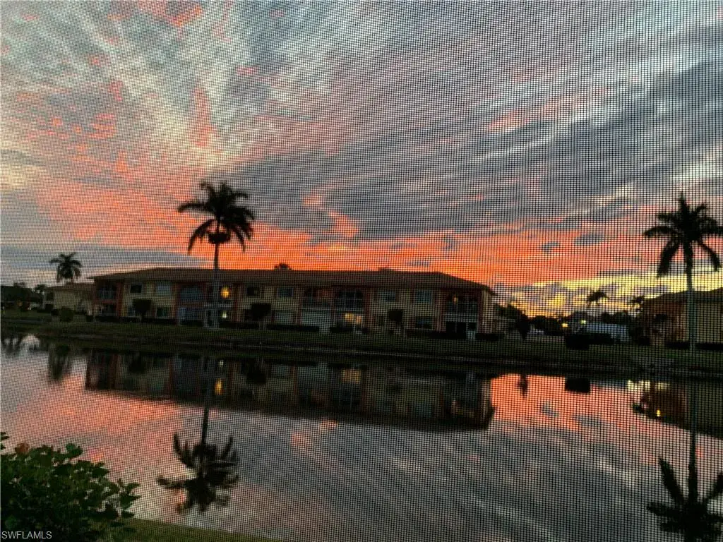This desirable first floor condo has stunning lake views from the expansive lanai and almost every room. Offered as a turnkey property, it includes all essentials for a comfortable start in your new home. As you enter the condo, you are greeted by the patio with a spacious seating area. The kitchen and wet bar have been updated with granite countertops, white cabinetry and large pull-out drawers for pots/pans and small appliances. Also in the kitchen, you will find a sizable pantry and laundry closet. Off the kitchen is a large flex space, which is perfect for a breakfast nook, den or home office. The living and dining area offer an open concept giving you options for furniture placement. The spacious owner’s suite features direct lanai access and picturesque lake vistas. The en-suite bathroom is equipped with a step-in shower, dual sinks, and a large walk-in closet. Fountains V, set in a serene neighborhood, offers well-maintained grounds, two community pools, and a variety of social activities, all with reasonable association fees that cover cable and water. It is conveniently located, just a block from the Hibiscus Golf Course, less than a mile from US 41 and the Shoppes at Hammock Cove, and under five miles from downtown Naples, renowned for its pristine beaches, gourmet dining, and sophisticated shopping.