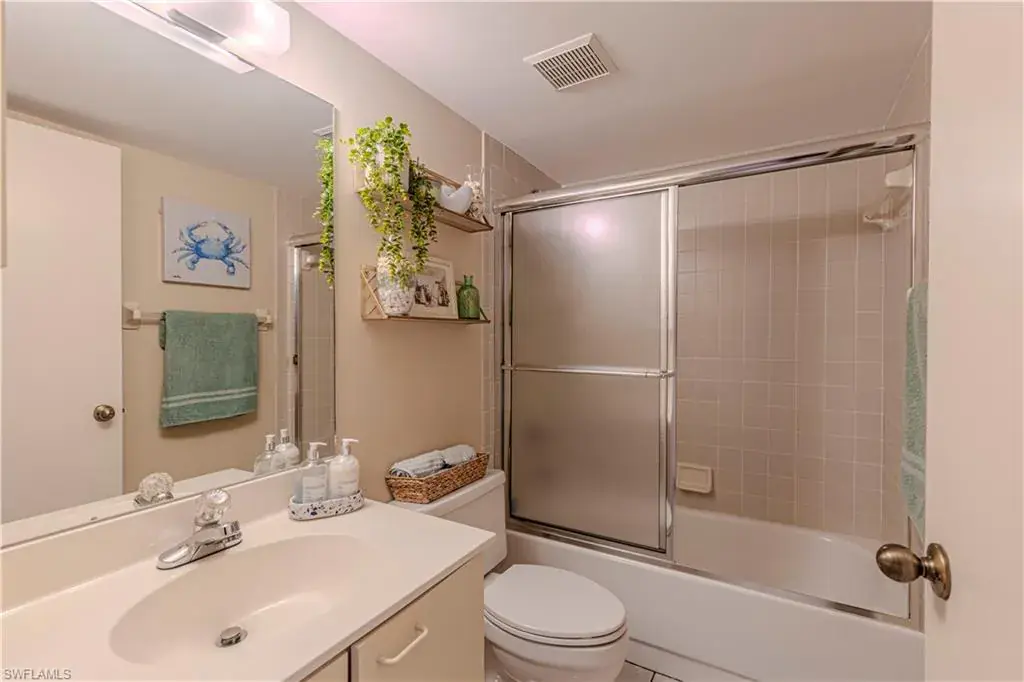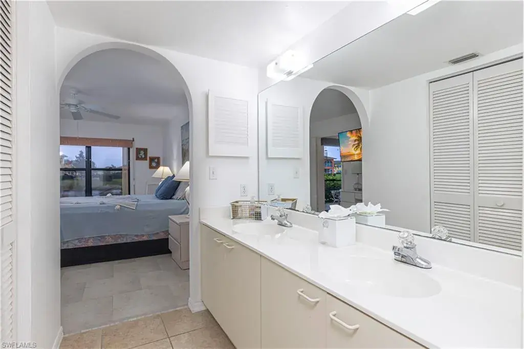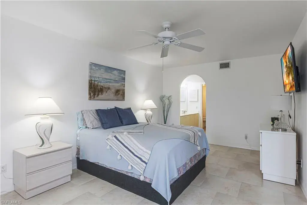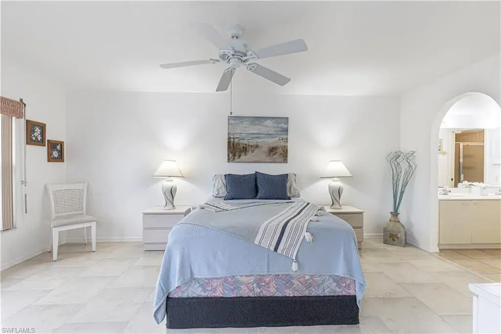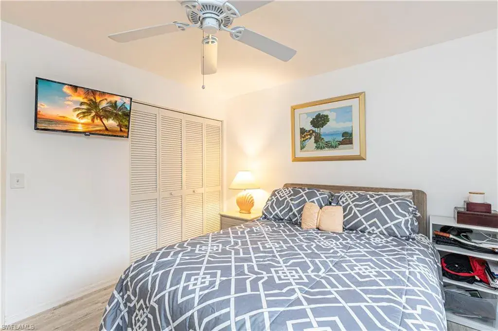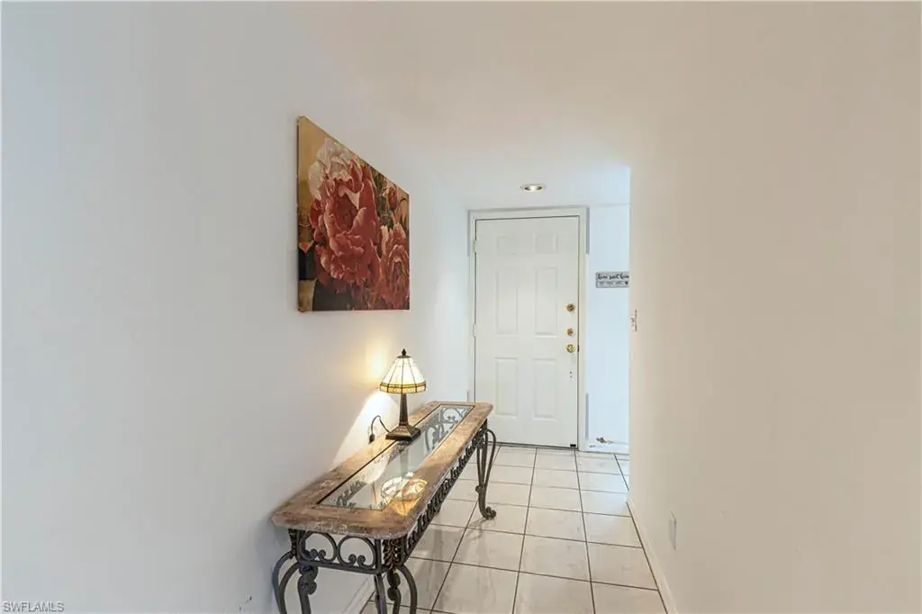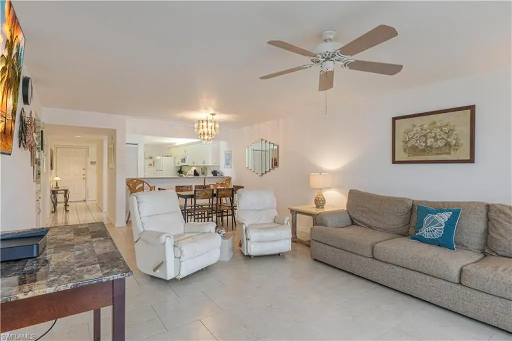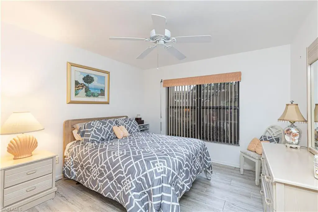 This desirable first floor condo has stunning lake views from the expansive lanai and almost every room. Offered as a turnkey property, it includes all essentials for a comfortable start in your new home. As you enter the condo, you are greeted by the patio with a spacious seating area. The kitchen and wet bar have been updated with granite countertops, white cabinetry and large pull-out drawers for pots/pans and small appliances. Also in the kitchen, you will find a sizable pantry and laundry closet. Off the kitchen is a large flex space, which is perfect for a breakfast nook, den or home office. The living and dining area offer an open concept giving you options for furniture placement. The spacious owner’s suite features direct lanai access and picturesque lake vistas. The en-suite bathroom is equipped with a step-in shower, dual sinks, and a large walk-in closet. Fountains V, set in a serene neighborhood, offers well-maintained grounds, two community pools, and a variety of social activities, all with reasonable association fees that cover cable and water. It is conveniently located, just a block from the Hibiscus Golf Course, less than a mile from US 41 and the Shoppes at Hammock Cove, and under five miles from downtown Naples, renowned for its pristine beaches, gourmet dining, and sophisticated shopping.