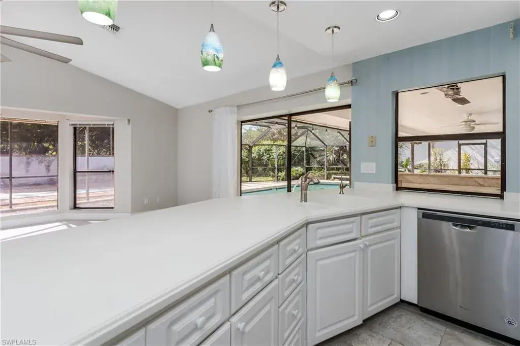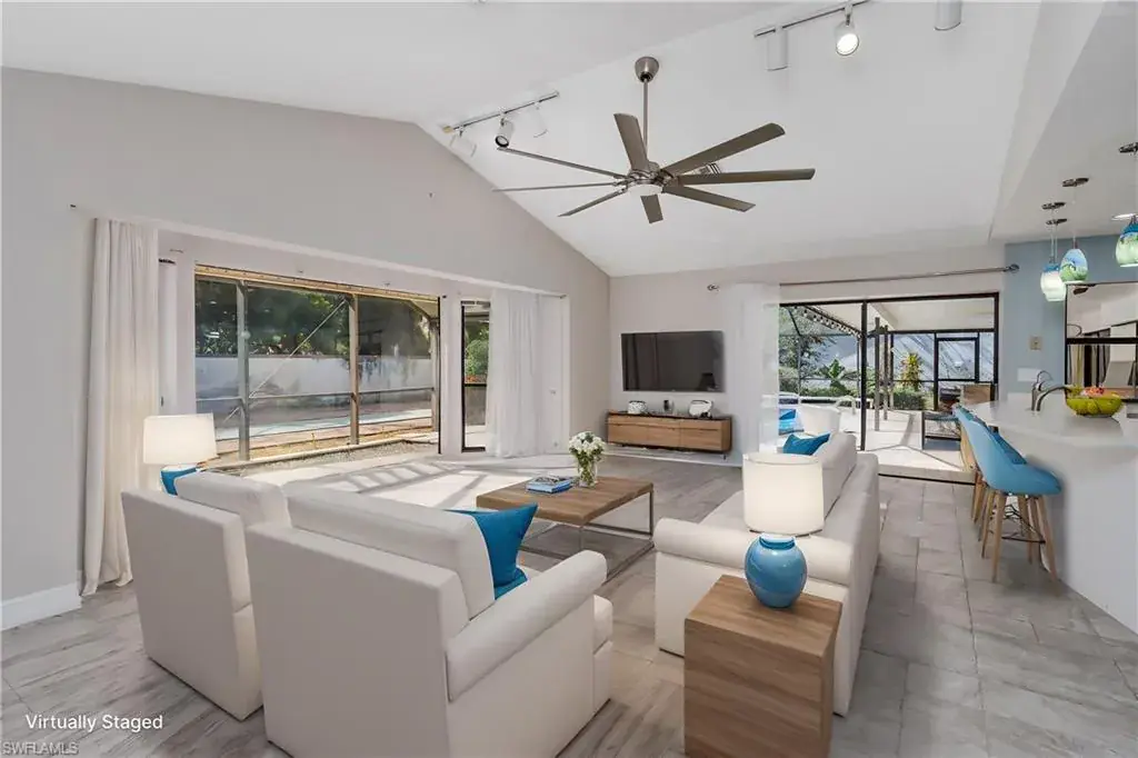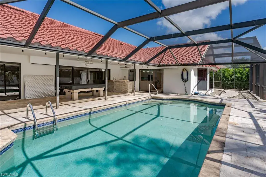 Absolute Paradise awaits you in the prestigious bundled golf community of Foxfire!! With bundled golf you can play golf immediately, no wait!! This beautiful home is located on a cul-de-sac with a circular driveway with beautiful pavers!! New tile throughout!! The living room is very large and with the sliders open to the pool, creates a great environment for socializing and fun with friends! Open concept kitchen with a cozy and comforting den area overlooking a beautiful garden area and pool!! The back porch is wired for TV and music with an updated bar and new pavers! The two car garage is large enough for a golf cart to enter through the 2nd smaller garage door on the side of the home. Garage door and lift is new! Roof is 2018 and the A/C is 2022. All bathrooms were remodeled in 2020!! Located just minutes to shopping and groceries and restaurants. The beach is only a 12 minute drive!! Foxfire has a beautiful 27 hole Arthur Hills designed golf course and a recently renovated clubhouse and pool! One of the the lowest priced golfing games in Naples! The clubhouse has a nice gym, bocce ball, three tennis courts, large swimming pool and a bar & grill and fine dining and a LOT of social events!!