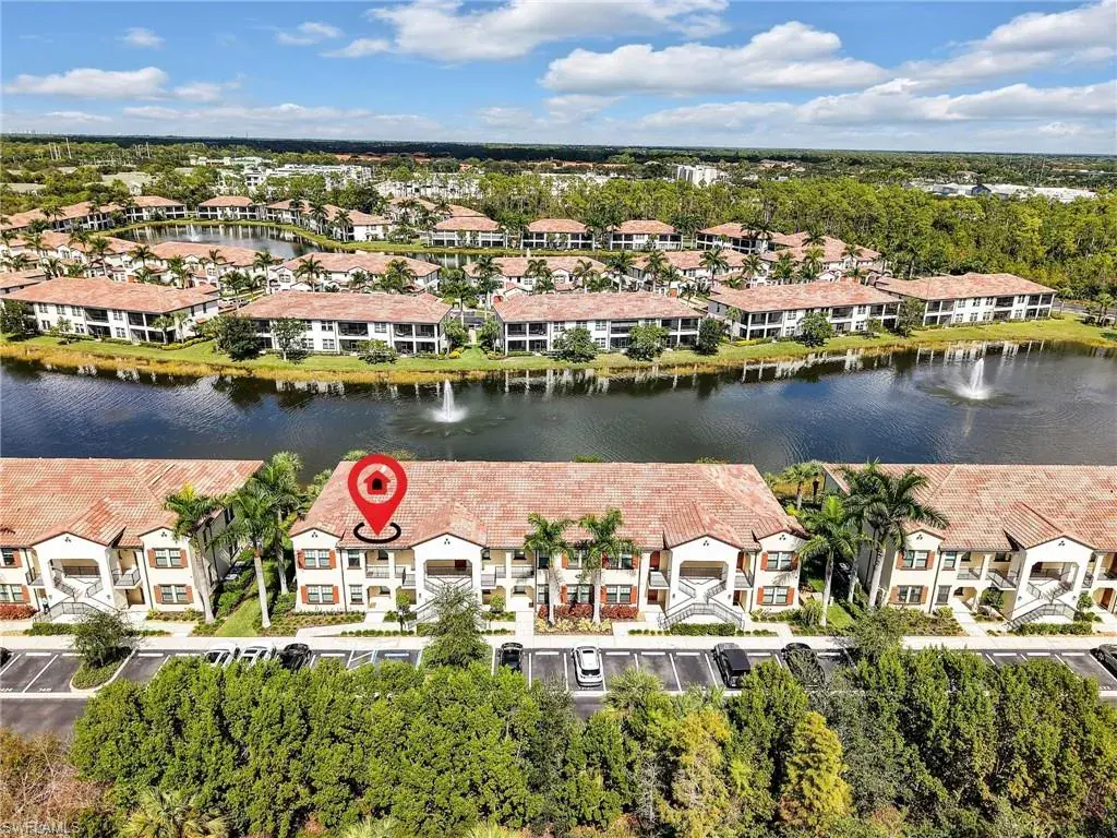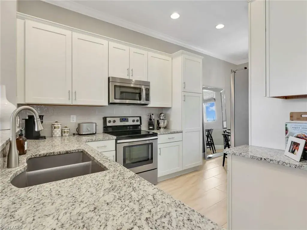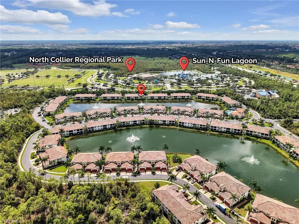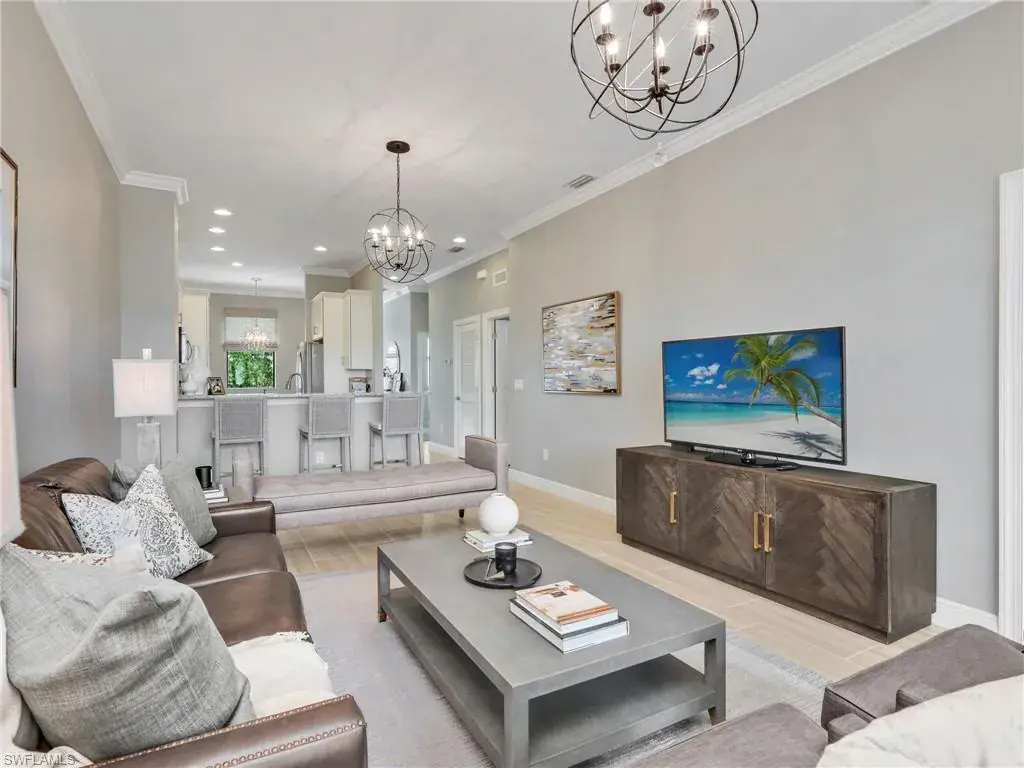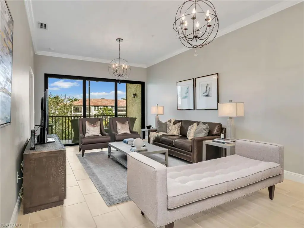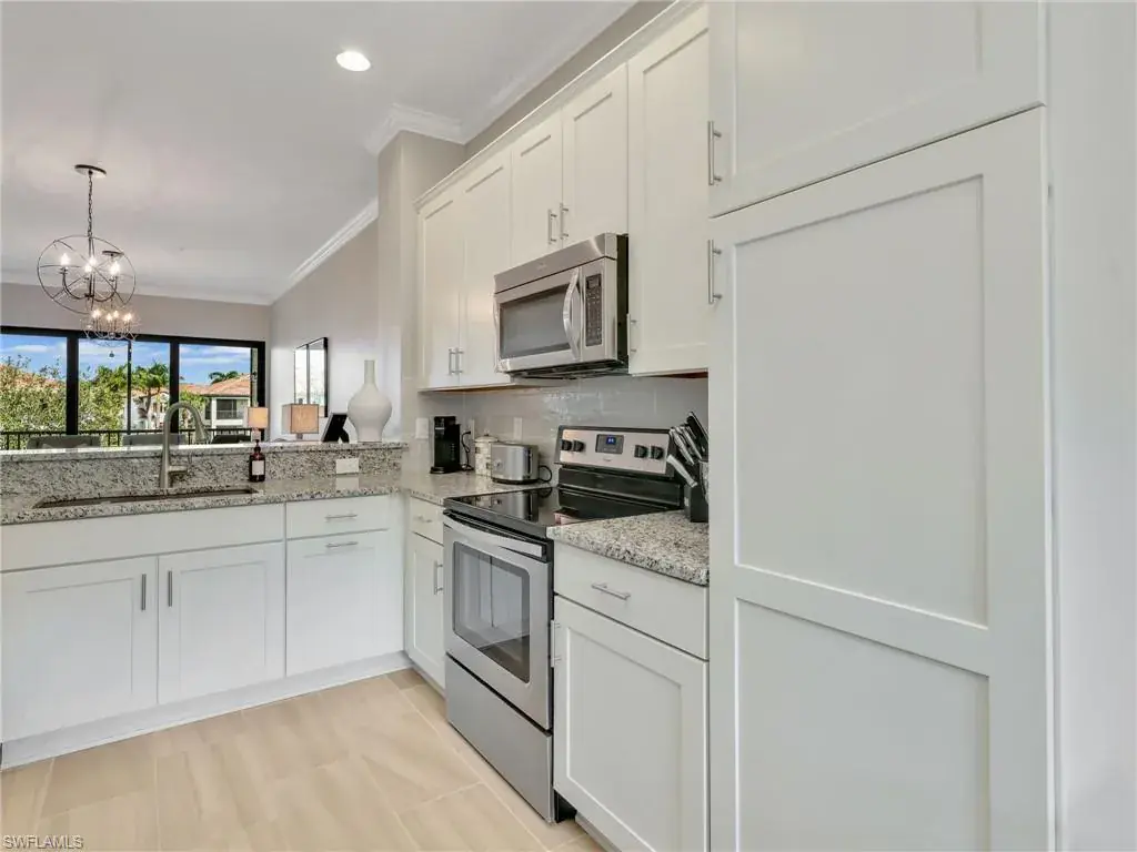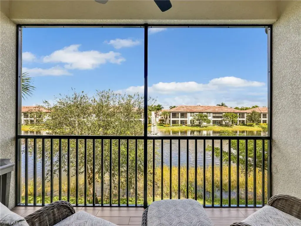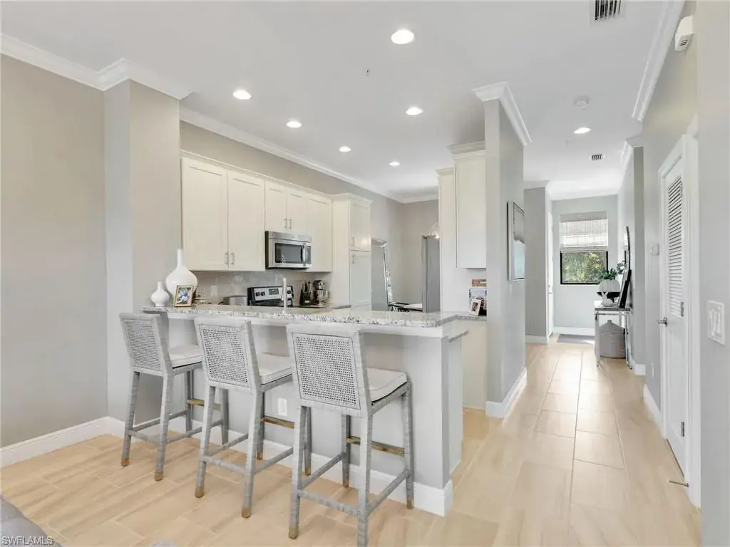 MUST SEE! This meticulous 3 bedroom, 2 bathroom second floor END UNIT condo offers tranquil lake views with a fountain and is ideally situated in the conveniently located gated community of Livingston Lakes in prime North Naples. Boasting 1,258 square feet of thoughtfully designed living space, this property features a split-bedroom floor plan, volume ceilings, and a tiled screened-in lanai that invites you to unwind with a peaceful morning coffee. The kitchen is both stylish and functional, showcasing white shaker cabinetry, granite countertops, a Blanco silgranit sink, stainless steel Whirlpool appliances—including a new refrigerator (2023) & a new dishwasher (2022), subway tile backsplash, soft close drawers, a pantry, breakfast bar, and an inviting eat-in kitchen area with an additional dining/living space for added versatility. The spacious primary suite offers a walk-in closet and an en-suite bathroom with granite countertops, glass shower enclosure, floor to ceiling tiled shower, upgraded mirror and vanity with drawers, while the guest bathroom impresses with quartz counters, upgraded mirror and a floor to ceiling tiled shower/tub combination. 12×24″ neutral tile flows through the main living areas & third bedroom (currently set up as an office), crown molding in the eat-in kitchen, kitchen & living area, perfectly paired with upgraded Karastan carpet & carpet pad in two bedrooms (2022), 3 Crystorama designer lighting fixtures in the living area and eat-in kitchen, and Hunter Douglas woven blinds throughout. Additional highlights include IMPACT RESISTANT windows and doors, a stackable washer and dryer, and neutral paint throughout. This condo comes with 1 assigned parking space plus 1 blank space in addition to guest parking. Low HOA fees include exterior insurance, internet, water, landscaping, irrigation and gated entry. Amenities include resort style pool with cabanas, fitness center, fireplace, grills and community room with kitchen. Very active community with food trucks on the 1st Friday of every month in season, dine arounds, holiday parties and many social events. Centrally located within walking distance to North Collier Regional Park and Seed To Table, easy access to I75 & all Immokalee Rd has to offer. Just 6 miles to the beach!