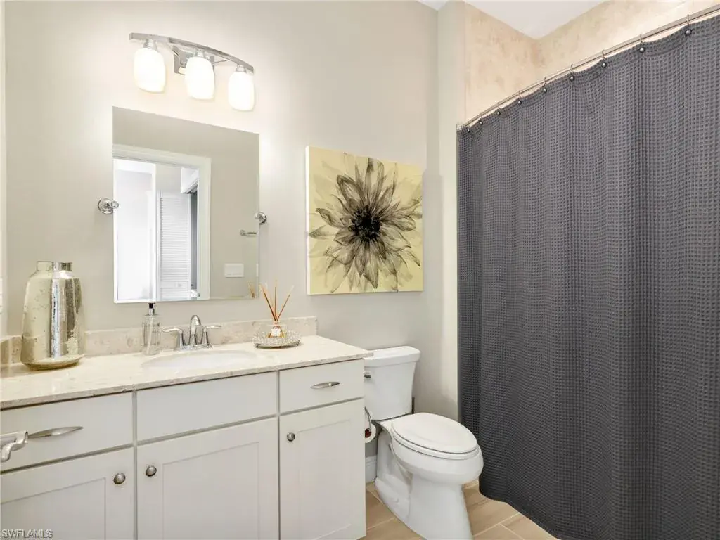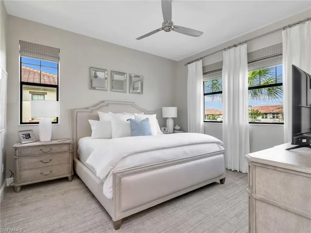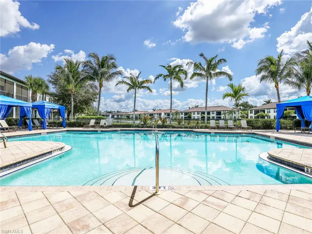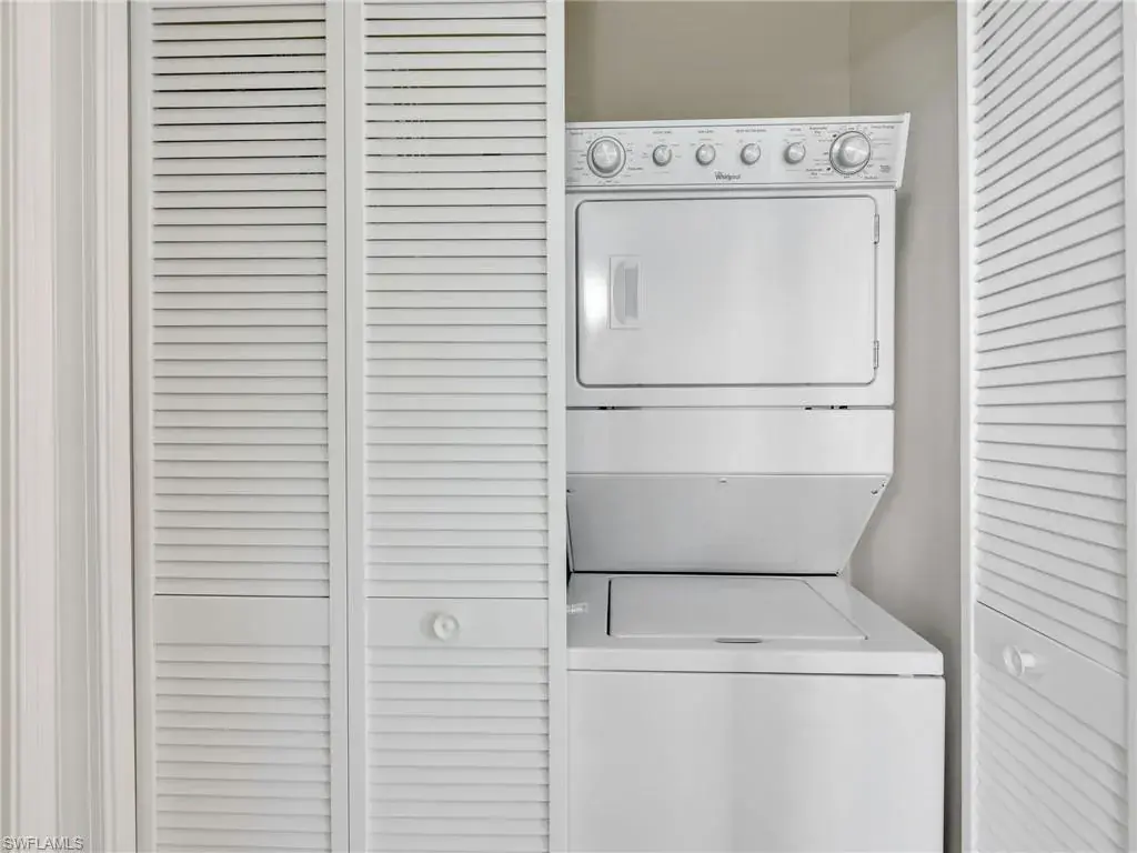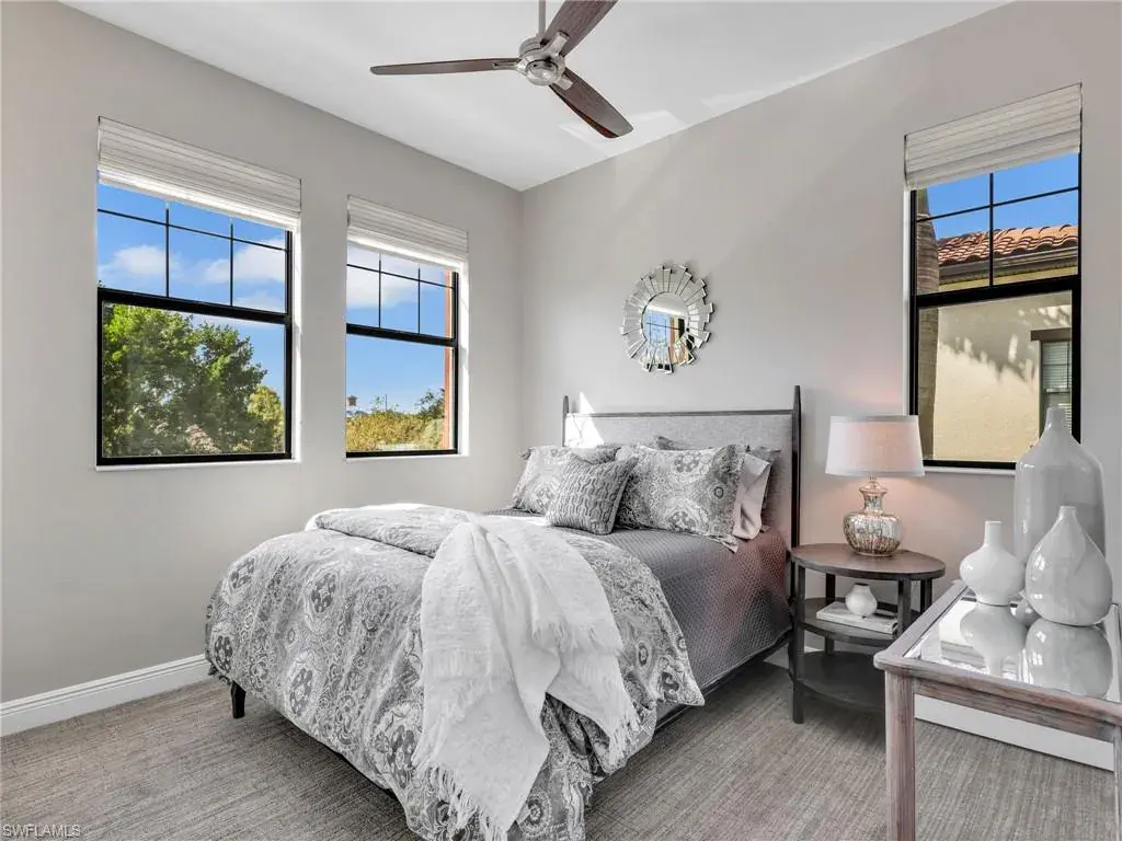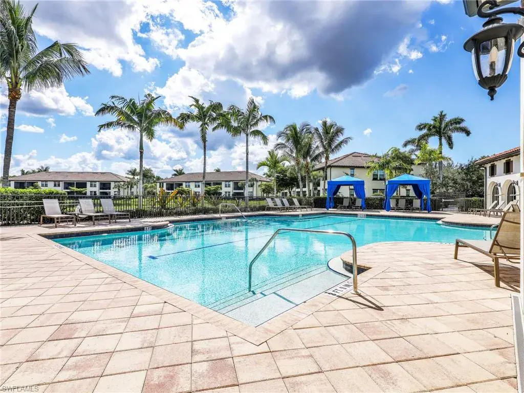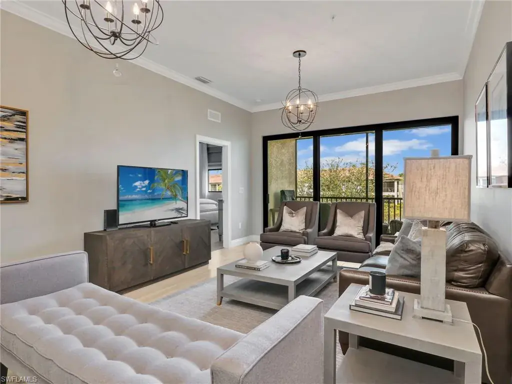 MUST SEE! This meticulous 3 bedroom, 2 bathroom second floor END UNIT condo offers tranquil lake views with a fountain and is ideally situated in the conveniently located gated community of Livingston Lakes in prime North Naples. Boasting 1,258 square feet of thoughtfully designed living space, this property features a split-bedroom floor plan, volume ceilings, and a tiled screened-in lanai that invites you to unwind with a peaceful morning coffee. The kitchen is both stylish and functional, showcasing white shaker cabinetry, granite countertops, a Blanco silgranit sink, stainless steel Whirlpool appliances—including a new refrigerator (2023) & a new dishwasher (2022), subway tile backsplash, soft close drawers, a pantry, breakfast bar, and an inviting eat-in kitchen area with an additional dining/living space for added versatility. The spacious primary suite offers a walk-in closet and an en-suite bathroom with granite countertops, glass shower enclosure, floor to ceiling tiled shower, upgraded mirror and vanity with drawers, while the guest bathroom impresses with quartz counters, upgraded mirror and a floor to ceiling tiled shower/tub combination. 12×24″ neutral tile flows through the main living areas & third bedroom (currently set up as an office), crown molding in the eat-in kitchen, kitchen & living area, perfectly paired with upgraded Karastan carpet & carpet pad in two bedrooms (2022), 3 Crystorama designer lighting fixtures in the living area and eat-in kitchen, and Hunter Douglas woven blinds throughout. Additional highlights include IMPACT RESISTANT windows and doors, a stackable washer and dryer, and neutral paint throughout. This condo comes with 1 assigned parking space plus 1 blank space in addition to guest parking. Low HOA fees include exterior insurance, internet, water, landscaping, irrigation and gated entry. Amenities include resort style pool with cabanas, fitness center, fireplace, grills and community room with kitchen. Very active community with food trucks on the 1st Friday of every month in season, dine arounds, holiday parties and many social events. Centrally located within walking distance to North Collier Regional Park and Seed To Table, easy access to I75 & all Immokalee Rd has to offer. Just 6 miles to the beach!