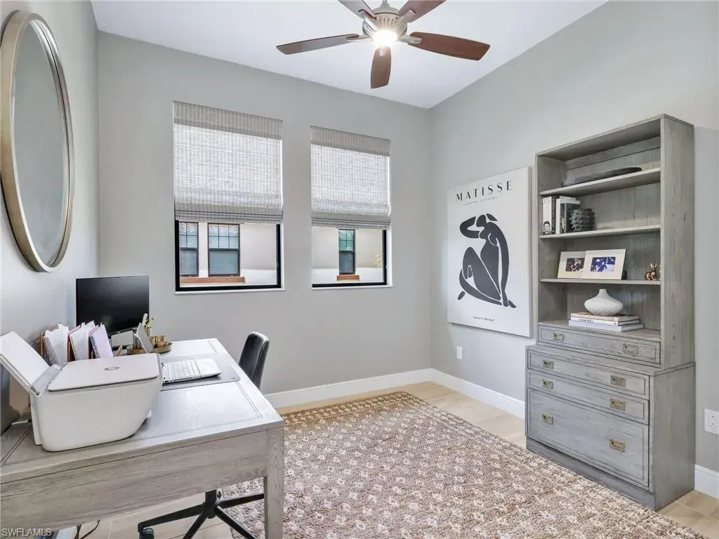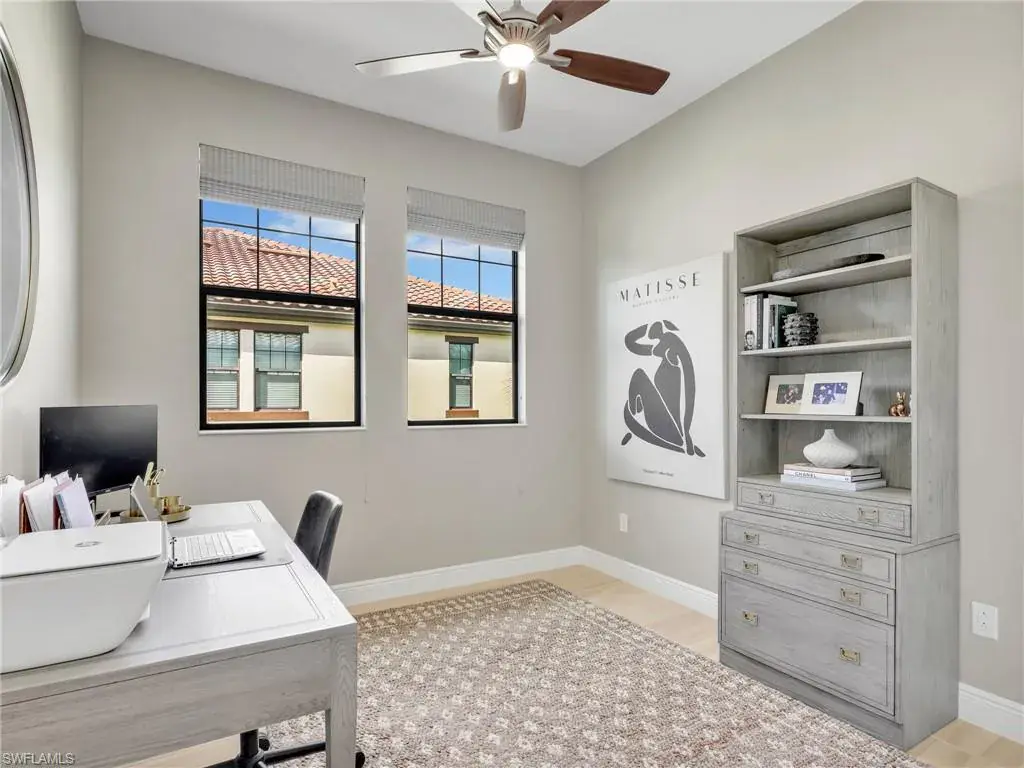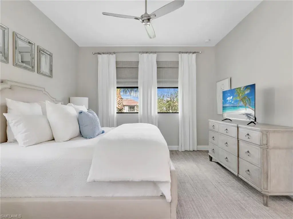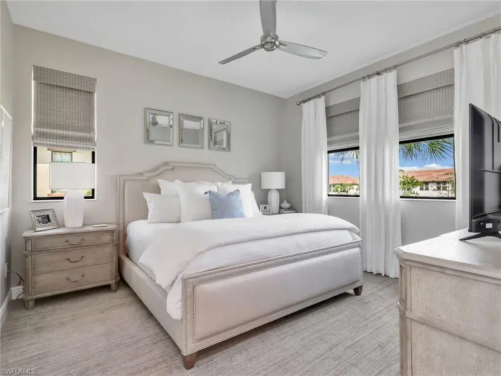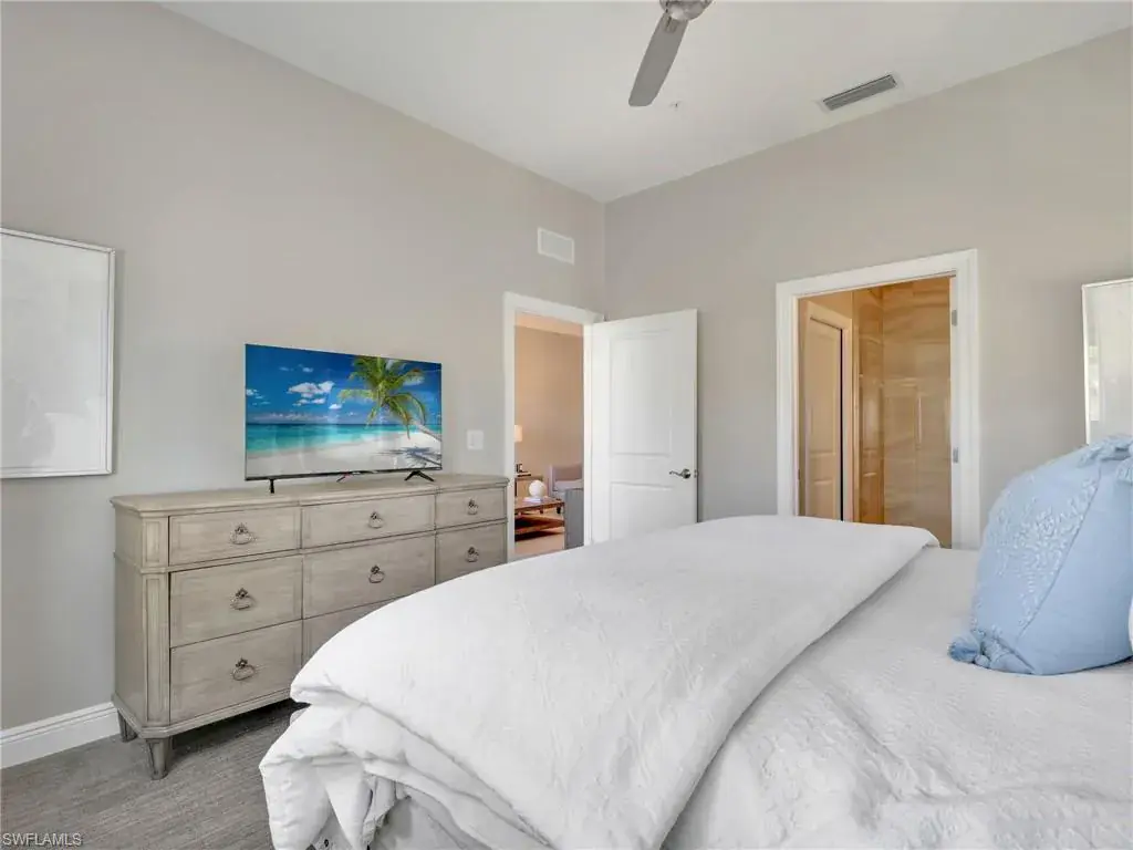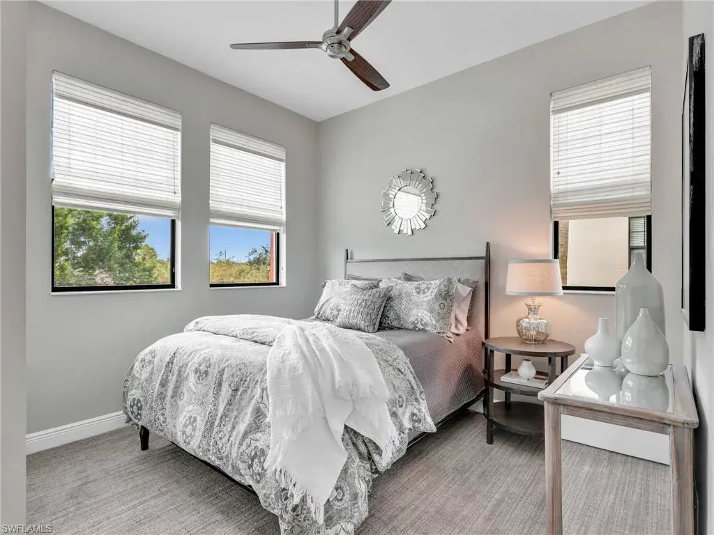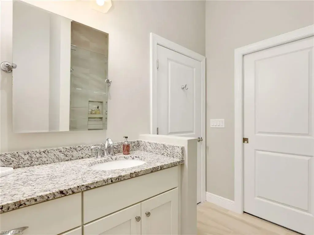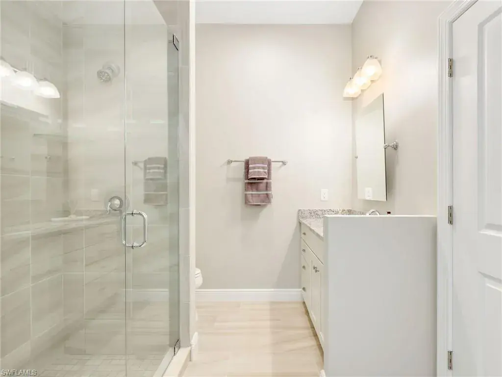 MUST SEE! This meticulous 3 bedroom, 2 bathroom second floor END UNIT condo offers tranquil lake views with a fountain and is ideally situated in the conveniently located gated community of Livingston Lakes in prime North Naples. Boasting 1,258 square feet of thoughtfully designed living space, this property features a split-bedroom floor plan, volume ceilings, and a tiled screened-in lanai that invites you to unwind with a peaceful morning coffee. The kitchen is both stylish and functional, showcasing white shaker cabinetry, granite countertops, a Blanco silgranit sink, stainless steel Whirlpool appliances—including a new refrigerator (2023) & a new dishwasher (2022), subway tile backsplash, soft close drawers, a pantry, breakfast bar, and an inviting eat-in kitchen area with an additional dining/living space for added versatility. The spacious primary suite offers a walk-in closet and an en-suite bathroom with granite countertops, glass shower enclosure, floor to ceiling tiled shower, upgraded mirror and vanity with drawers, while the guest bathroom impresses with quartz counters, upgraded mirror and a floor to ceiling tiled shower/tub combination. 12×24″ neutral tile flows through the main living areas & third bedroom (currently set up as an office), crown molding in the eat-in kitchen, kitchen & living area, perfectly paired with upgraded Karastan carpet & carpet pad in two bedrooms (2022), 3 Crystorama designer lighting fixtures in the living area and eat-in kitchen, and Hunter Douglas woven blinds throughout. Additional highlights include IMPACT RESISTANT windows and doors, a stackable washer and dryer, and neutral paint throughout. This condo comes with 1 assigned parking space plus 1 blank space in addition to guest parking. Low HOA fees include exterior insurance, internet, water, landscaping, irrigation and gated entry. Amenities include resort style pool with cabanas, fitness center, fireplace, grills and community room with kitchen. Very active community with food trucks on the 1st Friday of every month in season, dine arounds, holiday parties and many social events. Centrally located within walking distance to North Collier Regional Park and Seed To Table, easy access to I75 & all Immokalee Rd has to offer. Just 6 miles to the beach!
