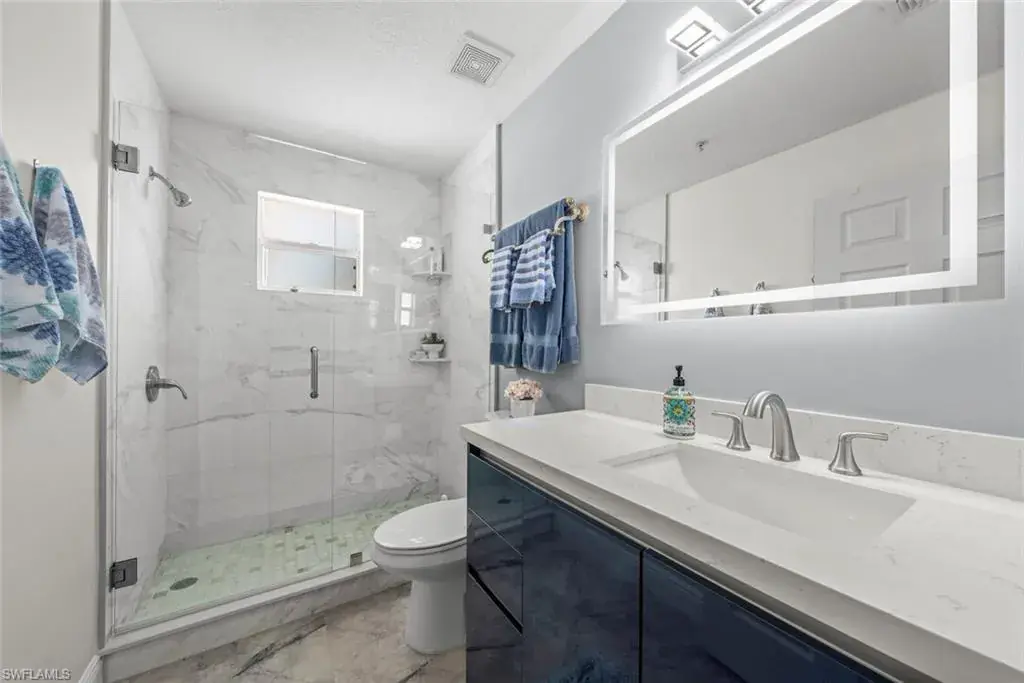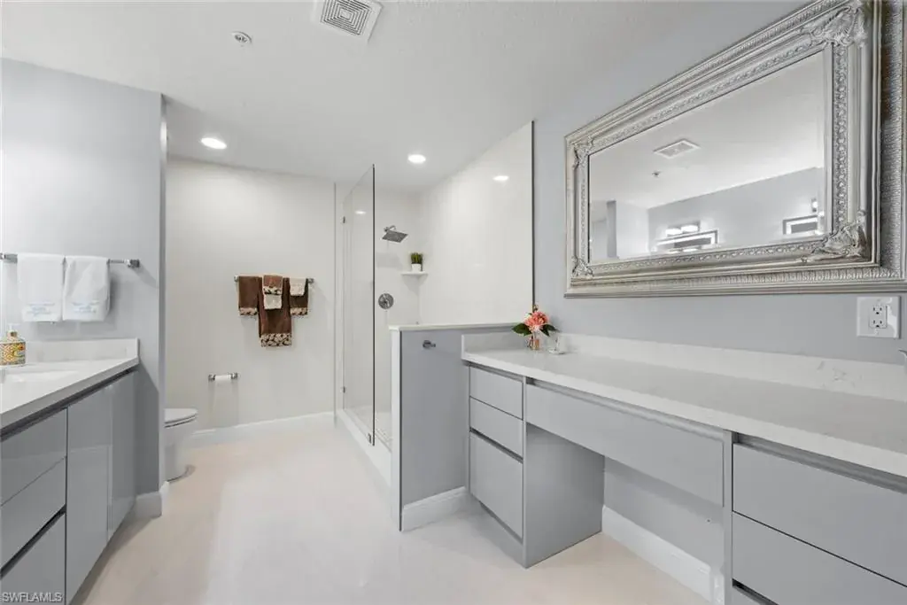 Inside, the open-concept layout invites you to unwind and enjoy modern comfort. The updated kitchen and baths feature sleek quartz countertops, stylish cabinetry, and contemporary fixtures. Your spacious primary suite offers a custom large walk-in closet and a spa-inspired bathroom with dual sinks and a glass-enclosed shower. Throughout the home, you’ll find luxury vinyl flooring, plantation shutters, and vaulted ceilings that create a light and airy ambiance.