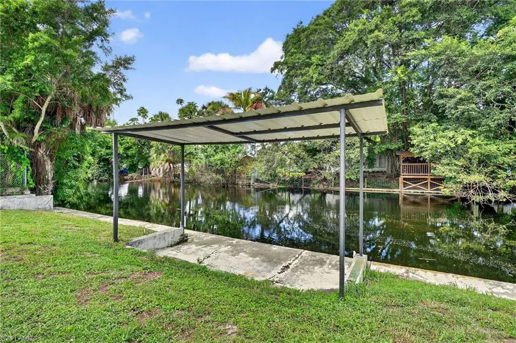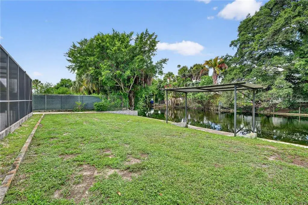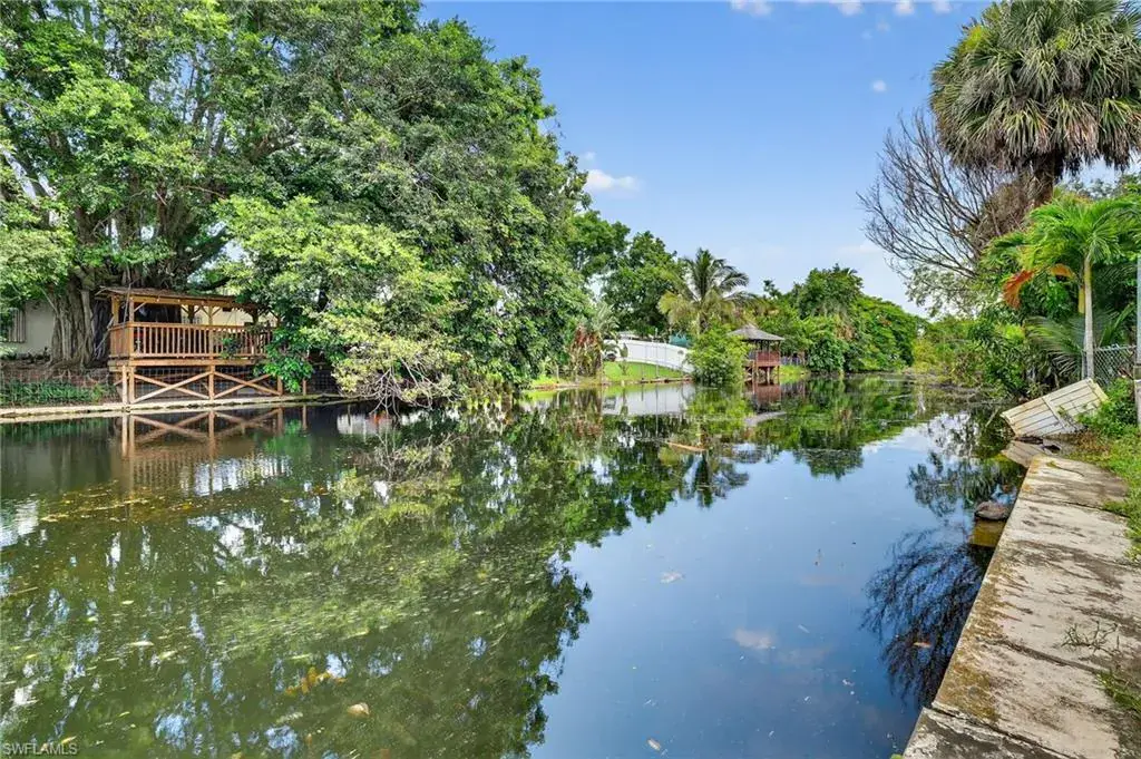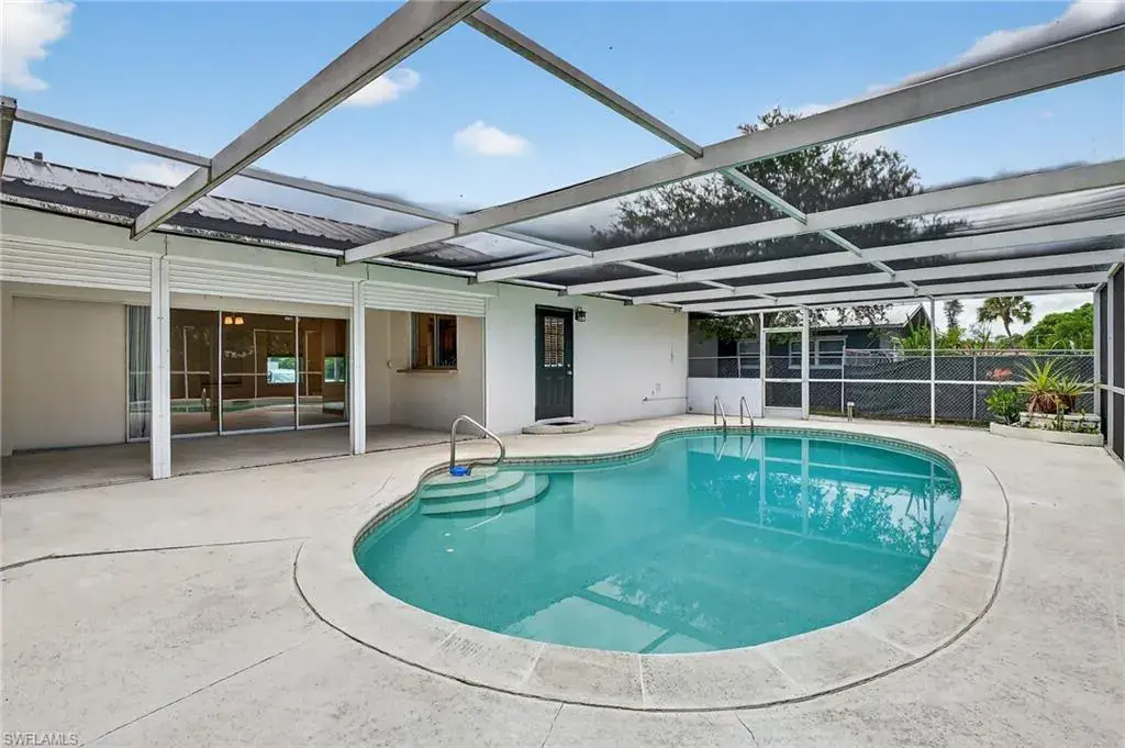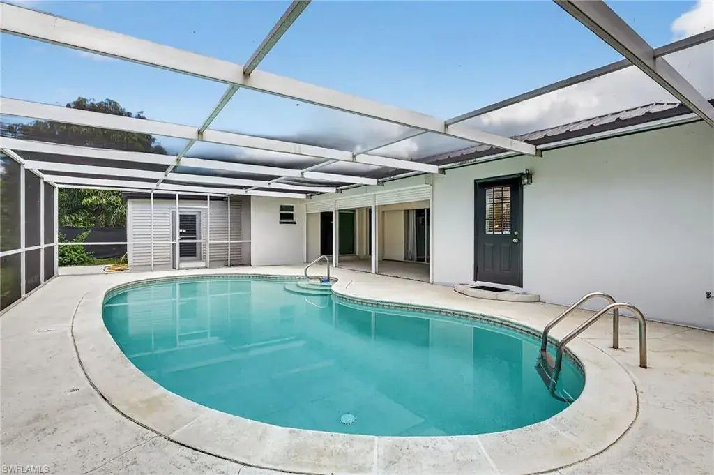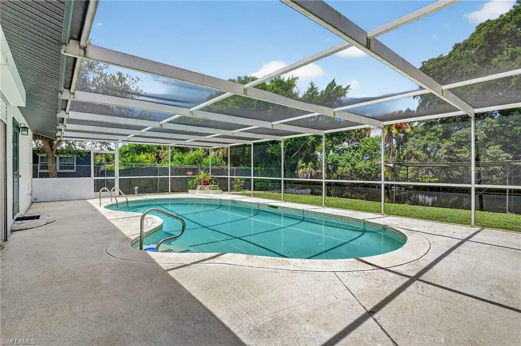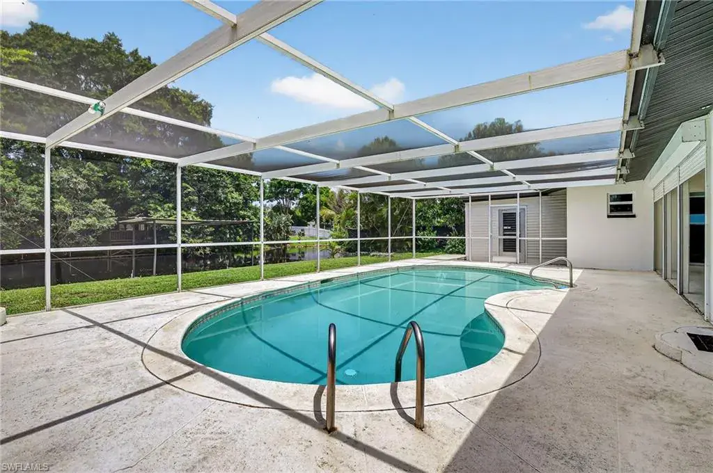 Enjoy serene canal-front living in this beautifully updated 3-bed, 2-bath pool home. Nestled among mature trees, the peaceful backyard features a custom gazebo overlooking the water—perfect for fishing, quiet mornings with coffee, or simply soaking in the tranquil setting. Recent upgrades include a new AC and pool pump (2024), fresh paint, impact windows (2020), and a metal roof. Inside, natural light fills the open living area with tile and wood plank flooring. The kitchen offers solid wood cabinets, recessed lighting, and a pass-through to the lanai. The owner’s suite includes pool access, a walk-in closet, and a private bath with walk-in shower and bidet. Two guest rooms share a pool bath with tub/shower combo. A fenced yard, concrete seawall, and deep one-car garage complete this peaceful retreat—just minutes from Naples’ top shopping, dining, and beaches.