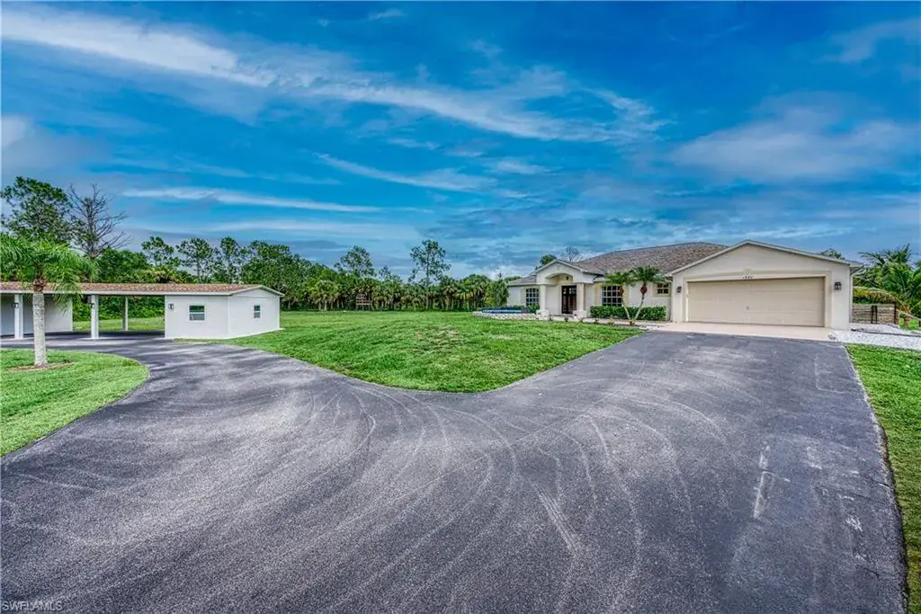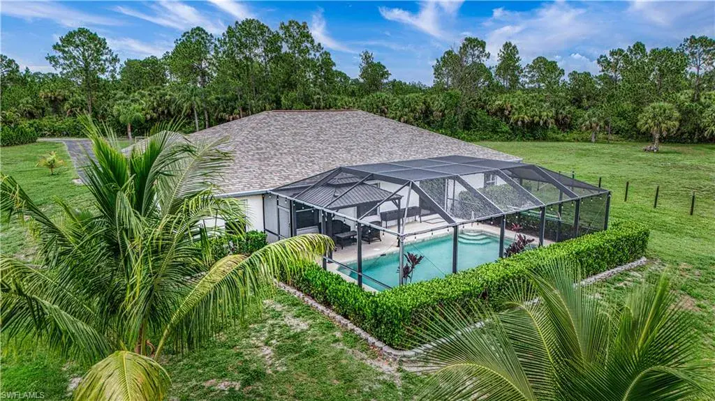 Welcome to your quiet and secluded oasis tucked away on nearly 5 private acres backing up to a quarry. The asphalt circular driveway brings you to a stunning 3bed+ den, 2 bath pool home. Upon entrance you have french doors leading to the spacious den and with an adjacent cozy family room. The recently renovated kitchen is a show stopper with quartz counter tops, Kitchen Aid appliances, and reverse osmosis system. The generously sized great room features vaulted ceilings and hurricane impact sliders taking you out to the caged lanai with sparkling salt water pool. The immense primary suite with new flooring offers a substantial walk-in closet, and partially renovated bathroom. Two sizable guest bedrooms and full bathroom remain. The laundry room is highlighted with newer washer and dryer and custom wall tile detail. The perimeter of the property is partially fenced while a portion of the lot surrounding the pool is completely fenced. Multiple storage units sit on the property along with a recently constructed structure offering 3 carports and two more storage units. Plenty of room for all your storage needs and wants. Able to subdivide the land.