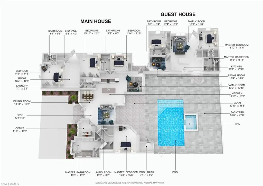 Stunning Multi-Generational Estate with Endless Possibilities! Discover this rare, brand-new multi-functional home designed to meet the needs of modern living, offering up to 8 bedrooms (configurable) and 6 bathrooms, including a fully equipped 3-bedroom guesthouse. With almost 4,100 sqft of air-conditioned living space and an expansive 1,500 sqft screened lanai featuring a pool, spa, and outdoor bathroom, this property is perfect for entertaining and relaxation. An AC-cooled two-car garage (attached) or a 3+ car garage (detached) are included in the price and can be specified to buyers’ needs.