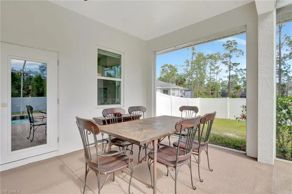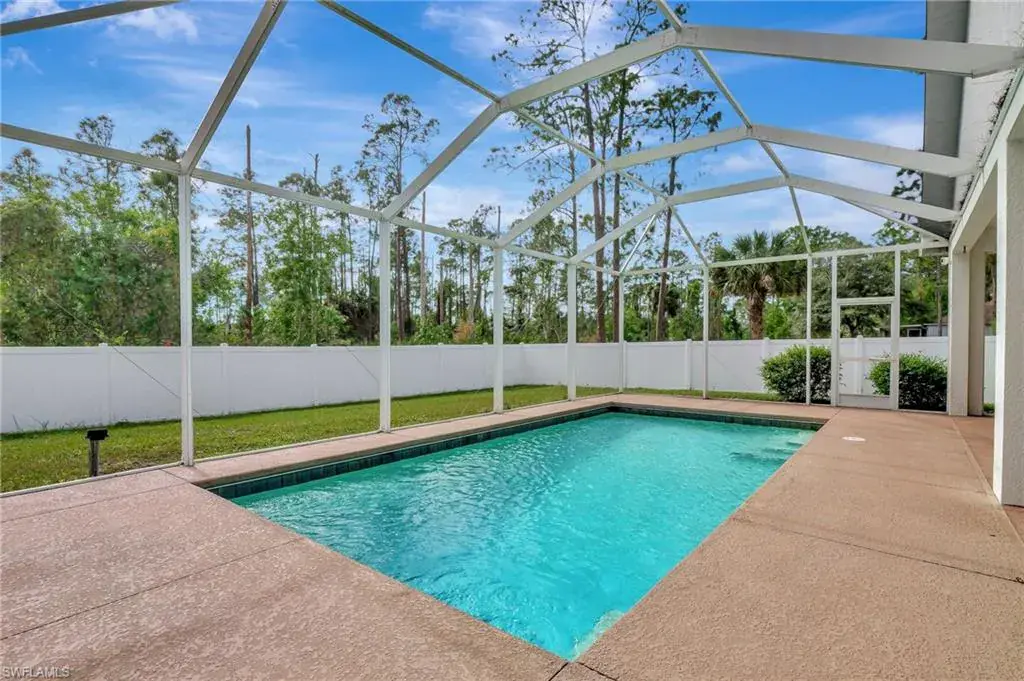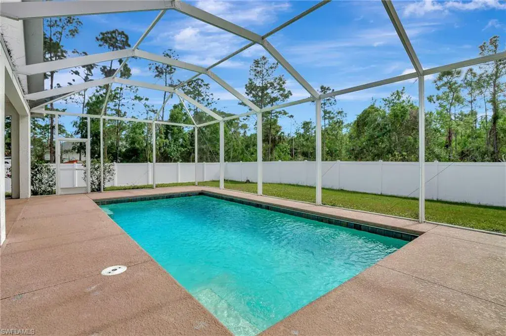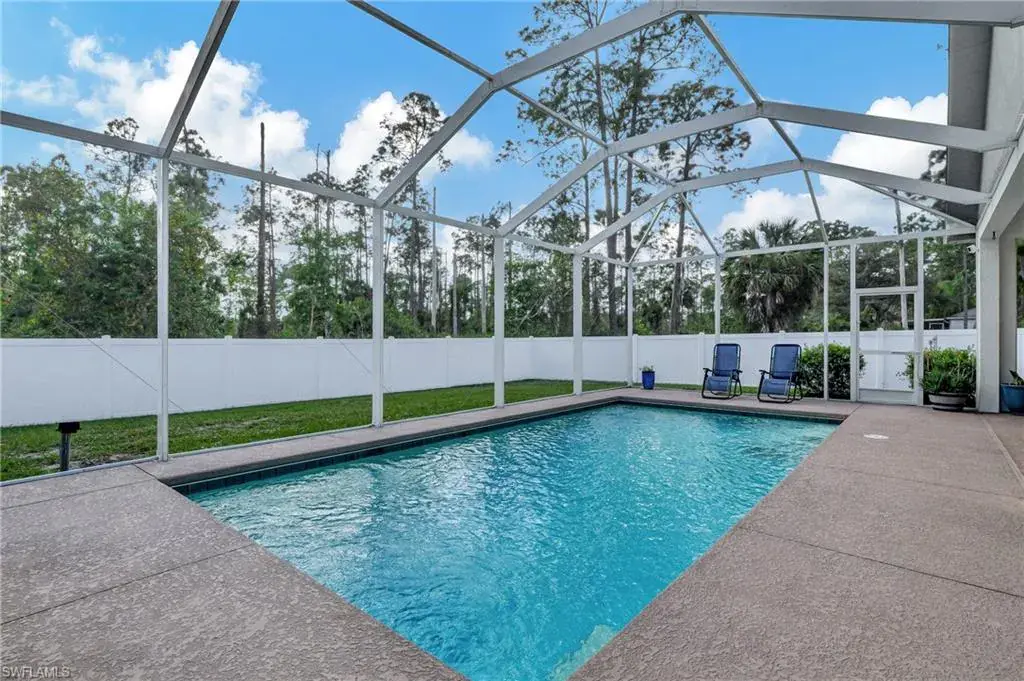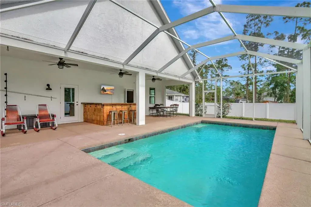 Outdoor Oasis: The screened lanai with a large heated pool, sunbathing deck, and built-in cement bar offer the perfect space for relaxation and entertainment. Enjoy a view of the expansive backyard, complete with a 6′ high fenced-in section, ideal for children and pets.