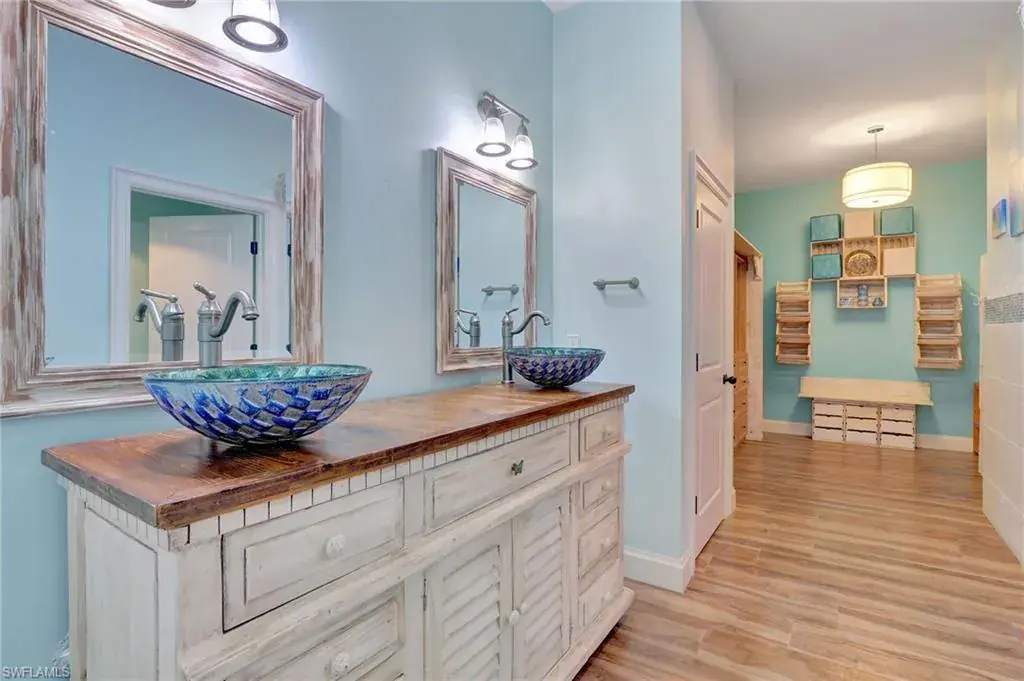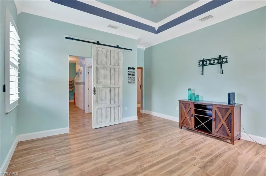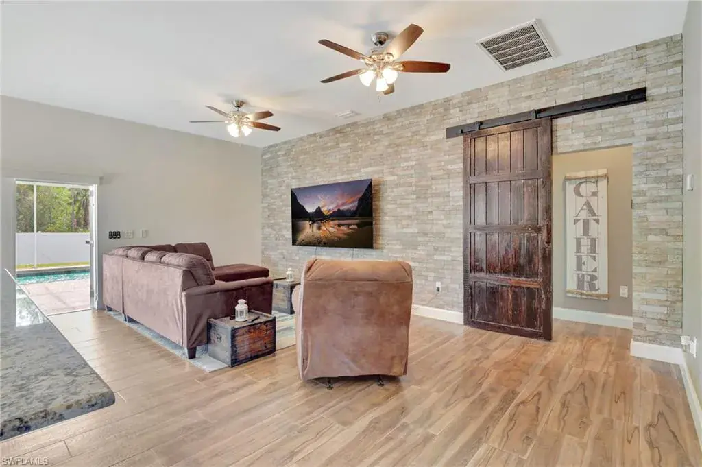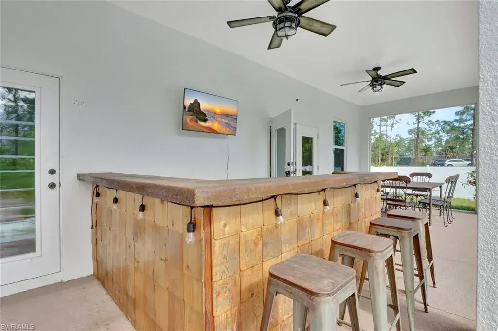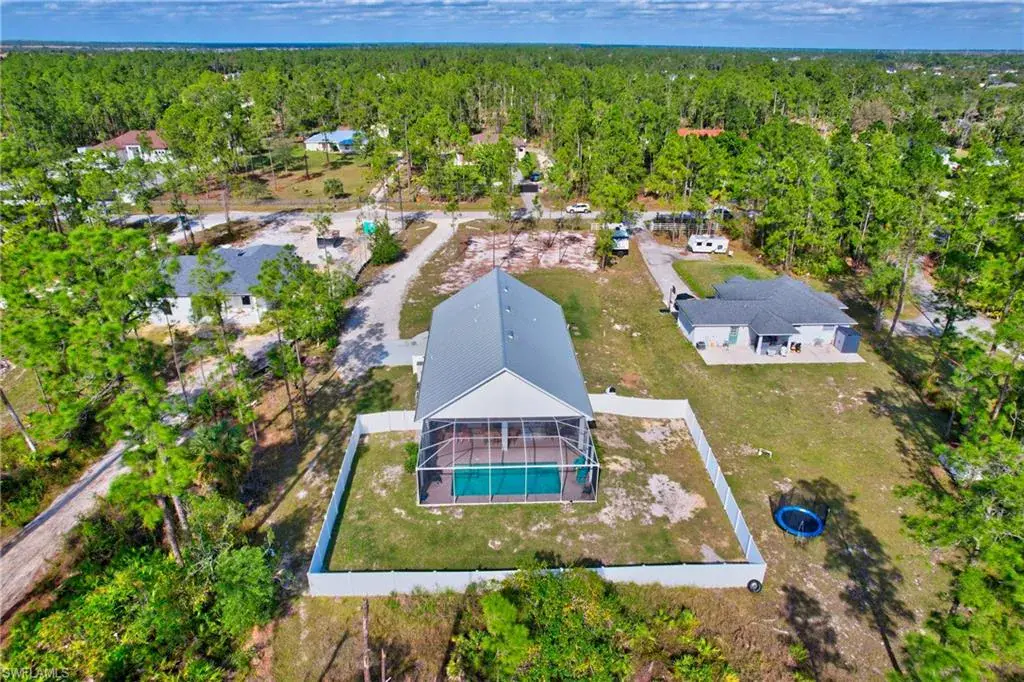 Outdoor Oasis: The screened lanai with a large heated pool, sunbathing deck, and built-in cement bar offer the perfect space for relaxation and entertainment. Enjoy a view of the expansive backyard, complete with a 6′ high fenced-in section, ideal for children and pets.