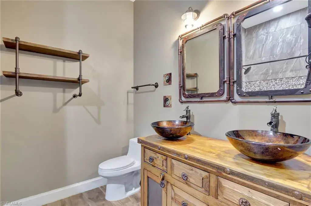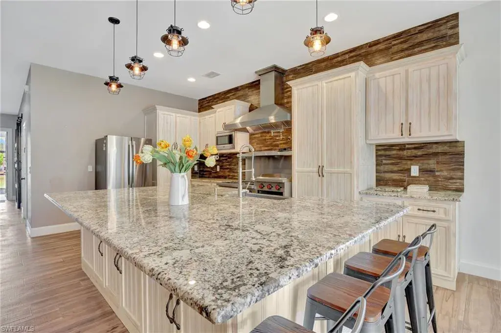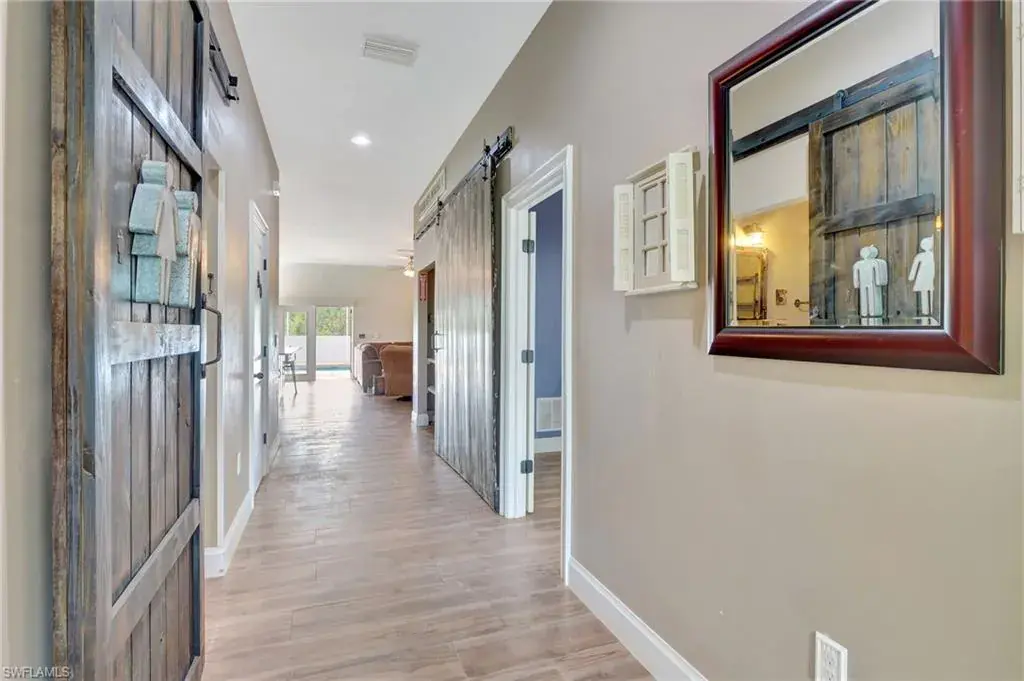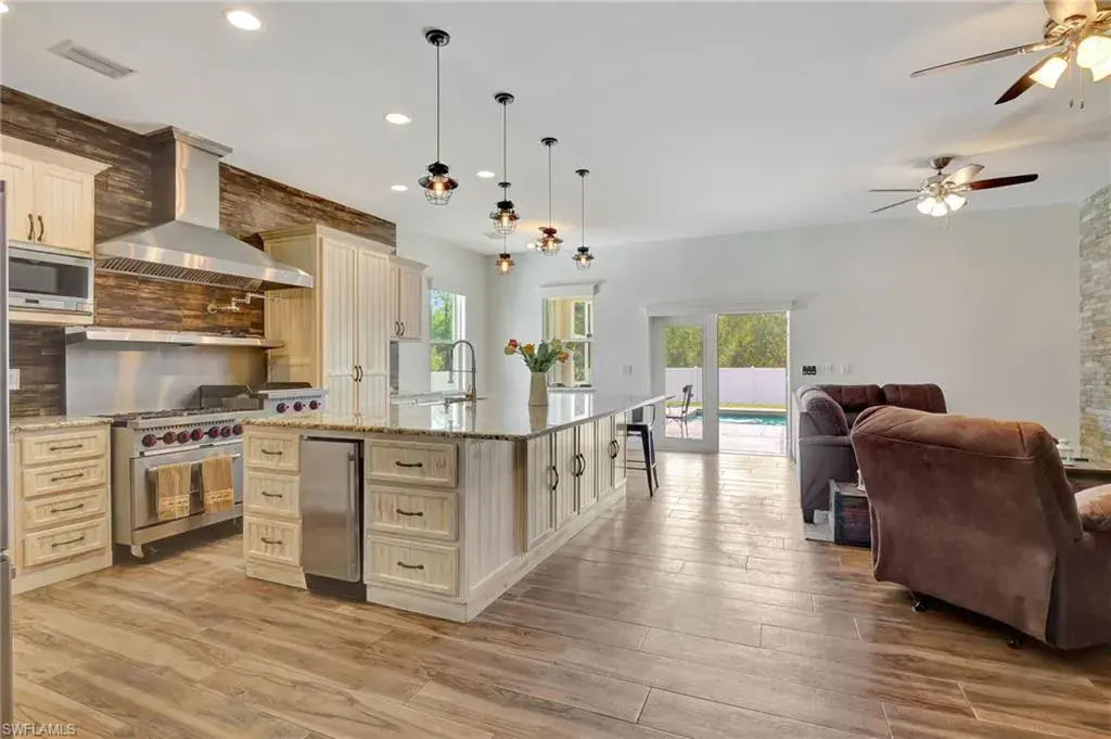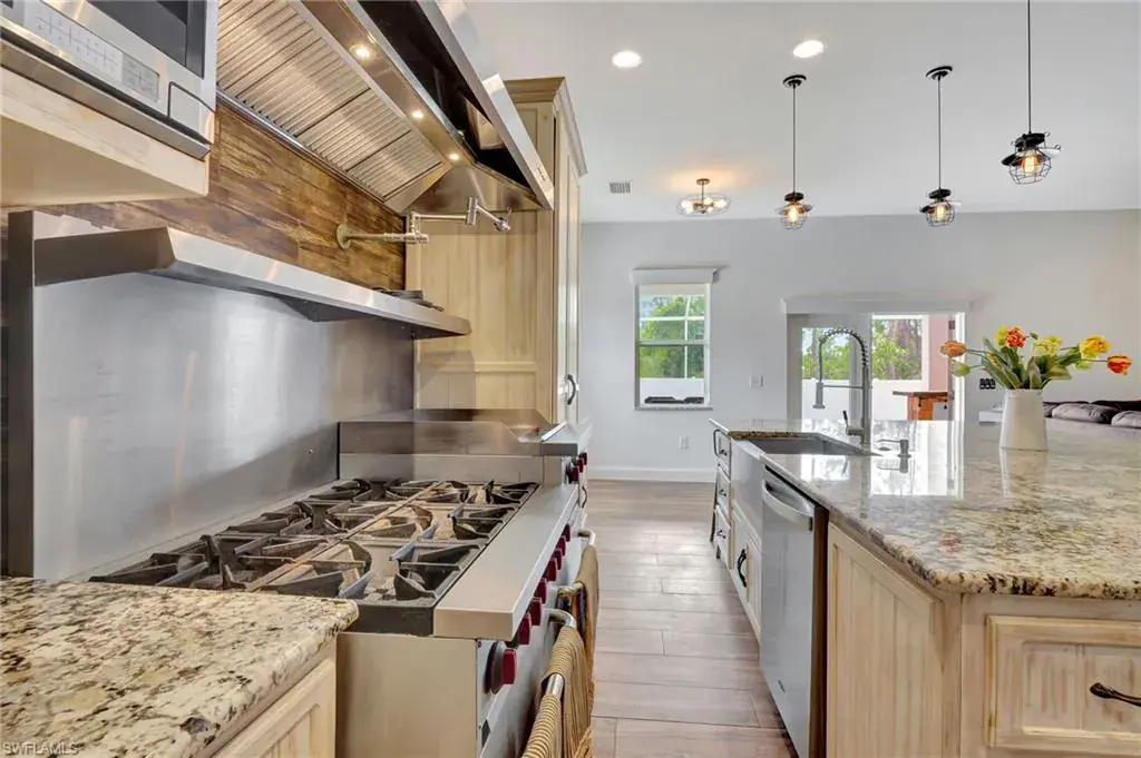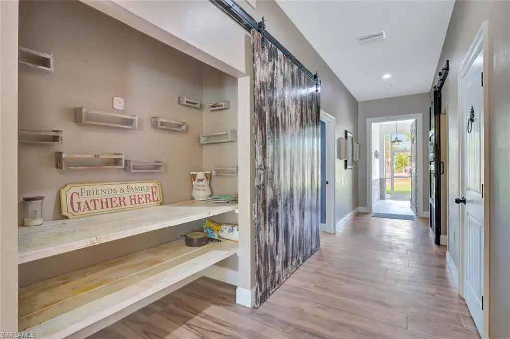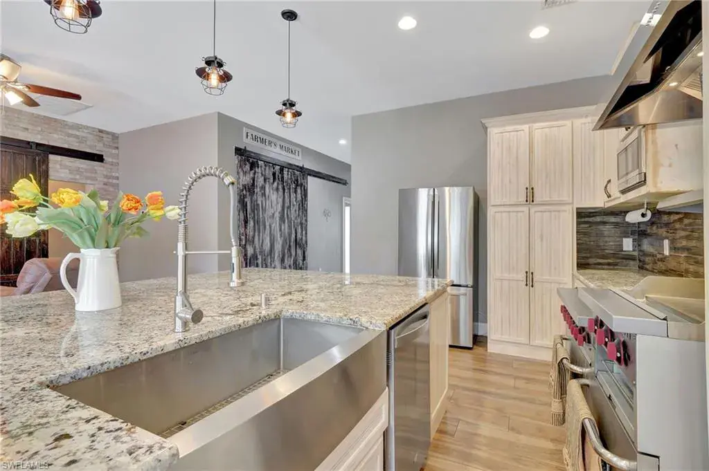 Chef’s Gourmet Kitchen: Equipped with a 6-burner, 2-oven industrial gas stove with a vented hood, pot filler, custom cabinetry, a 10×6 island with cabinet storage, ice maker, farm sink, and a pantry with charming barn doors—ideal for culinary enthusiasts.