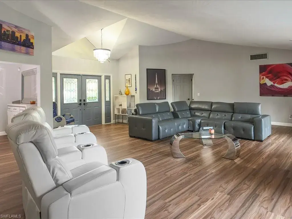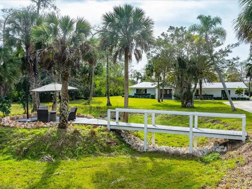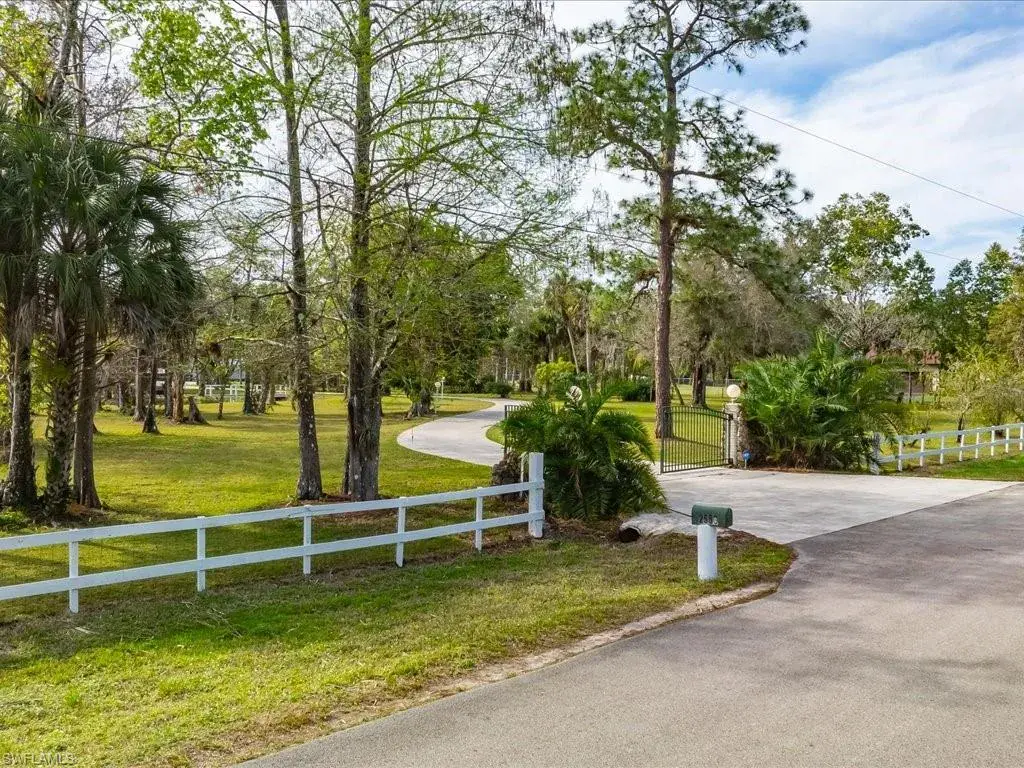 This uniquely designed custom home sits on a 5-acre “high and dry” estate. The park like setting features a gated entry to this fully fenced and cleared property. The floor plan surrounds the courtyard area and has many recent updates. The upgraded kitchen has gas and electric cooking, water purification in addition to storage and counter space ideal for the professional or at home chef. The home is freshly painted, exterior and interior. Other features include ADT security system, new luxury vinyl wood flooring, doors & hardware, new lighting fixtures, fans, impact resistant windows, custom impact garage door, whole house water softener, on demand hot water, 500-gallon propane tank. Primary bedroom has a vaulted ceiling, primary bathroom has updated cabinetry and granite countertops. The home is wired for a generator. Electric car charging station, garden and a fire pit area with bridge. Looking for a property where you can have all your toys and space to still enjoy a pool addition, this is the ideal home for you.