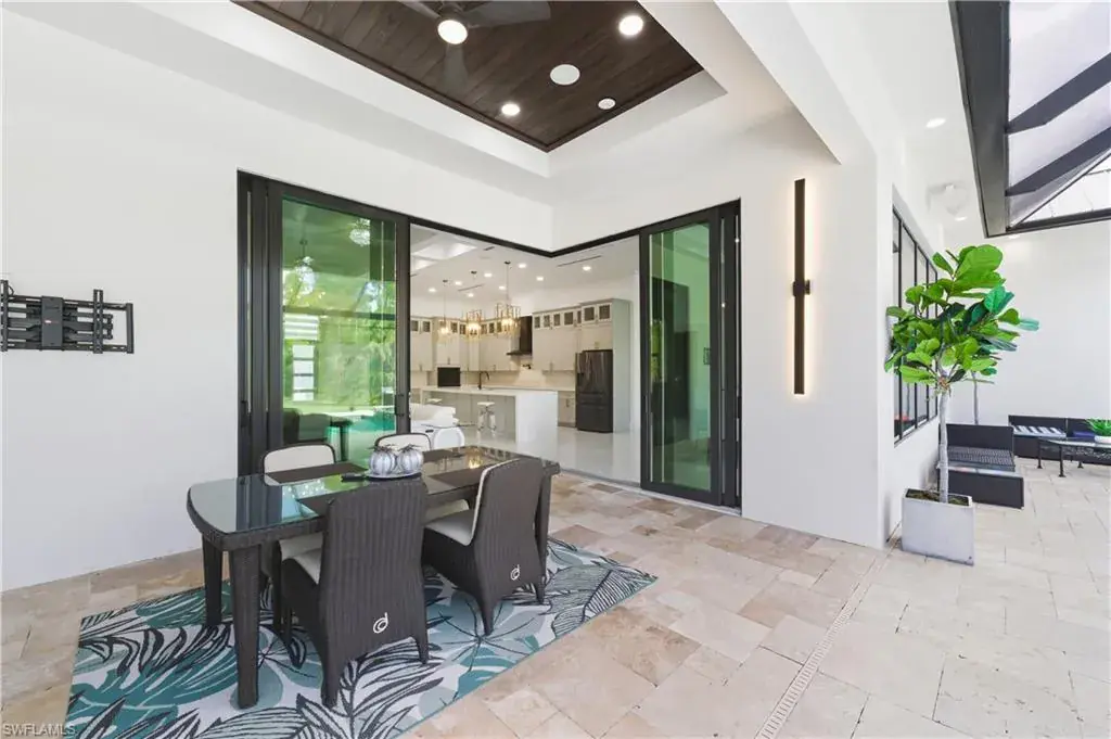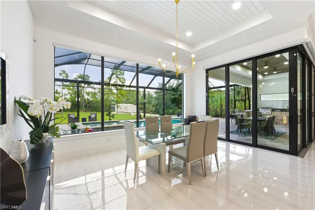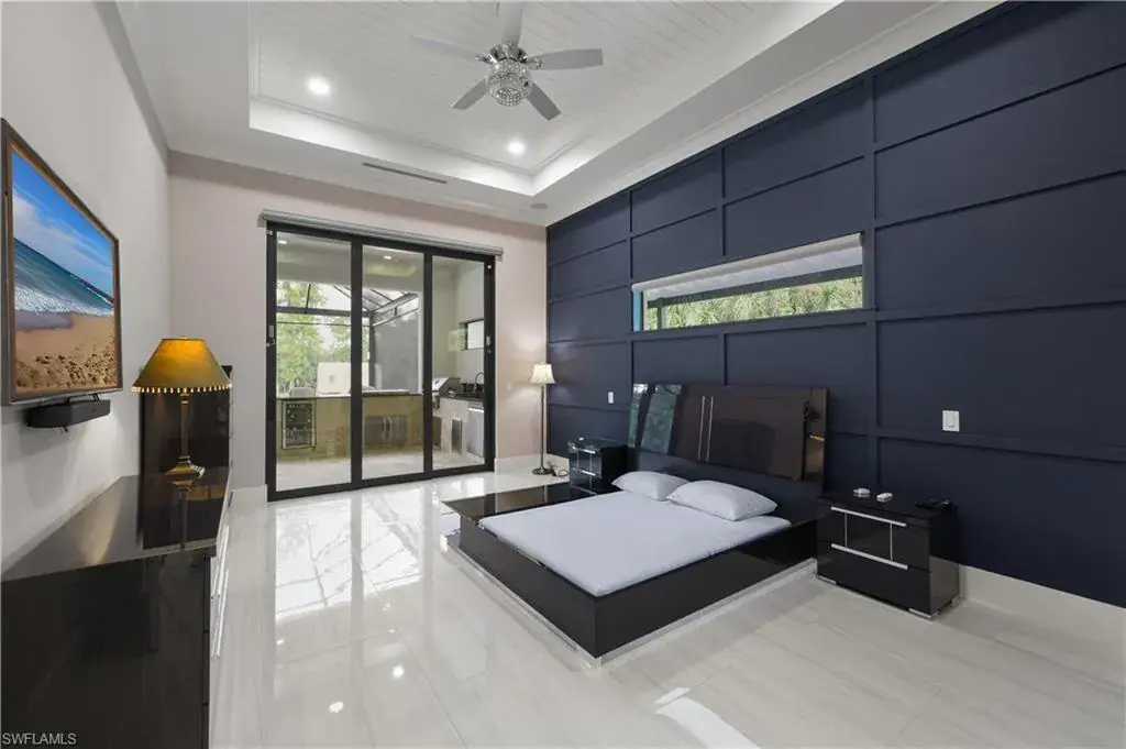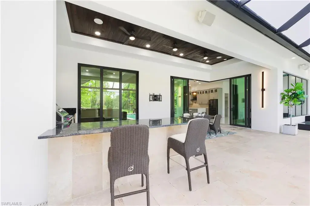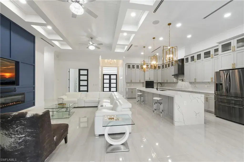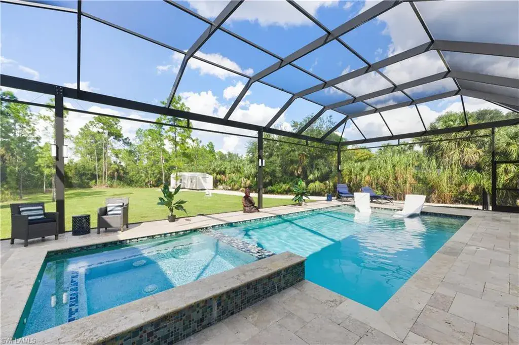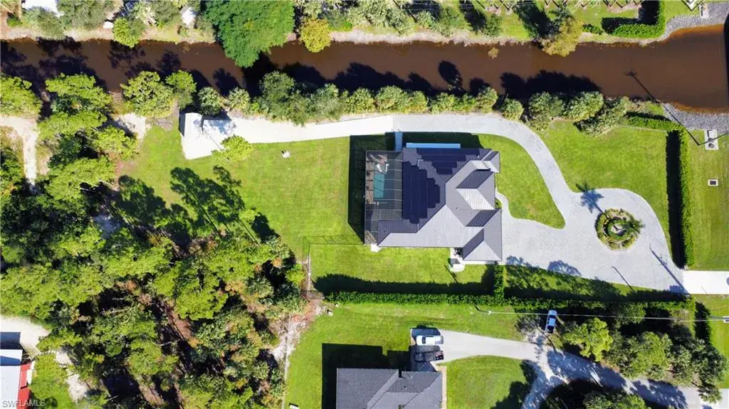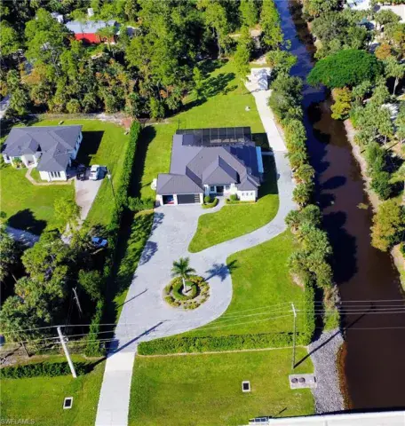 Experience unparalleled luxury and privacy in this custom-built 4-bedroom plus Den, 3-bathroom contemporary estate, perfectly set on 100% upland, 2.74 gated acres along a tranquil canal in Golden Gate Estates. Completed in 2021, this home boasts exceptional infrastructure including a resilient metal roof, energy-efficient solar panels, and a whole house generator for complete peace of mind. For ultimate protection, the entire home features impact doors and windows. The property offers an impressive and secure entrance with a private gate and an expansive pavered wrap around driveway. The heart of the home is the upgraded chef’s kitchen, featuring a large island and a large walk-in pantry, perfect for gourmet cooking. The magnificent interior showcases high ceilings and beautiful coffered ceilings throughout. The massive primary suite provides a true sanctuary, complete with a huge walk-in closet with a dedicated sitting area. Modern convenience is further enhanced by a tankless water heater. Outdoor living is elevated with a screened lanai, pool, spa, and a complete outdoor kitchen. The grounds feature a private fenced area, ideal for pets or play, and offer exclusive walking trails through the back acreage. Car enthusiasts will love the oversized 3-car garage, converted into an air-conditioned “dream garage,” complemented by two additional air-conditioned storage units for climate-controlled storage. This estate is a rare find, combining expansive acreage, high-end upgrades, and waterfront.