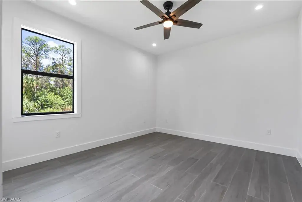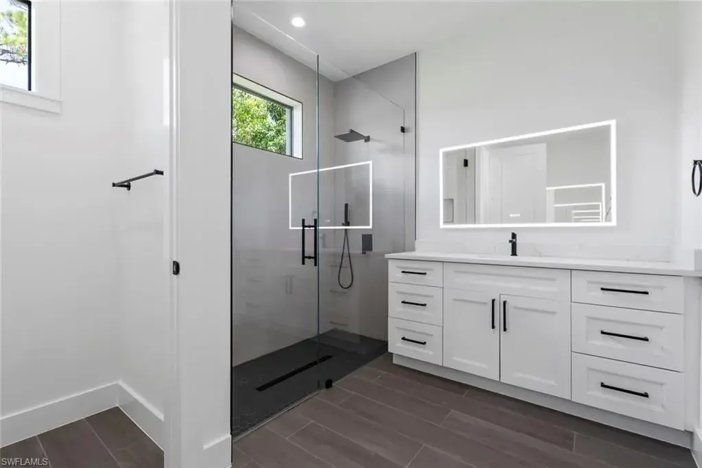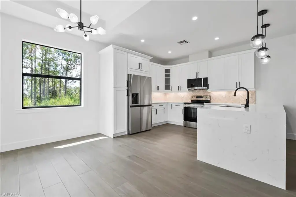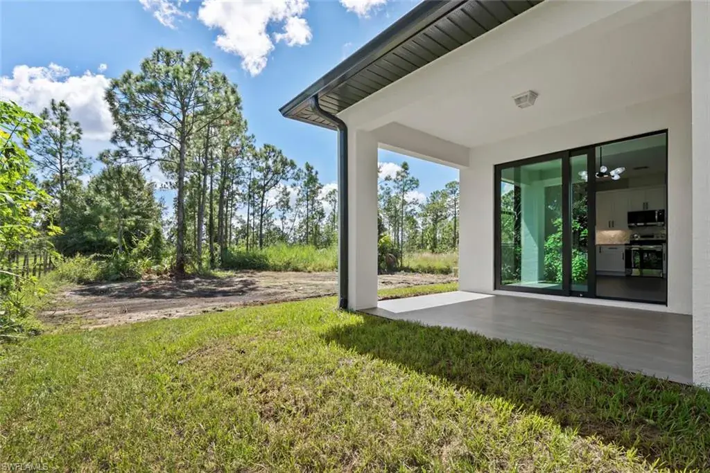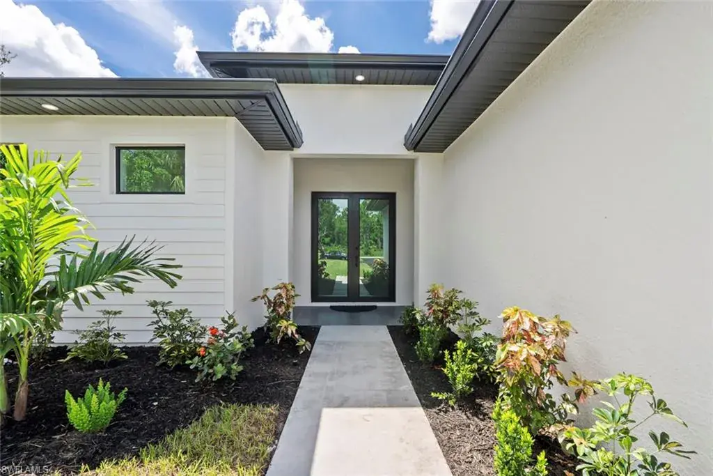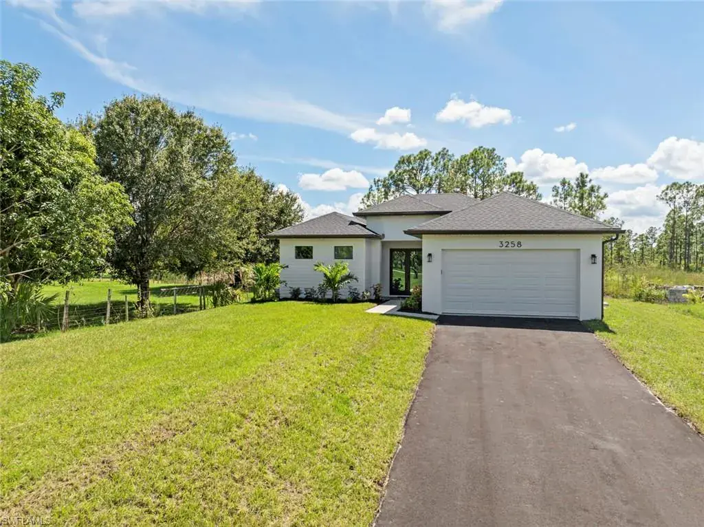 Welcome to your dream home in Naples, Florida! This stunning new construction is 100% completed and offers 3 bedrooms and 2 baths on a 1.14 acres lot that is 100% uplands! The kitchen is equipped with LG stainless steel appliances, 42″ wood cabinets, and striking quartz waterfall countertops with under cabinet lighting offering a unique combination for cooking and entertaining. Porcelain tile floors throughout the home add a touch of elegance and sophistication. The primary suite is a luxurious retreat, featuring dual walk-in closets, dual vanities, and an walk-in shower with tempered glass. On the other side of the home, you’ll find two additional spacious bedrooms and a guest bathroom. This property includes exceptional upgrades, such as: hurricane impact-resistant windows and doors, a whole-house reverse osmosis system and full broadcast epoxy garage floors!