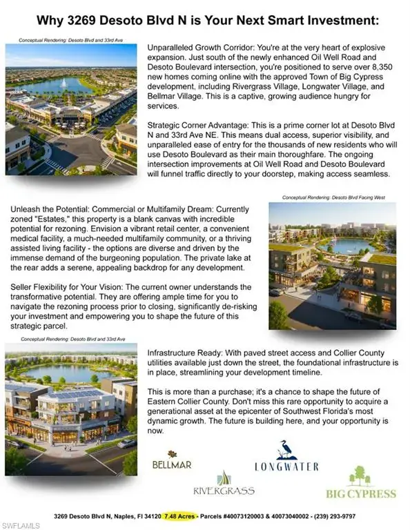 Discover an unparalleled Development Site at Desoto Blvd N and Oil Well Road, the strategic heart of Collier County’s Booming New villages (Skysail, Rivergrass, Longwater, Bellmar, Big Cypress). This Expansive 7.48-acre Corner parcel boasts 1,157 linear feet of combined Road Frontage.