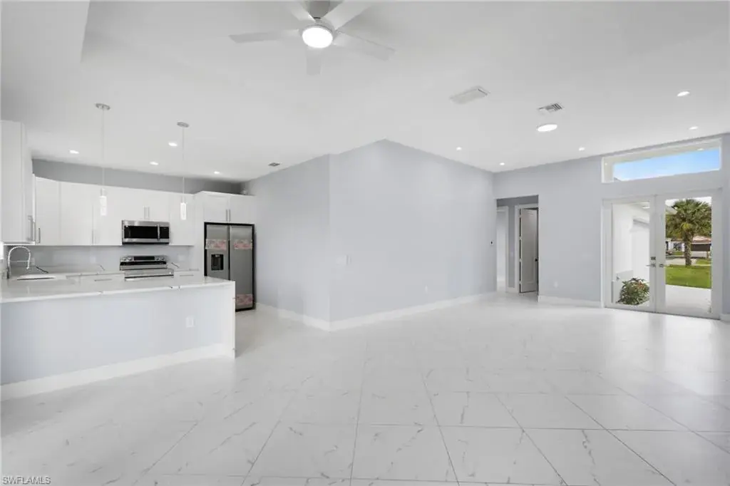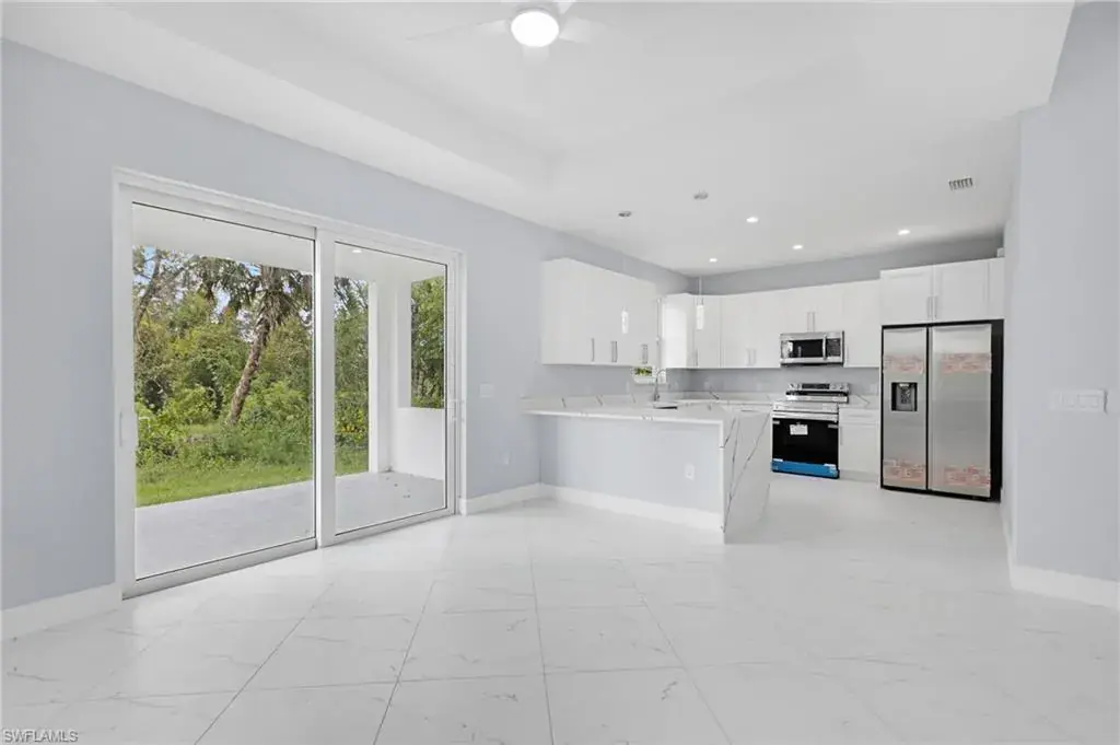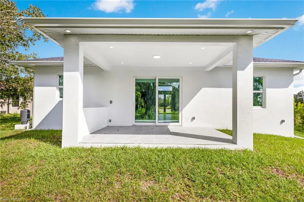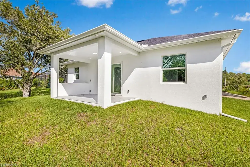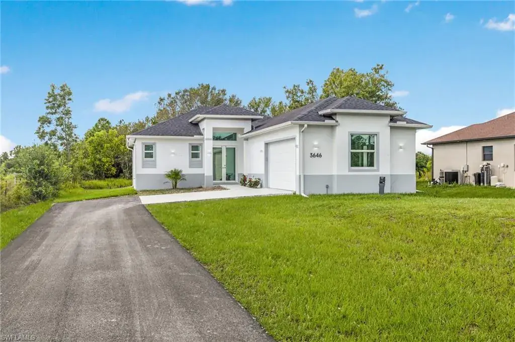 Spacious new construction home for sale in Golden Gate Estates with great transportation access! 3 bedroom, 2 bathroom, laundry room, 2 car garage, porch and screened lanai under roof. The house offers big living room, wrap around kitchen with quartz waterfall countertops and stainless appliances, high multi-level ceilings, LED lighting throughout, beautiful tile floors everywhere, impact windows and doors with thermal tint, remote controlled fans, all located on a 100% UPLAND 1.14 acre lot with driving back yard access. Partial lake views, concrete parking pad, paved driveway and so much more. Situated in Golden Gate Estates with no HOA and zero restrictions. Lots of space for a pool, workshop and all your toys! The area is booming with new infrastructure: new plaza with shops and restaurants is coming to Immokalee Rd and Randall Blvd, new Publix is soon to open on Oil Well Rd, new schools are coming to the area. This home is eligible for 100% USDA financing for qualified buyers.