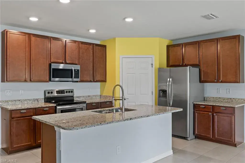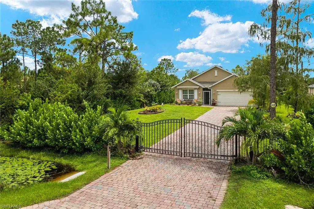 Discover your dream home in the prestigious Golden Gate Estates neighborhood, a tranquil and spacious retreat nestled on a serene dead-end street. This move-in-ready residence, completed in 2018, offers an exceptional opportunity to own one of the most affordable four-bedroom, two-bath homes in the area. Set on a 1.14-acre fully fenced lot, this property provides space for pets, children, and outdoor activities. The open-concept kitchen comes equipped with stainless steel appliances, granite countertops, and tile flooring and is designed for both entertaining and comfortable living. The home features a layout with a two-car garage, a screened-in lanai, and a large backyard perfect for enjoying the Florida lifestyle. A durable brick-paved driveway enhances the curb appeal, leading up to the garage. The property also boasts a variety of fruit trees, plants, and raised garden beds, ideal for growing your own produce. This home is just minutes from Publix, top-rated schools, and parks. This neighborhood features low density living and NO HOA fees. Don’t miss the opportunity to make this property your own.