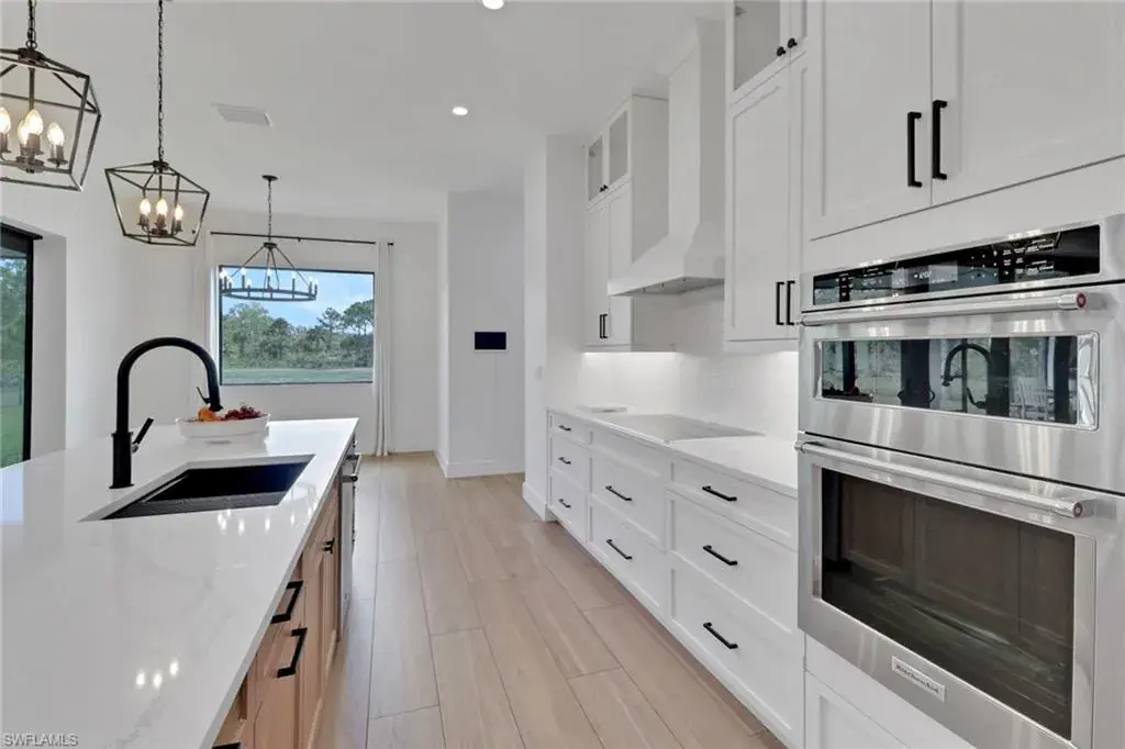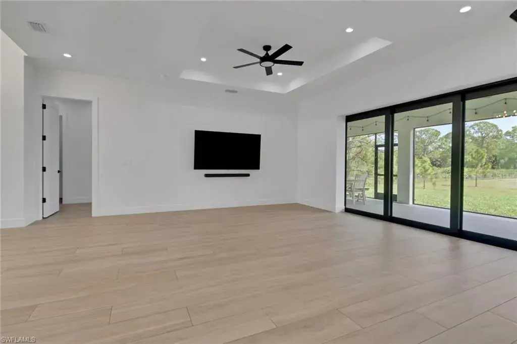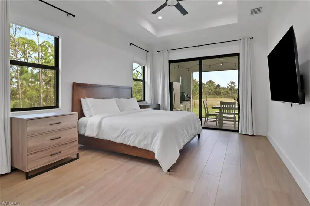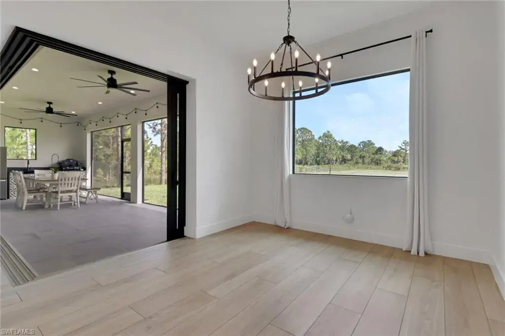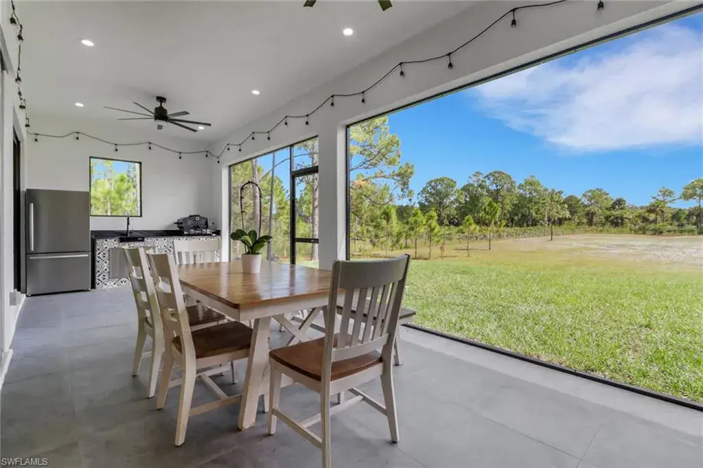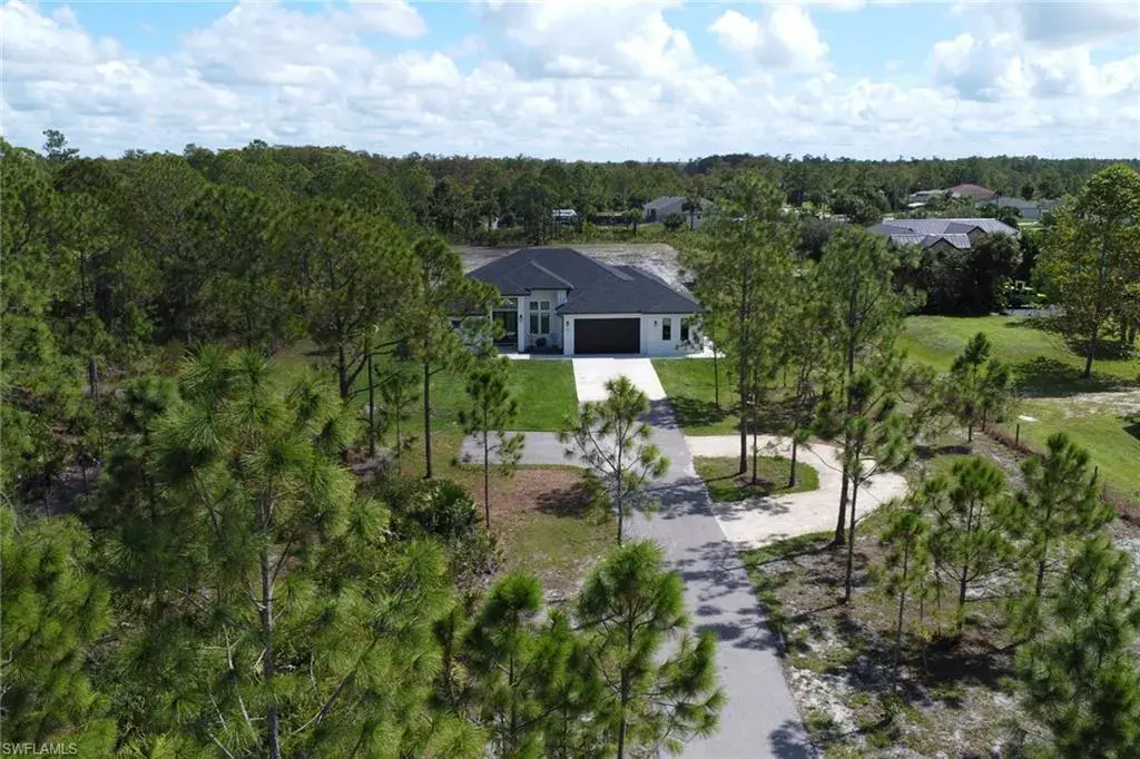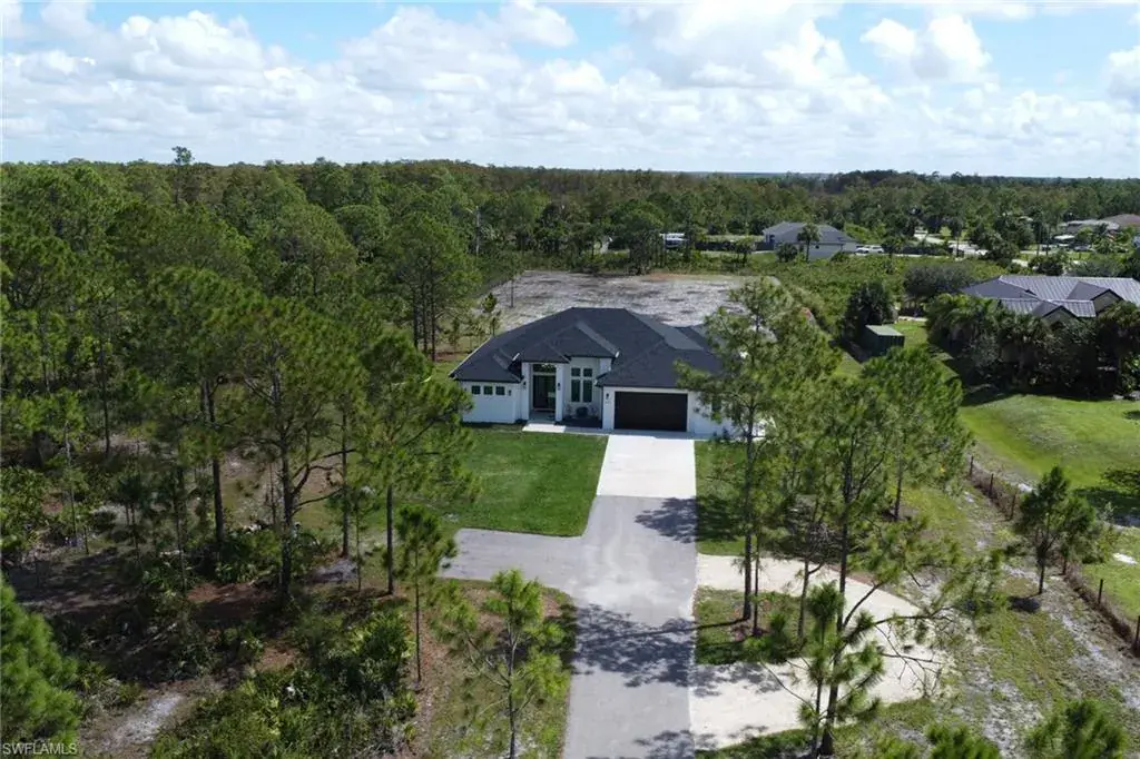 Welcome to this stunning custom built home offering the perfect blend of modern design, open space, and luxurious finishes all set on 2.34 acres of 100% uplands in one of the most desirable and rapidly growing areas of Naples, FL. With 3 bedrooms plus a den, 3 full bathrooms, and an oversized 2 car garage with an extended side, this home was thoughtfully designed for both comfort and style. Step inside to an inviting open concept floor plan highlighted by plank wood tile flooring throughout, volume and tray ceilings, and an abundance of natural light from impact resistant windows and zero corner sliding glass doors that fully open to bring the outdoors in. The seamless flow between living, dining, and kitchen areas creates an ideal setting for both everyday living and entertaining. The chef inspired kitchen is the centerpiece of the home, featuring custom white shaker cabinetry with soft close drawers, quartz countertops, a spacious center island with waterfall edge, modern black fixtures, and designer pendant lighting. Top of the line stainless steel appliances, including double wall ovens, complete this elegant and highly functional space. The owner’s suite offers a peaceful retreat with spa like luxury. The en suite bathroom features dual vanities, a large walk in shower, and high end finishes throughout. Two additional bedrooms and a den provide flexible space for guests, a home office, or a hobby room. Enjoy peace of mind and convenience with a whole home reverse osmosis system, fully fenced and gated property, and impact rated construction throughout. The back portion of the property is completely cleared, offering a blank canvas for your dream pool, guest house, barn, or expansive outdoor living area. With 100% uplands, every inch of the property is usable and ready for your vision. This home captures the essence of refined Naples living a perfect combination of modern architecture, quality craftsmanship, and open acreage with limitless potential. All this while being just minutes away from shopping, dining, schools, and the beautiful Gulf Coast beaches that make Naples one of Florida’s most sought after destinations. Experience elegance, space, and privacy this exceptional property offers it all.