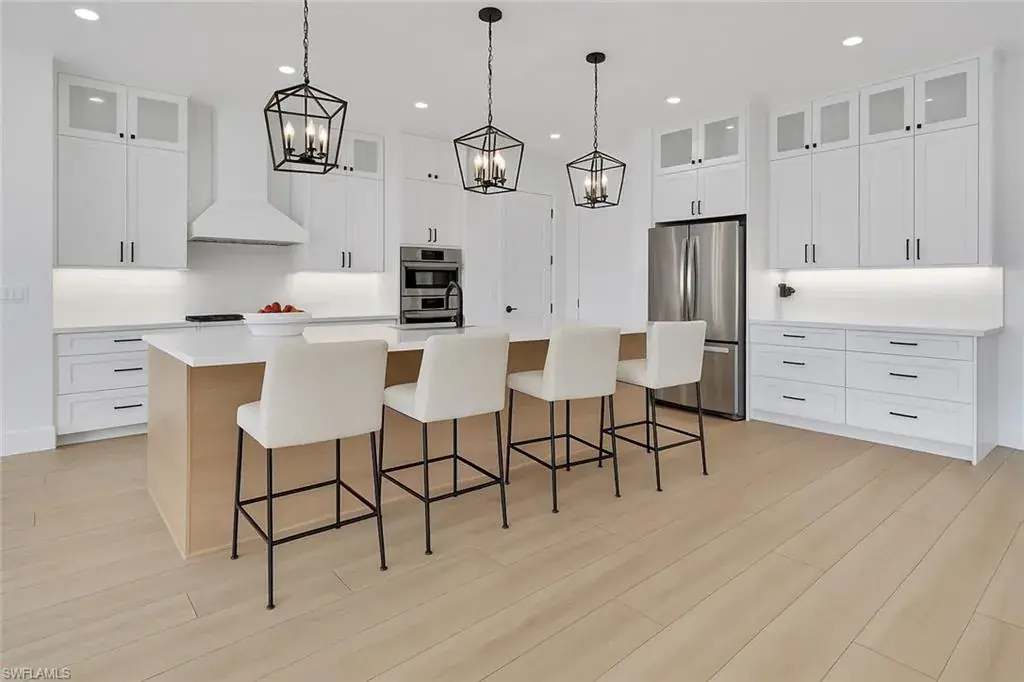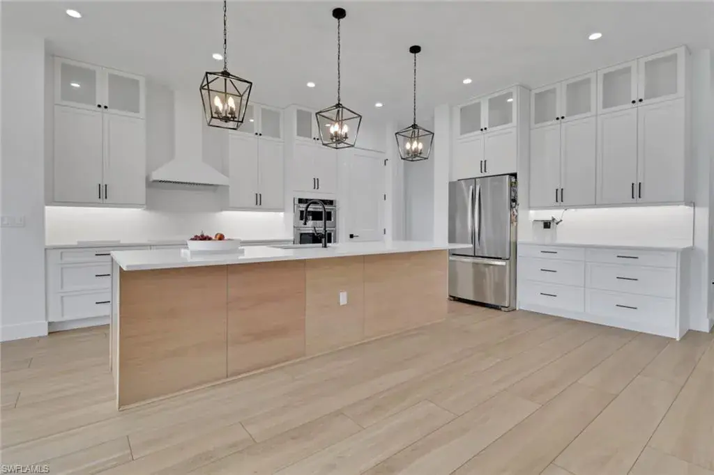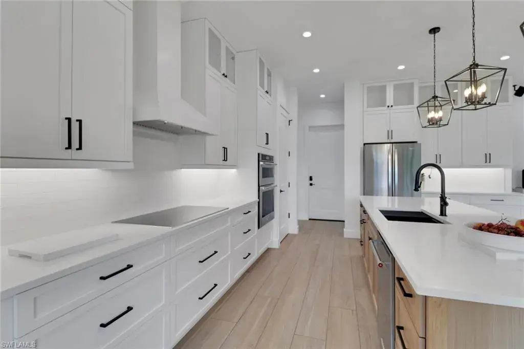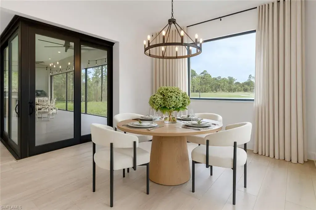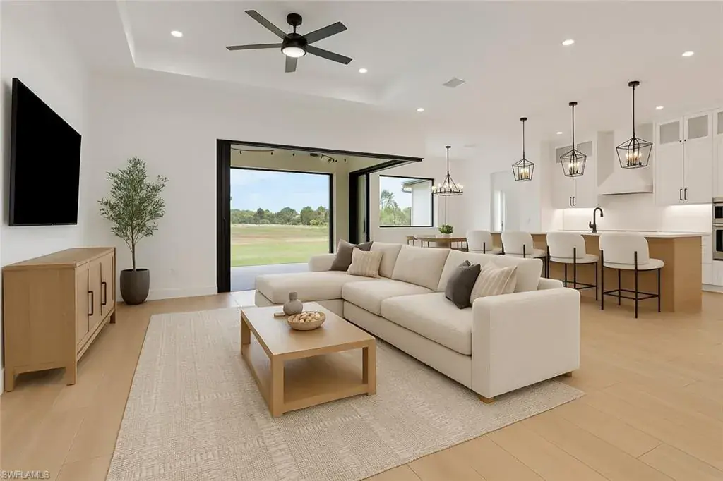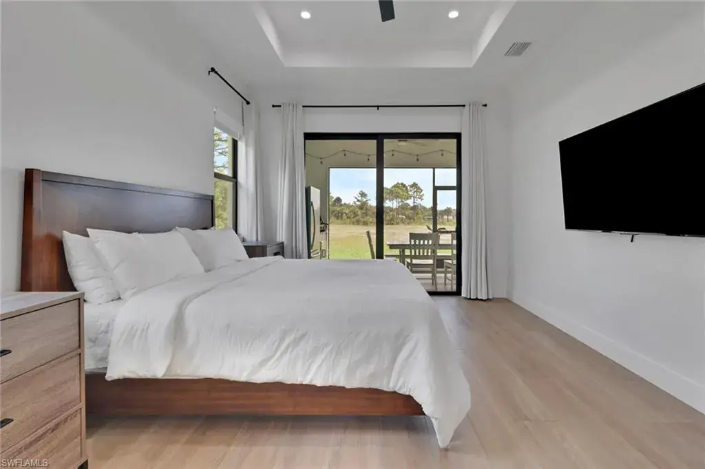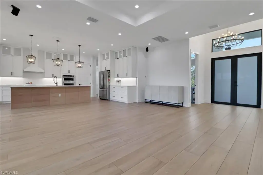 Welcome to this stunning custom built home offering the perfect blend of modern design, open space, and luxurious finishes all set on 2.34 acres of 100% uplands in one of the most desirable and rapidly growing areas of Naples, FL. With 3 bedrooms plus a den, 3 full bathrooms, and an oversized 2 car garage with an extended side, this home was thoughtfully designed for both comfort and style. Step inside to an inviting open concept floor plan highlighted by plank wood tile flooring throughout, volume and tray ceilings, and an abundance of natural light from impact resistant windows and zero corner sliding glass doors that fully open to bring the outdoors in. The seamless flow between living, dining, and kitchen areas creates an ideal setting for both everyday living and entertaining. The chef inspired kitchen is the centerpiece of the home, featuring custom white shaker cabinetry with soft close drawers, quartz countertops, a spacious center island with waterfall edge, modern black fixtures, and designer pendant lighting. Top of the line stainless steel appliances, including double wall ovens, complete this elegant and highly functional space. The owner’s suite offers a peaceful retreat with spa like luxury. The en suite bathroom features dual vanities, a large walk in shower, and high end finishes throughout. Two additional bedrooms and a den provide flexible space for guests, a home office, or a hobby room. Enjoy peace of mind and convenience with a whole home reverse osmosis system, fully fenced and gated property, and impact rated construction throughout. The back portion of the property is completely cleared, offering a blank canvas for your dream pool, guest house, barn, or expansive outdoor living area. With 100% uplands, every inch of the property is usable and ready for your vision. This home captures the essence of refined Naples living a perfect combination of modern architecture, quality craftsmanship, and open acreage with limitless potential. All this while being just minutes away from shopping, dining, schools, and the beautiful Gulf Coast beaches that make Naples one of Florida’s most sought after destinations. Experience elegance, space, and privacy this exceptional property offers it all.