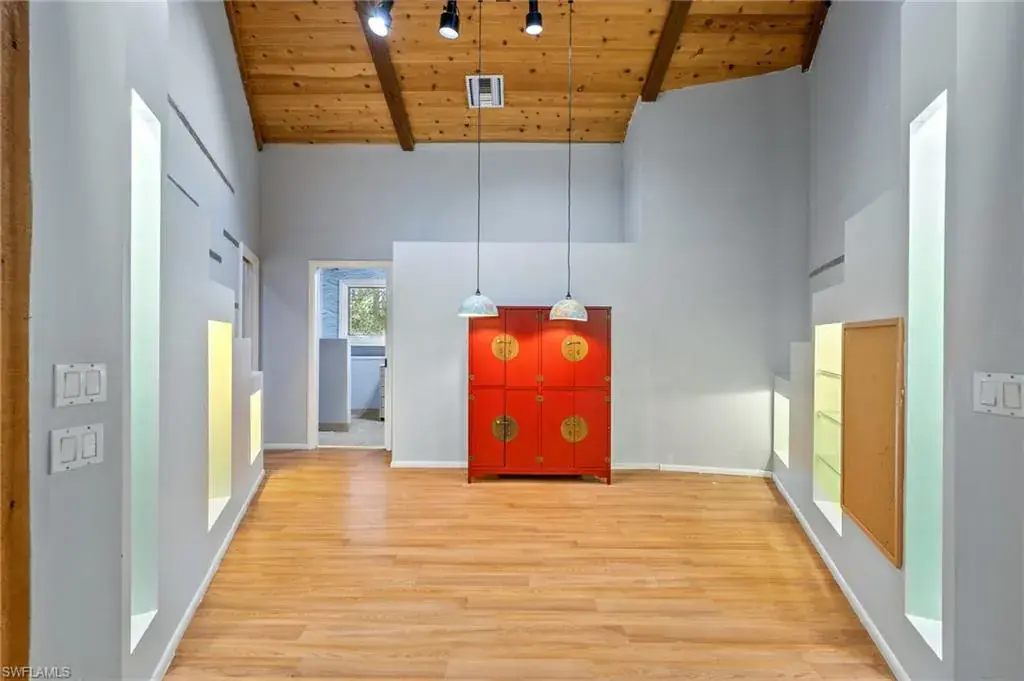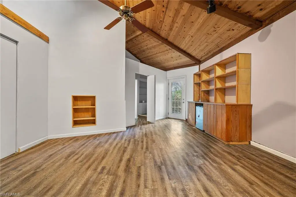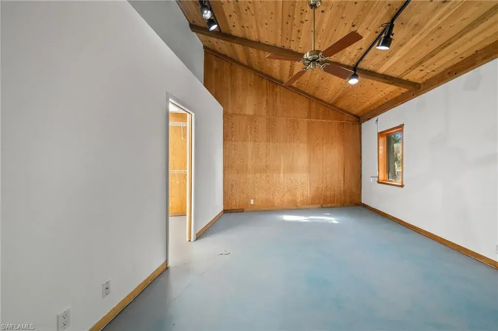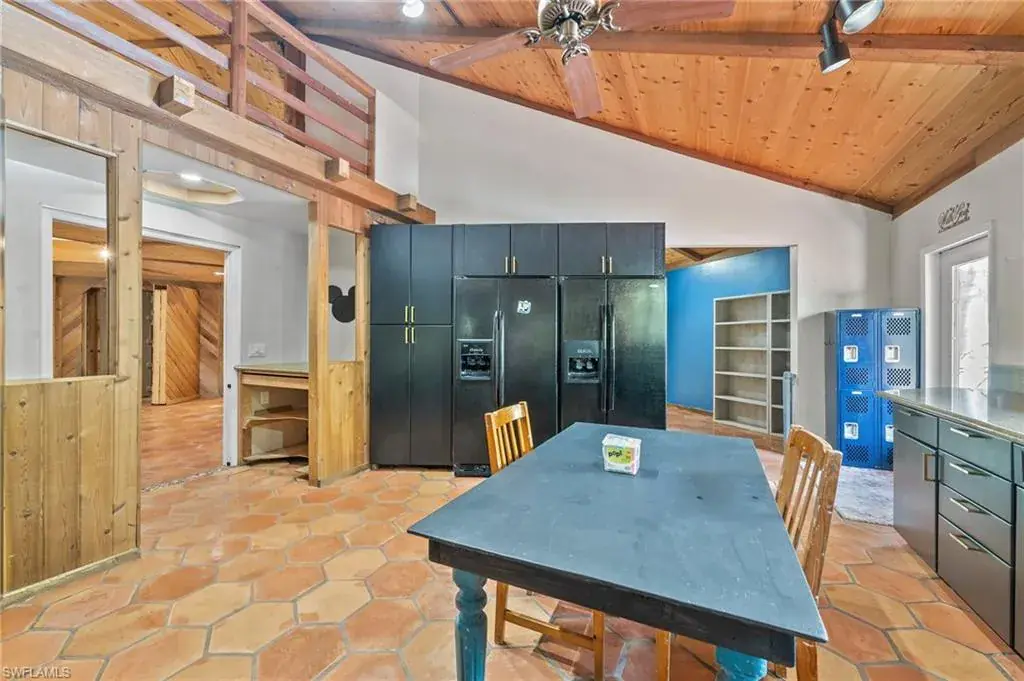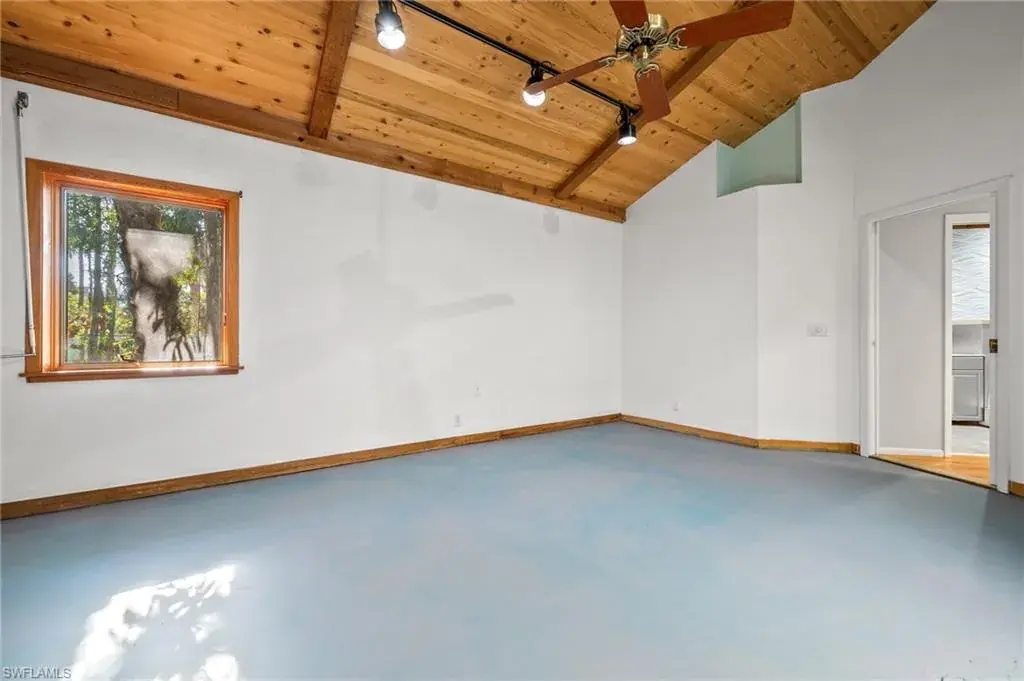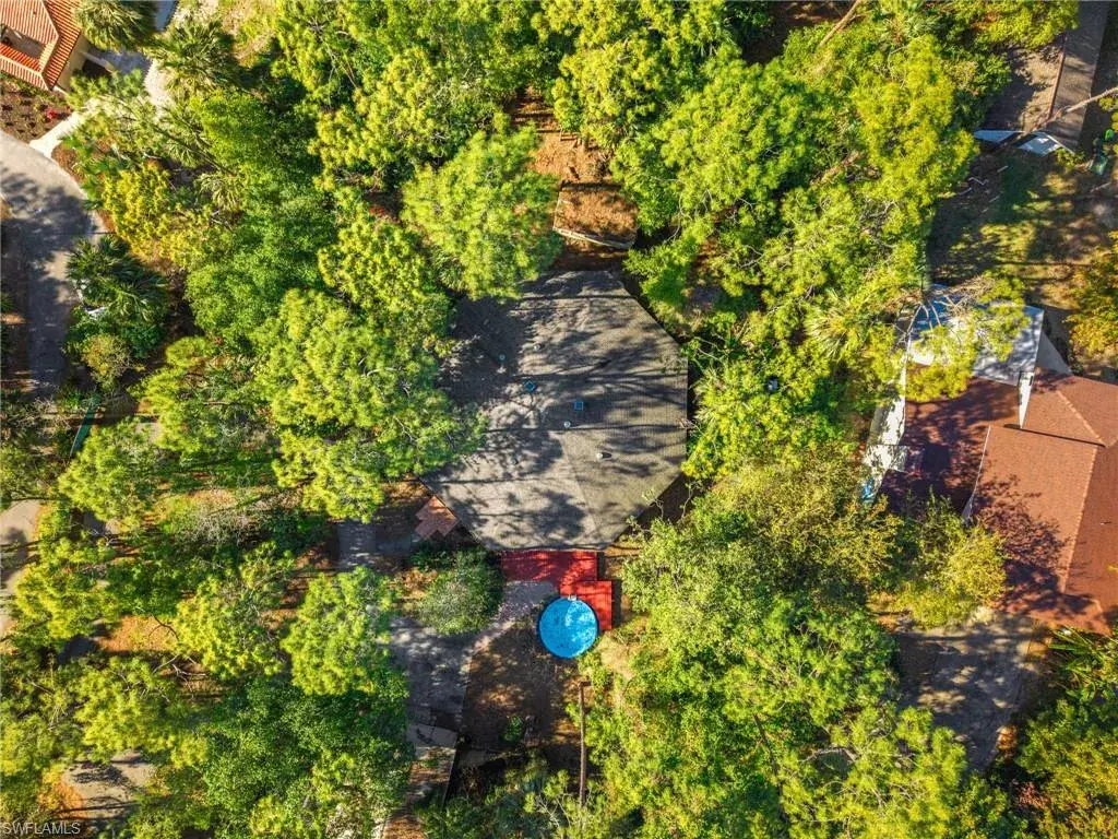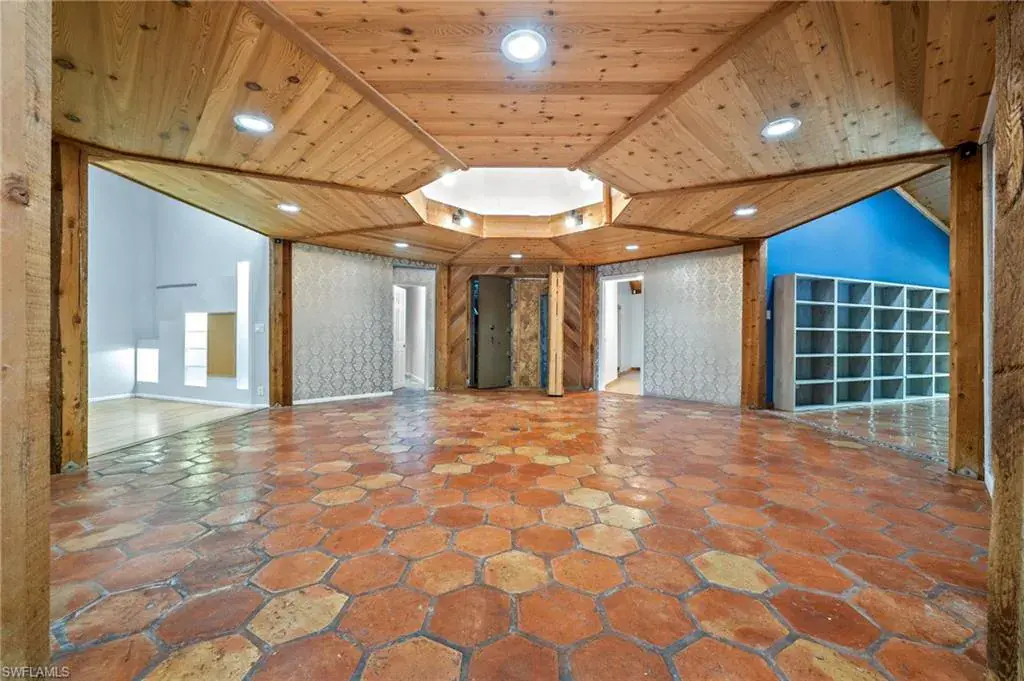 Calling all Artists, Collectors and Visionaries… You found it! Definitely not a boring cookie cutter home. Mid Century Modern meets rustic lodge architecture. Discover the charm of this exceptional Hogan Dwelling, perfectly nestled on a tranquil 2.5 acre wooded lot. This distinctive octagonal home offers endless possibilities with its thoughtful design and harmonious connection to nature. Set back on private lot with circular asphalt drive and constructed with reinforced steel rebar and block, this residence boasts a newer low-pitch roof and hurricane roll-down shutters. Once you step inside, you’ll find beautiful cypress and cedar wood throughout, complemented by mexican tile flooring, tongue and groove ceiling with exposed wooden beams and skylights for additional ambiance. Spacious chefs kitchen includes double refrigerators and a butlers bar. Flowing floor plan with large dining area perfect for entertaining and also the central hub of the home. A very unique 250 ft walk-in steel vault/safe room is perfect for displaying art, collectibles or even utilizing it as a media room or theater. A focal tree branch and wood staircase leads to the second-floor loft which offers additional space and living options. Lots of space to add additional bedrooms. Entire home complimented with reverse osmosis water filtration system, tankless hot water heater and newer A/C. Relax on the open wooden deck with above ground pool overlooking the private wooded lot with plenty of room to build or expand. Bonus 24X40 steel outbuilding offering endless options. Perfect for a car collection, boat or other toys. Conveniently located near I-75, excellent schools, shopping and close proximity to The Paradise Sports Complex. *Special Renovation Financing Available!